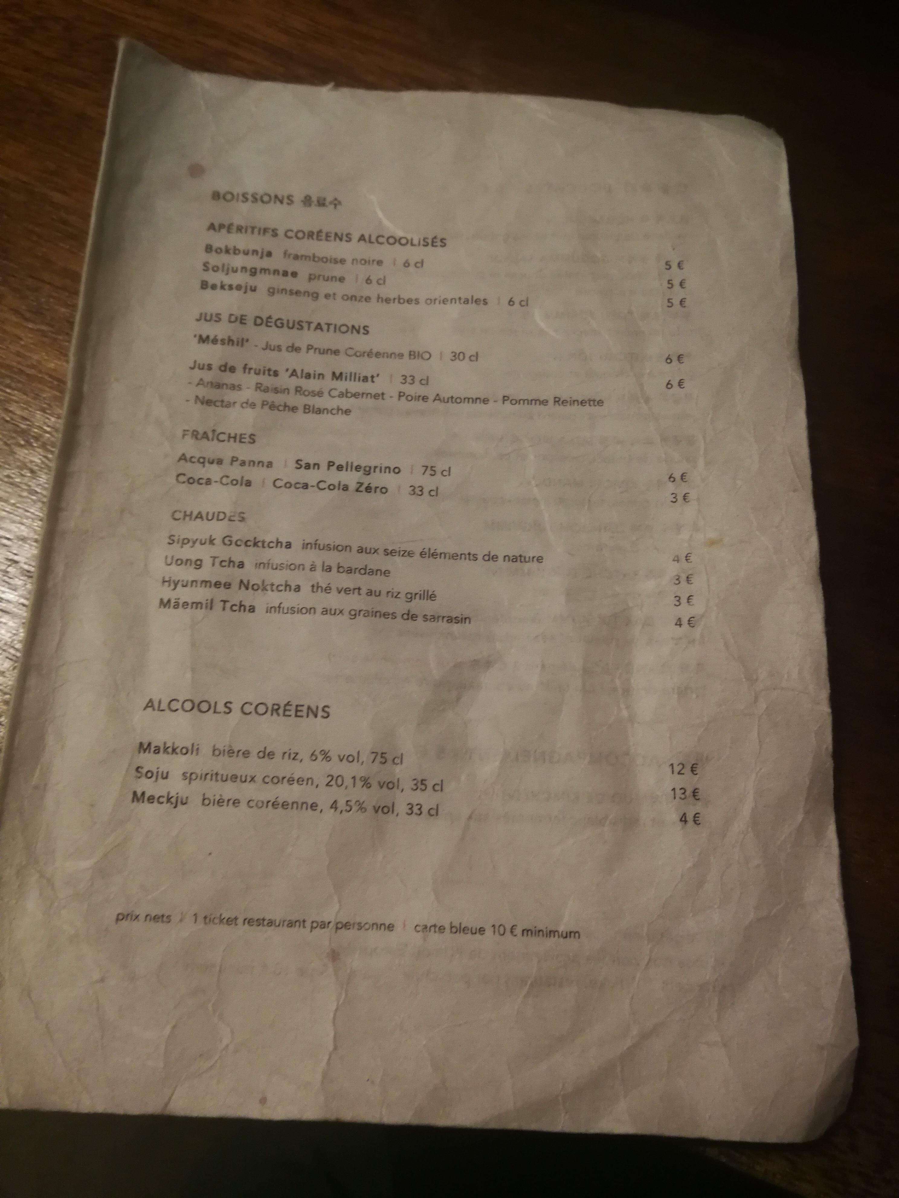 Impression que les clients sont abusés sur la cuisine coréenne servies en raison de la mode. Le goût de différents plats est du niveau d'une cantine ou un resto pas cher à Séoul donc un mauvais rapport qualité/prix. La présentation des plats est plutôt grossière, voire sans lien avec le nom en coréen. Service un peu folklorique et pressé, retrait d'un plat avant de l'avoir fini. Par ailleurs, aucun sens du service clientèle par une prétention affiché du responsable qui ne tient aucun compte des remarques des clients et les considère comme des idiots. Qualité des plats et du service en très large retrait par rapport aux années précédentes... Peut-être pour découvrir rapidement un peu la cuisine coréenne pour le déjeuner. A éviter pour le dîner. Il y a aujourd'hui beaucoup d'autres meilleurs restaurants coréen à Paris. Profite de son emplacement de façon indue. Ne mérite pas ses recommandations dont sa présence dans les Bib Michelin et autres. Plutôt à éviter. De plus les modes de paiement ne sont pas affichés comme l'exige la réglementation.