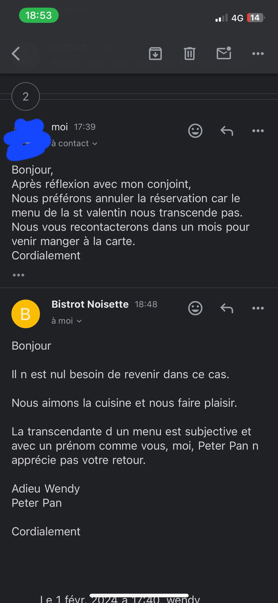 Je n'ai pas l'habitude de faire ce genre de post mais vu la délicatesse et la gentillesse des hôtes je me permet celui-ci. Je crois qu'il n'y a pas besoin d'epiloguer longtemps mais simplement de regarder la photo. A la recherche d'un restaurant sympa dans le coin pour la St Valentin, nous avons contacté ce restaurant qui nous semblait plutôt agréable pour cet événement. Au vu du menu présenté quelques jours après notre réservation et n'étant pas vraiment à notre goût, ma compagne et moi-même décidons de revenir sur notre réservation en restant évidement aimable et courtois et en gardant en tête l'adresse pour une autre occasion. Je vous laisse découvrir la sympatique réponse des propriétaires. Cordialement.