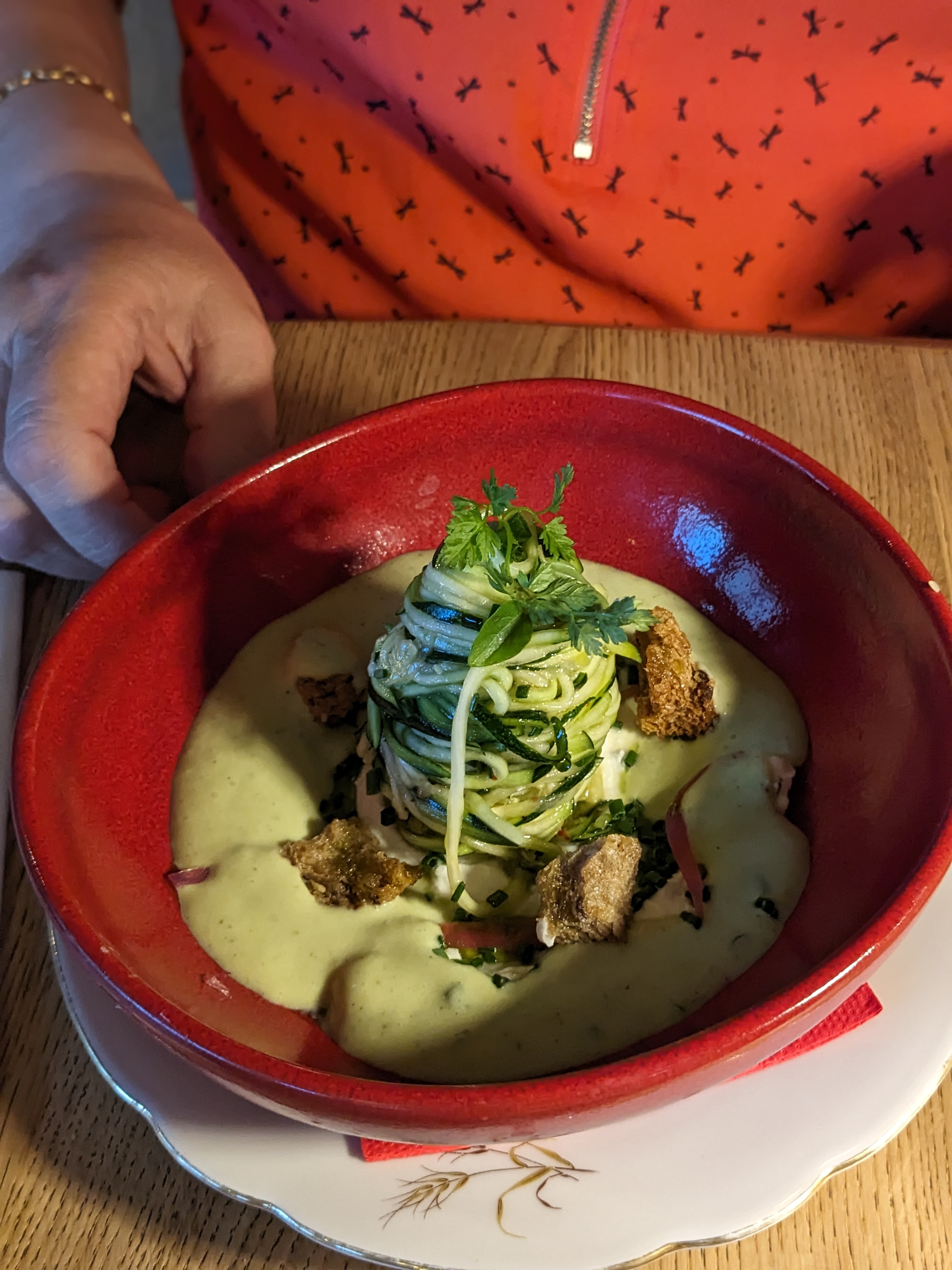 Simple et bon, un peu moins fan de l'entrée courgette mais le plat principal était à tomber Service impeccable Cadre agréable, jolie vue