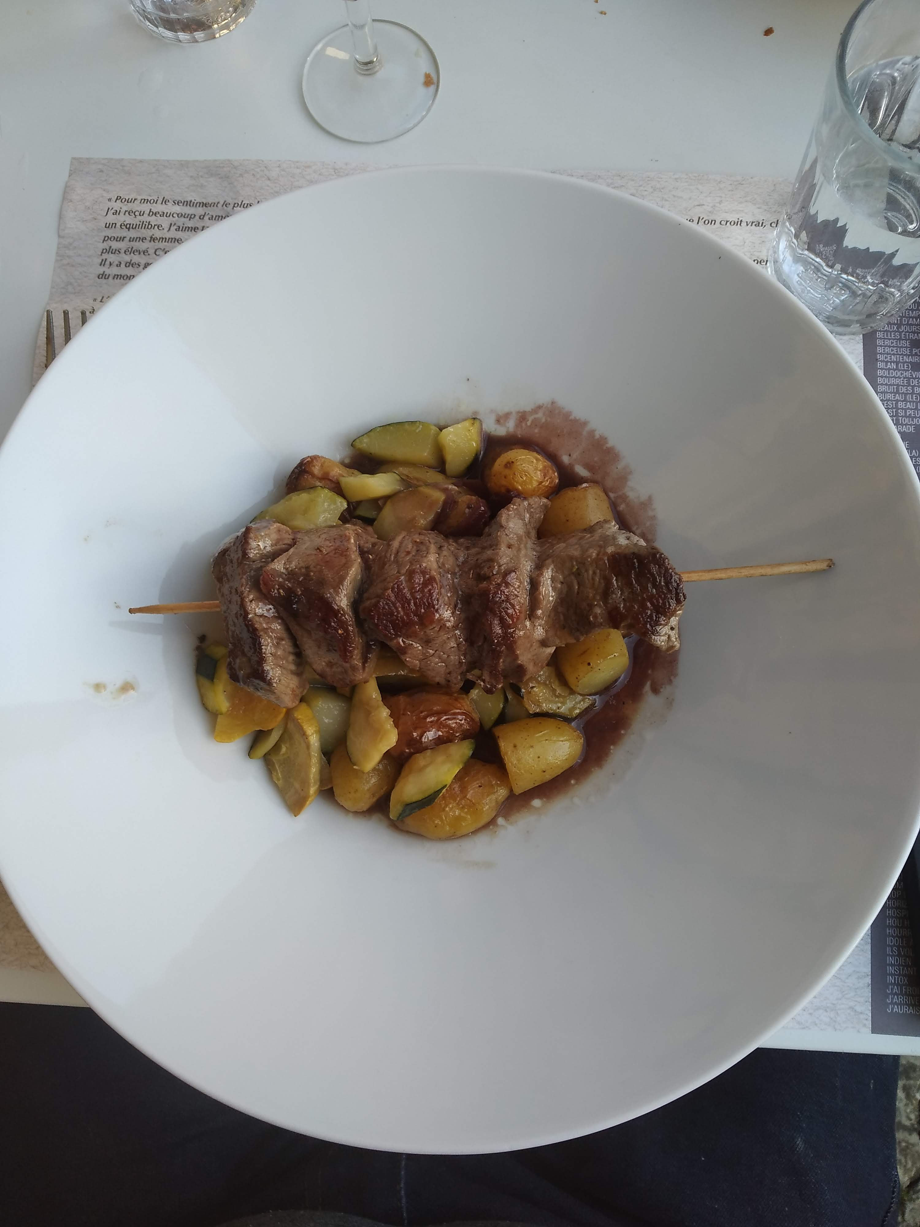 Cadre sympa. Vue sur une agréable place où quelques personnes jouaient à la pétanque. Plat principal : la brochette de bœuf (20 €) était savoureuse et suffisante comme plat principal. Desserts « Assiette fromagère » et « Fraise 《Comme Un Tiramisu》 ». Le plateau de fromages était composé de trois très petits morceaux de fromage avec un morceau de baguette (6,50 €). C'était très cher pour ce que c'était. Le dessert Fraise (6 €) était correct, portion de dessert normale.