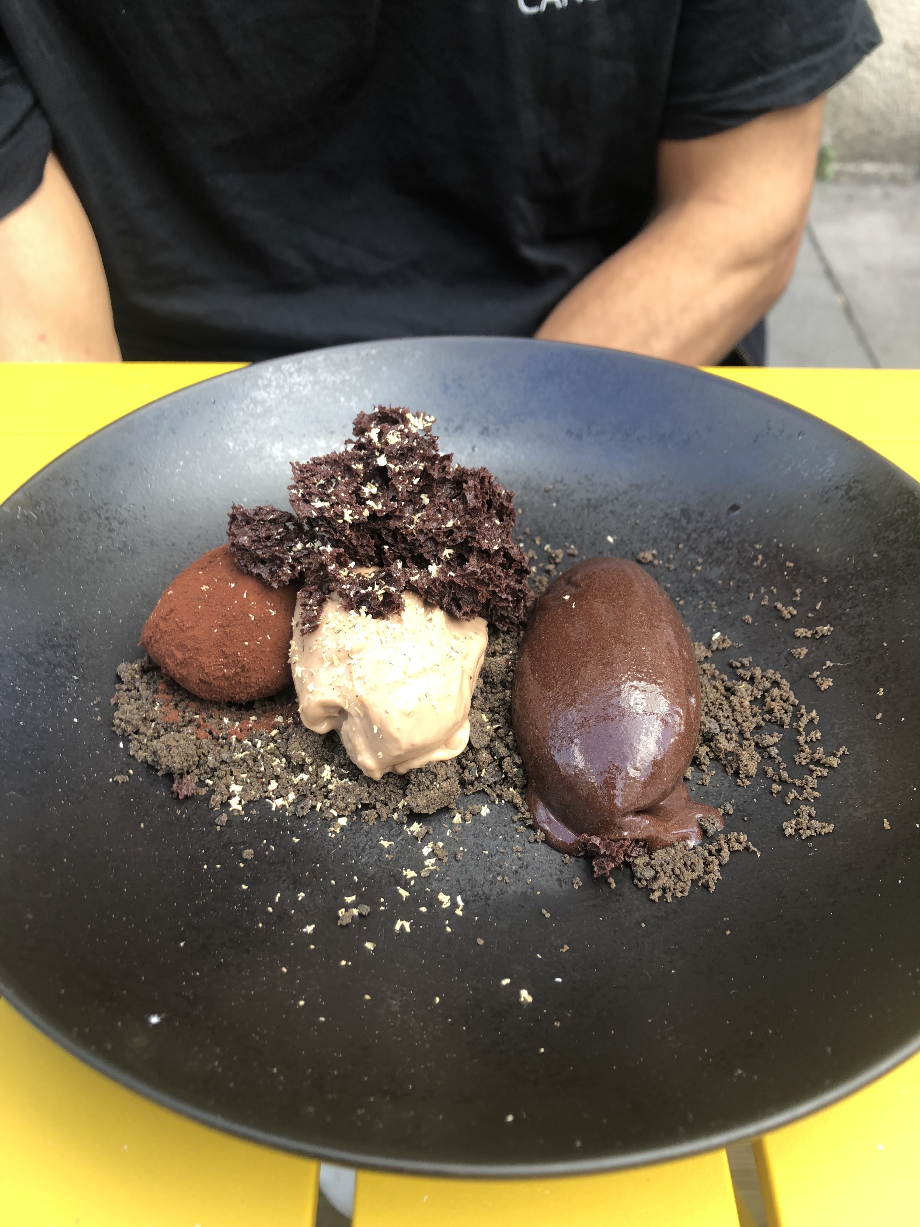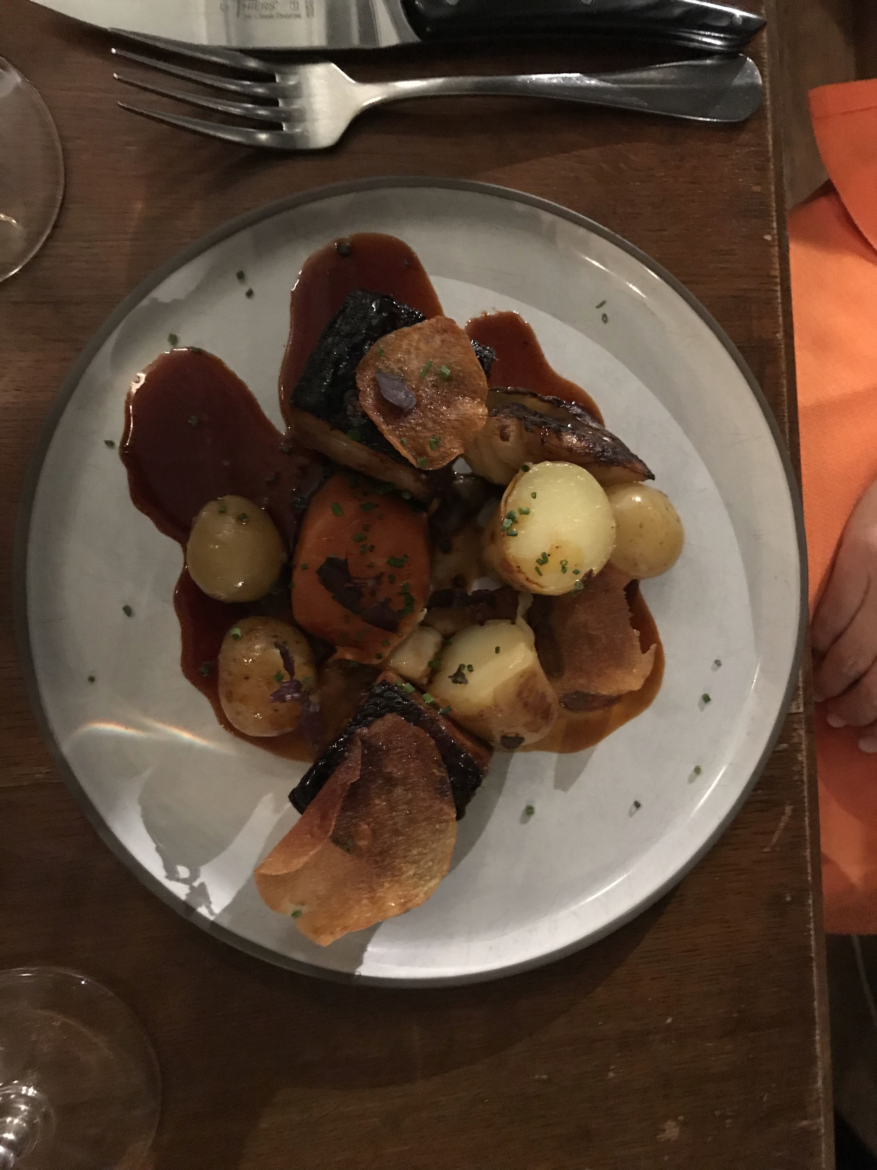 Arrivé sans réservation… à l’arrache, nous avons été très bien reçu, un très bon point. Le repas… « juste » très bien.. que dire de plus!! Une fougasse au thym et son poulpe, un croustillant de poitrine de cochon et des carottes glacées, cumin artichauts et pesto de fanes, suivi d’un dessert excellent : le Namelaka.. de quoi rendre encore plus addict les addict de chocolat !! On recommande donc …!!!