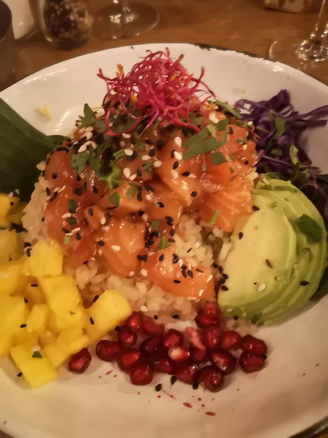 Cuisine fraîche, équilibrée (poisson, agrumes, poke bowl etc..) dans un cadre dépaysant avec vu sur les berges du Lez.