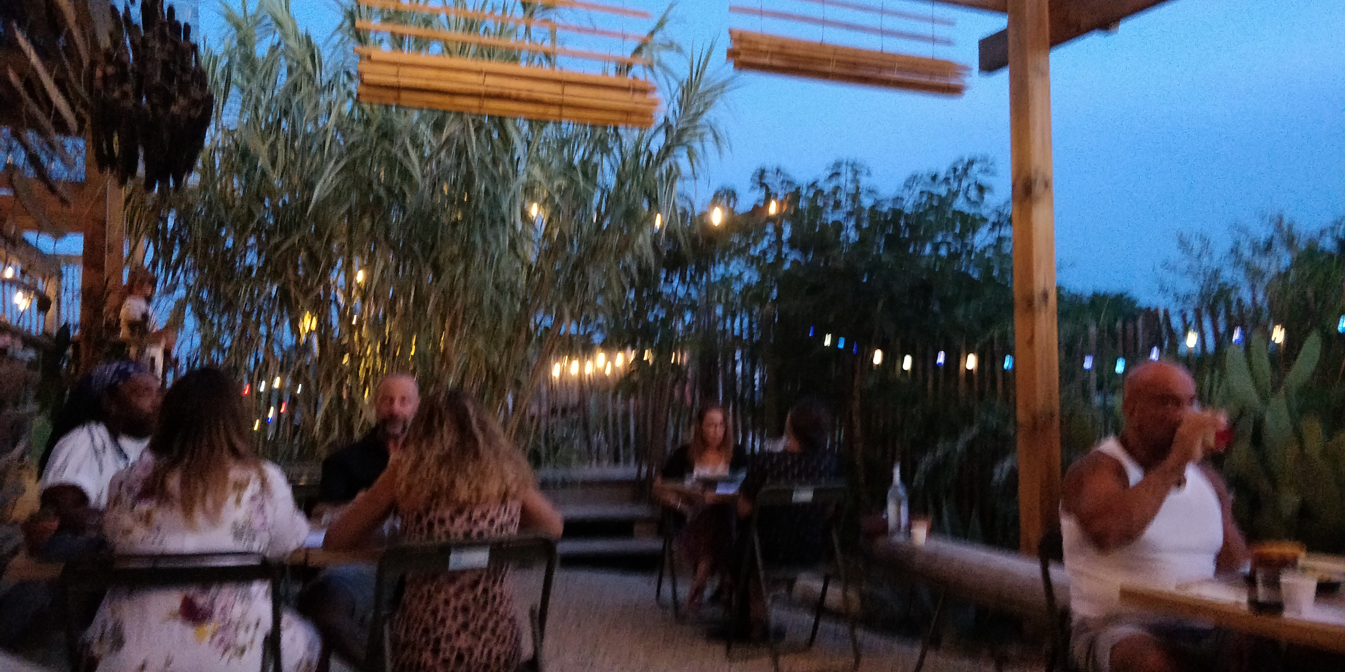Mangé à midi, pris un Spritz classique et un cocktail la mule, goûteux et bon. Par la suite, nous avons mangé le plat a base de poivrons, qui manquait de goût (assaisonnement ??) ainsi que le plat avec le thon cru et le lait de coco, particulièrement savoureux. A noter que la terrasse a un coin fumeur et non fumeur.