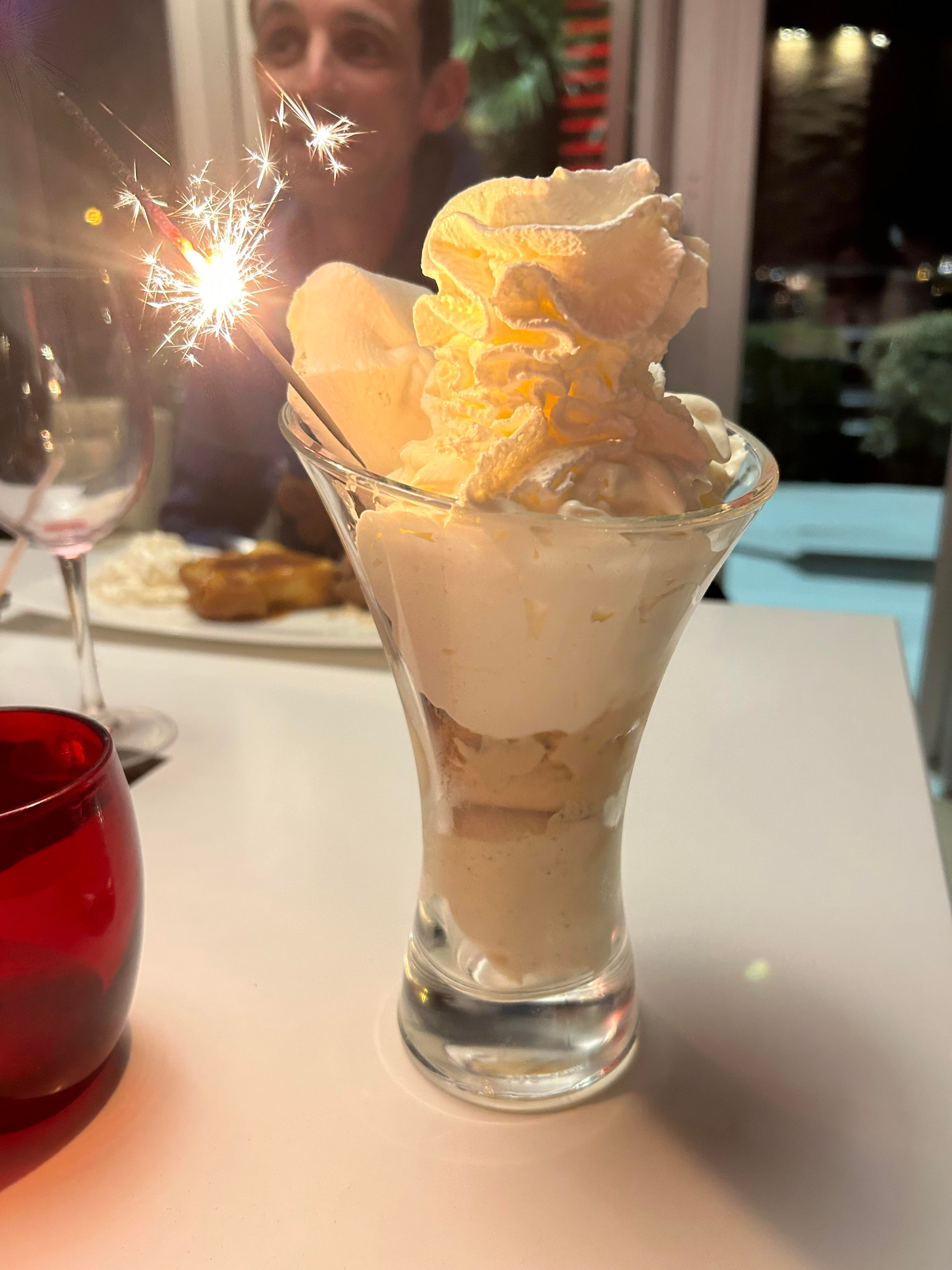 Petite astuce de client avisé, évitez la spécialité locale, le café Rupin parfois appelé Café gourmand dans les restaurants. Nous avons eu le droit à une coupole de compote type andros, compté facilement trois cuillères, une sorte de mousse à la coco industrielle et une madeleine tellement sèche qu'elle en était croquante spécialité du restaurant peut être ? La blague, si ça en est une, a du mal à passer. Nous ne reviendrons pas.