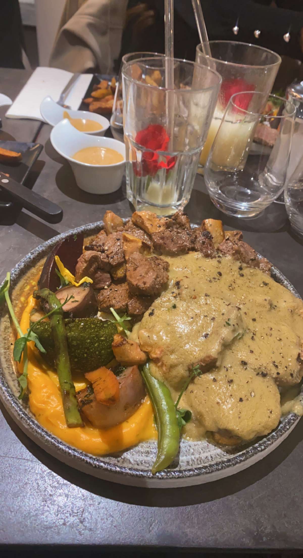 Nous avons pris deux filets de bœuf, avec légumes et gratins, excellents! Les aliments sont de qualité, le service depuis l'entree jusqu'aux équipes en salle 10/10. Dessert au top ! Merci beaucoup pour l'accueil nous avons passé une bonne soirée, très belle découverte ❤️ merci beaucoup a la responsable pour sa surprise pour mon anniversaire 🎉 on reviendra c'est sur !