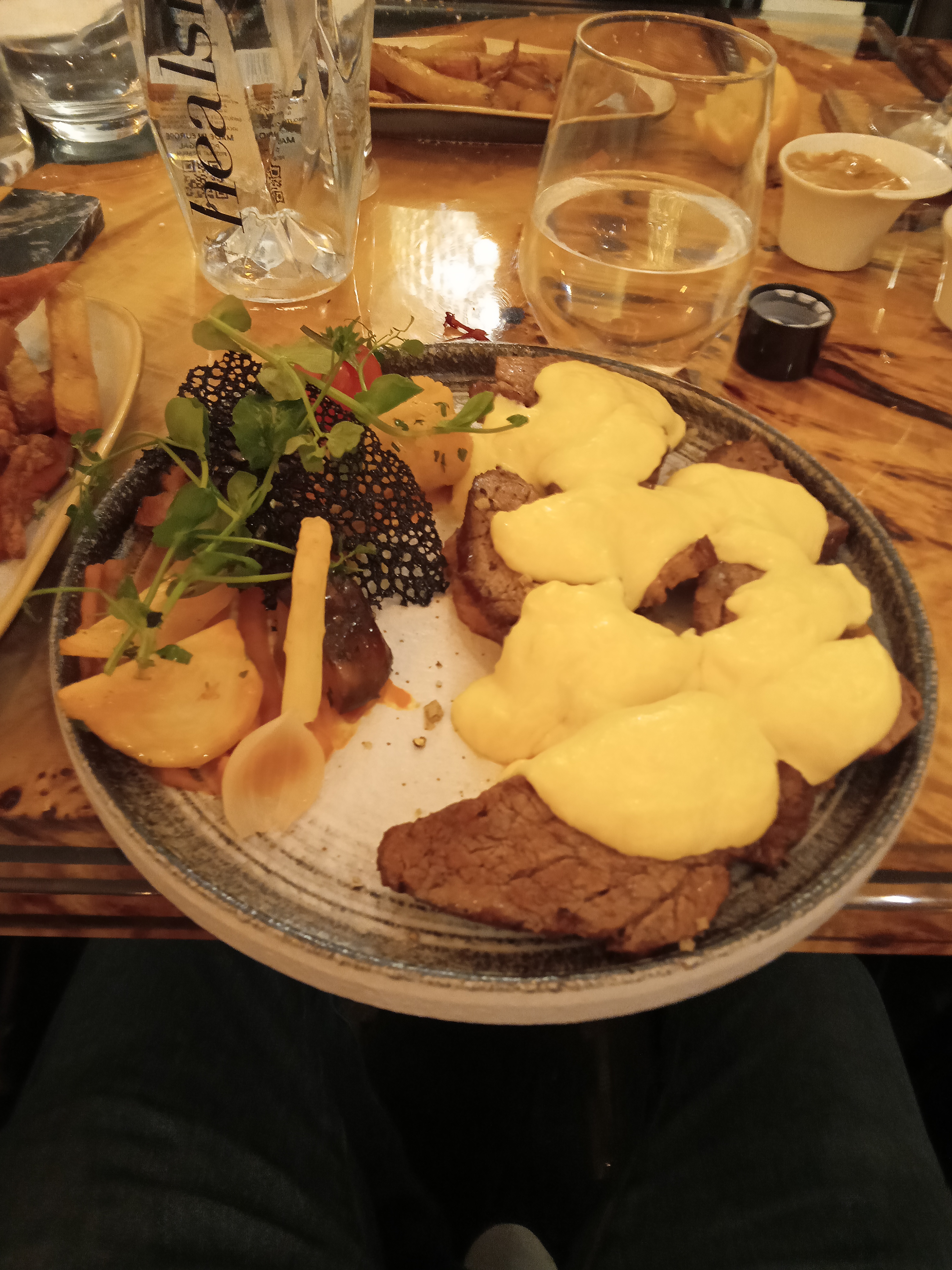Ce restaurant est superbe et vous devez l'essayer si vous visitez Montpellier. J'avais fait une réservation pour samedi soir mais ils ne l'ont pas trouvée (probablement de ma faute) mais ce n'était pas un problème, ils nous ont installés en bas. De la réception à la porte jusqu'au départ, le service était fantastique. Nous avons eu le fromage de bœuf noir. Gros morceau de filet de bœuf pour 3 personnes cuit à table. Notre serveur est arrivé avec le chariot puis a commencé à découper la viande, qui a ensuite été cuite dans du beurre sur le côté de la poêle, le pain a ensuite été cuit dans la même poêle, puis les petits légumes sont arrivés en assiette de la cuisine, Le bœuf et le pain ont ensuite été servis, puis théâtraux saupoudrés d'un choix de 3 sels et enfin terminés par la plus étonnante sauce au fromage Comte AOC. On nous a également servi des frites maison et des frites de patates douces. Sur la table également il y avait 3 sauces, poivre, roquefort et champignon. Ce restaurant ne sert pas d'alcool mais propose une grande variété de bières, de vins et de cocktails sans alcool, mais vous n'avez pas besoin d'alcool pour savourer un repas ici. Dans l’ensemble, c’est une expérience incroyable et dont nous nous souviendrons pour le reste de notre vie. Bravo à l'équipe de The Black Beef