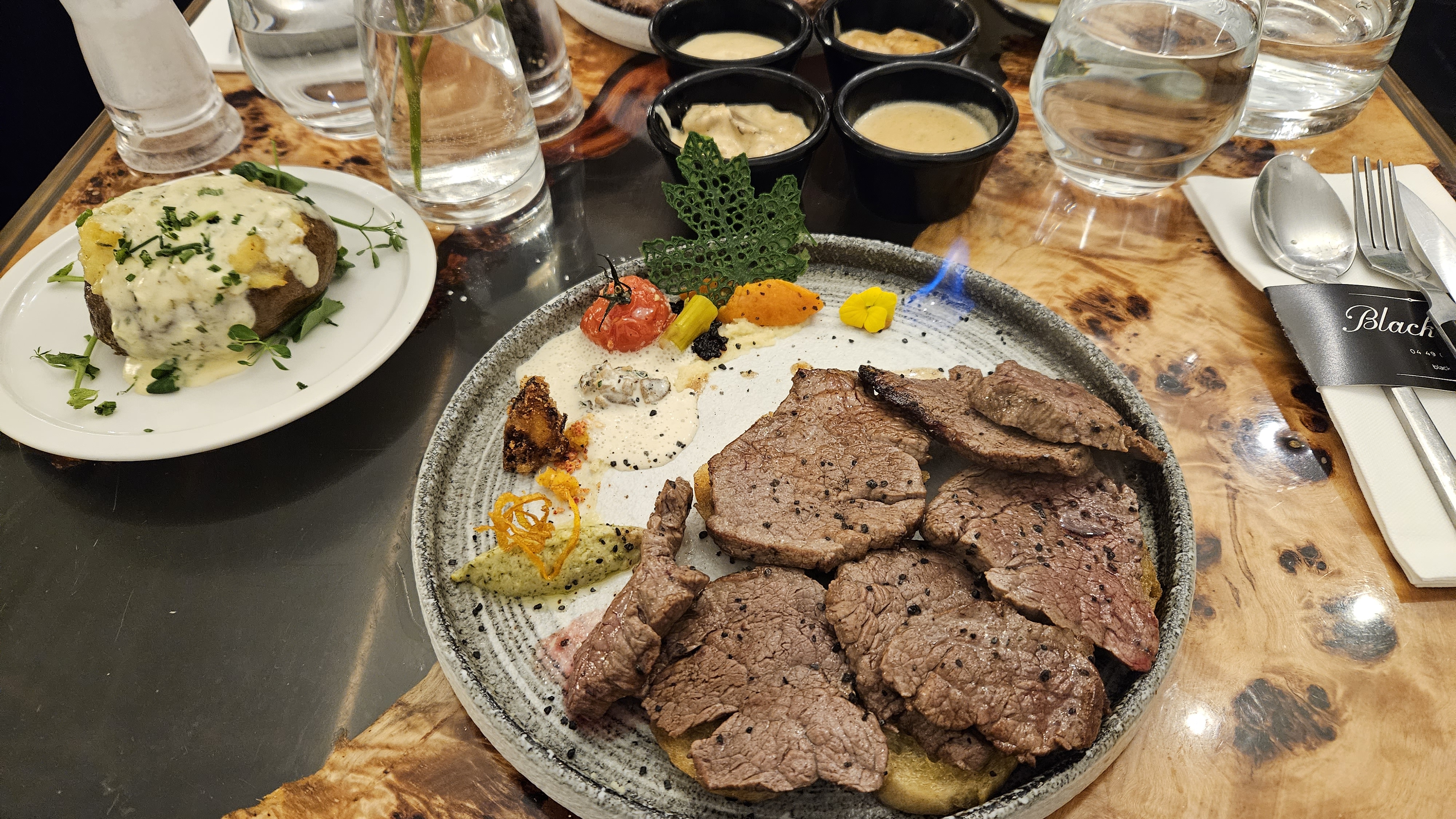 Un service parfait ; les serveuses et serveurs sont au petit soin et en prime avec le sourire. Le repas a été délicieux de l'entrée au dessert, ça faisait longtemps que je n'avais pas aussi bien mangé. D'autant, qu'il y a des produits tel que du chameau, de l'autruche, du cerf que je n'avais jamais goûté jusqu'à présent. Je ne regrette pas du tout et je compte bien y retourner. Merci au personnel du Black Beef !!! J'ai passé un agréable moment.