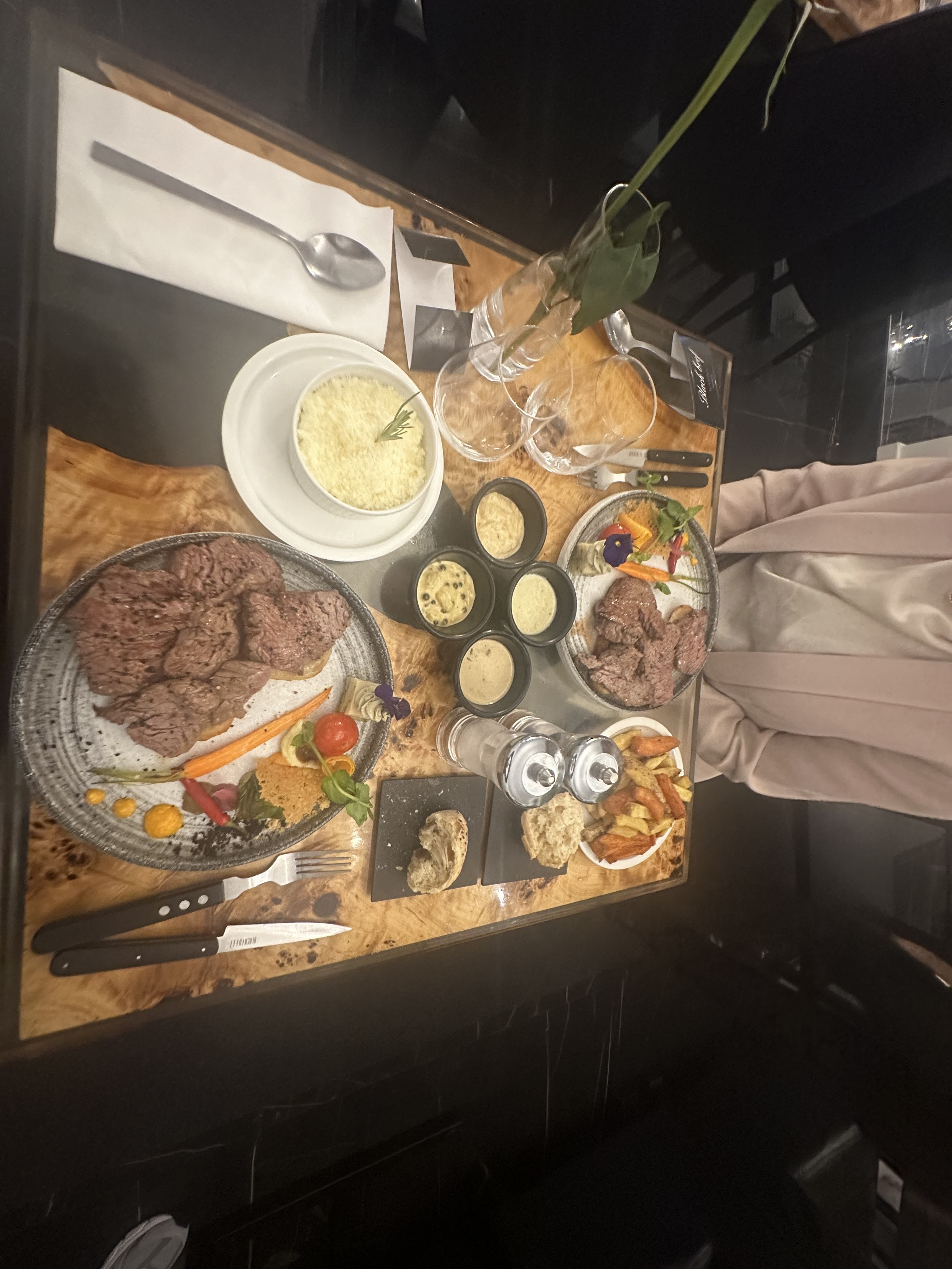 Alors j'étais un peu déçu car pour le prix je m'attendais à mangé des plat incroyable la viande pas terrible(à mon goût) trop de beur dans la viande j'ai pas détesté mais c'était pas non plus wahou pour 300 euros je trouve ça dommage ils auraient dû poussé le concept plus loin (salt bae) et trouver un cuisinier extra quitte à mettre le prix un peu plus cher je ne pense pas y retourné