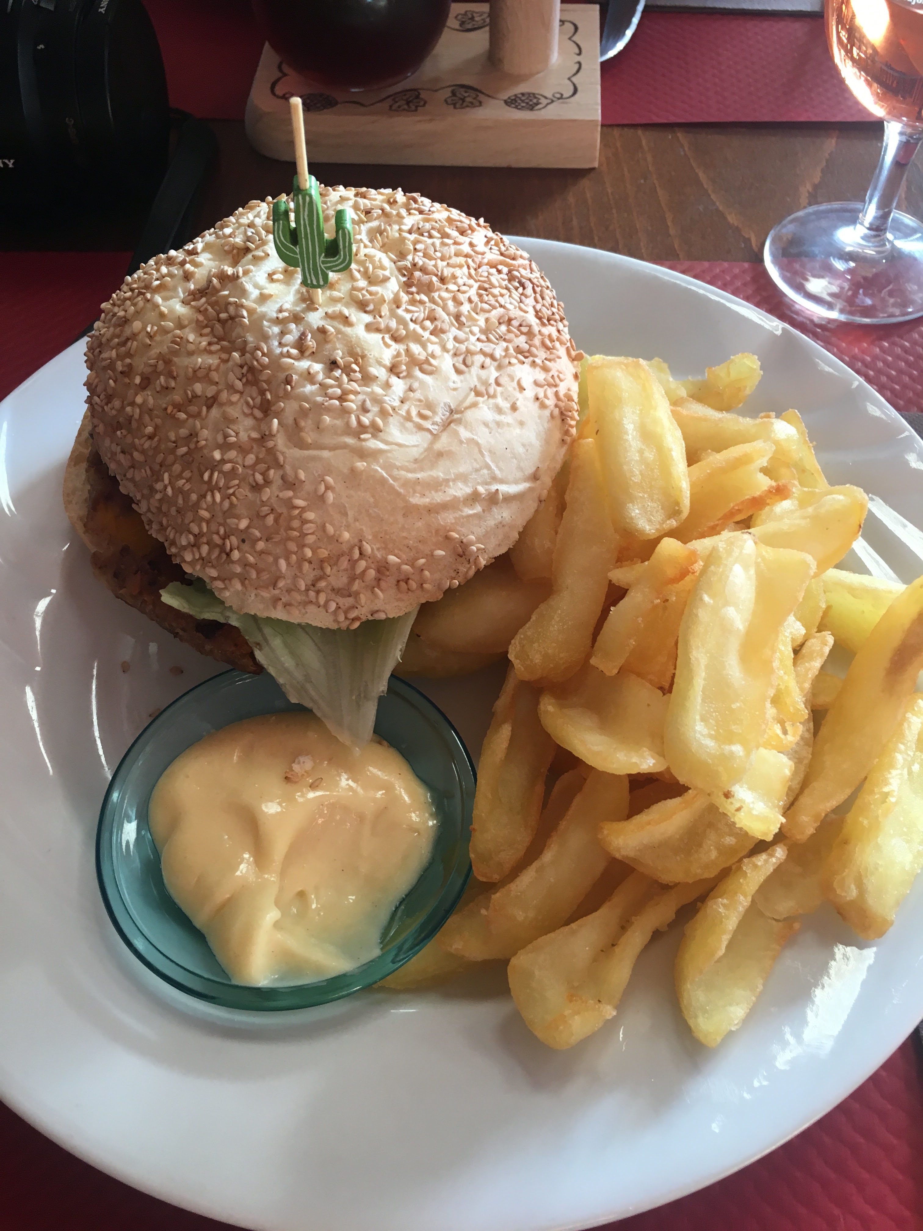 Ouvert depuis peu et pourtant l’organisation roule déjà bien Accueil chaleureux et service souriant tout au long du repas. Décoration atypique, tous les détails sont géniaux, musique de fond agréable. Les tables ne sont pas les unes sur les autres c’est super. La carte n’est pas à rallonge mais y a l’essentiel et c’est pas plus mal, il y a même le Burger végétarien ce qui est vraiment TOP car dans le coin peu de restaurant on fait l’effort En plus il est très bon, le « steak » est pas sec et harmonieux en goût (c’est pas toujours évident) une petite sauce et un peu plus de salade dedans aurait été TOP mais ça c’est une question de goût. Les frites huuum ! Le vin est à découvrir ! Rosé griotte très bon. Un bon choix de bière. Rapport qualité/quantité/prix top vraiment Il faisait très chaud, plan canicule en ce moment on ne peut pas leur en tenir rigueur, j’ai eu un bon coup de chaud ^^ On reviendra avec les potes