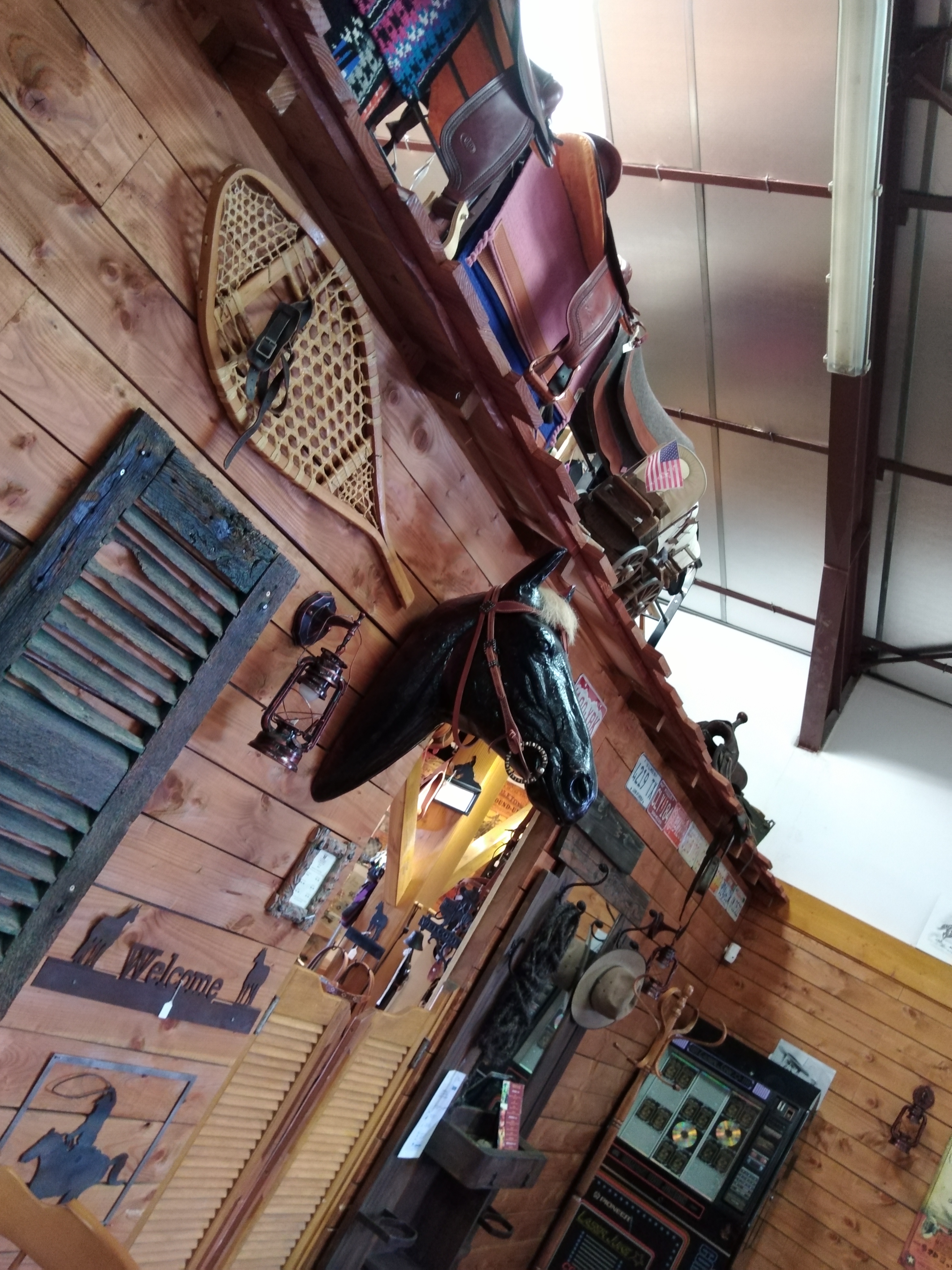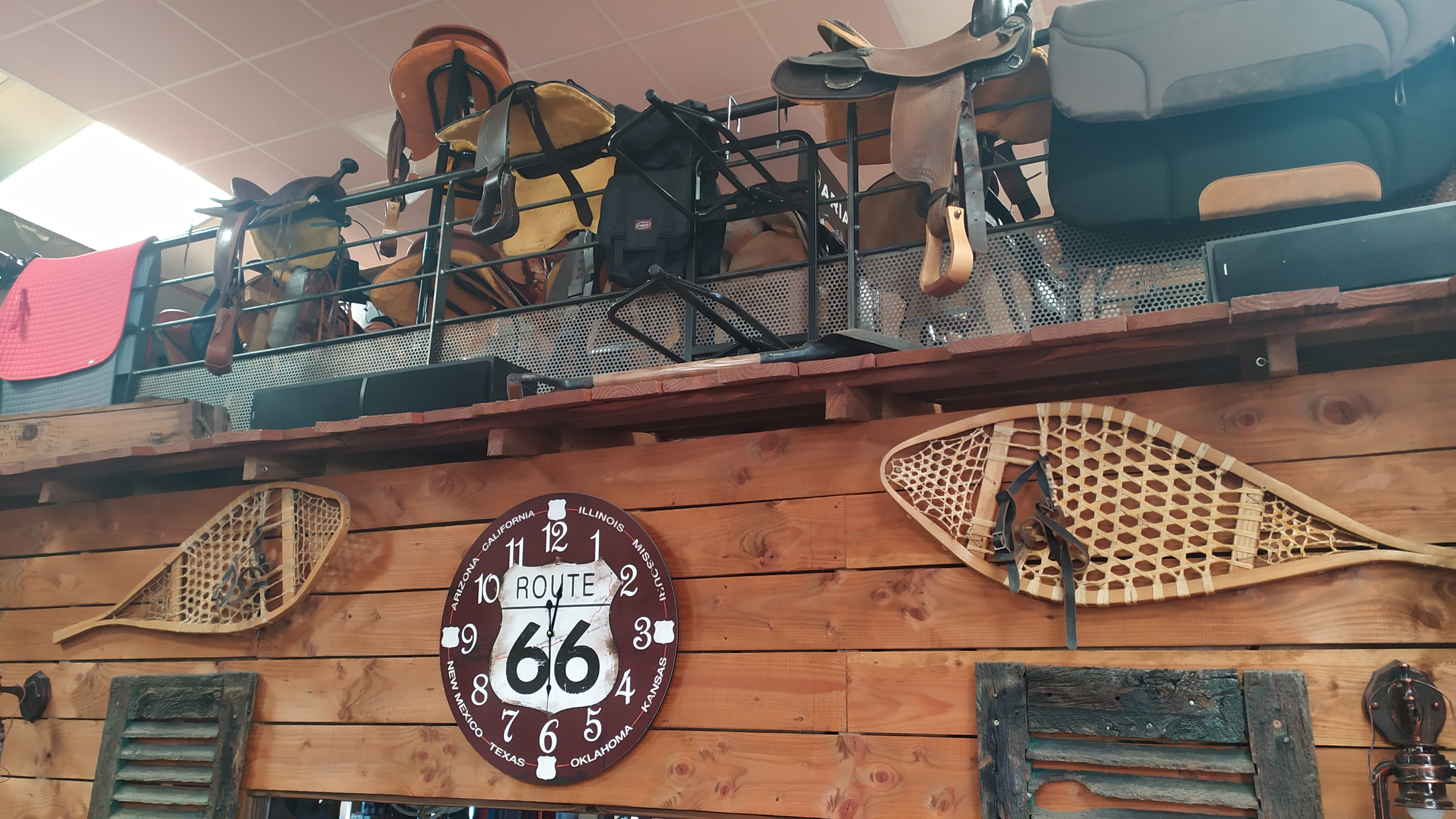 Décor typique western, et de plus boutique vendant des produits western également, santiags, selles de cheval, cache-poussière, chapeaux,....