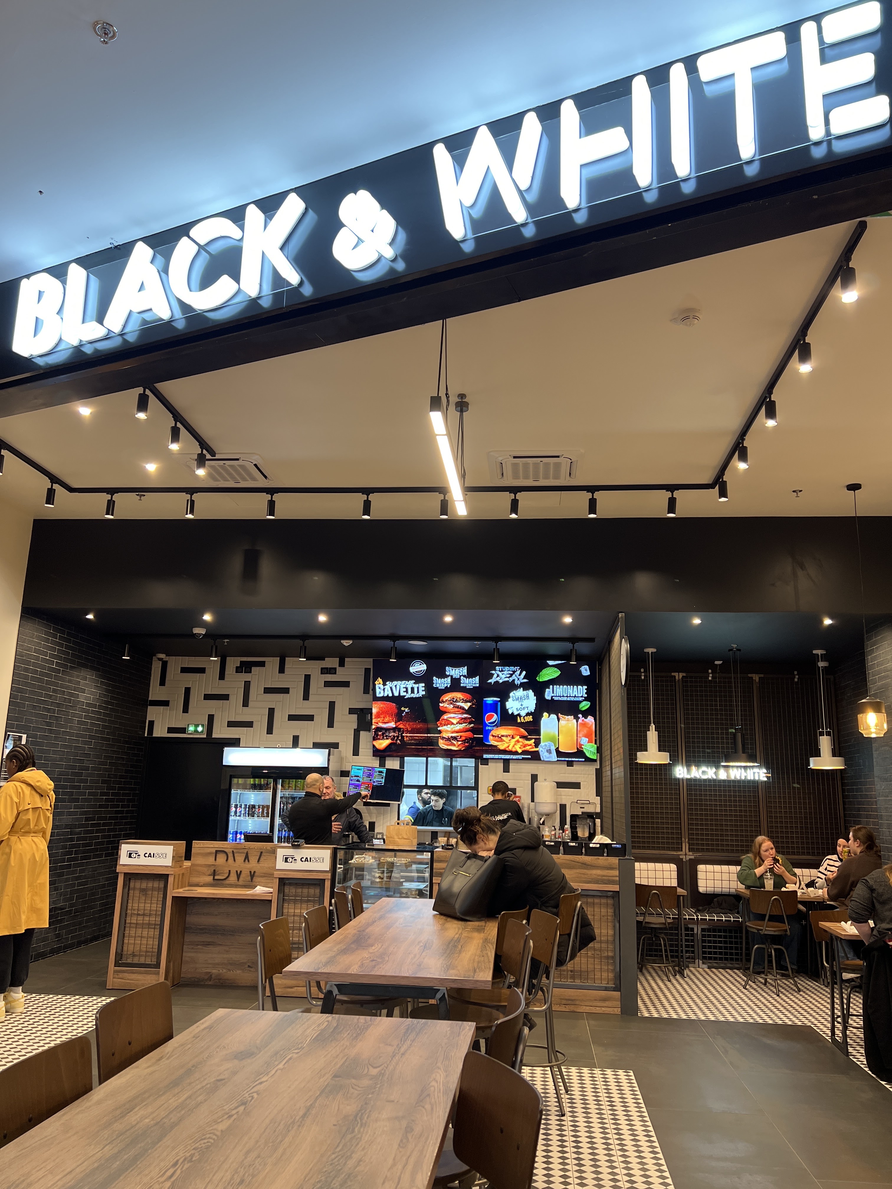 Un groupe de 4 copines, on a eu l'occasion de se retrouver pour manger à 12h fin décembre au black & white, pas beaucoup d'attente, propre, le service est aimable et souriant par la jeune fille à la caisse, le repas chaud et bon, le tout à un bon prix. Nous avons vu des enfants et des jeunes mais aussi des couples et familles, il est apprécié peu importe l'âge.