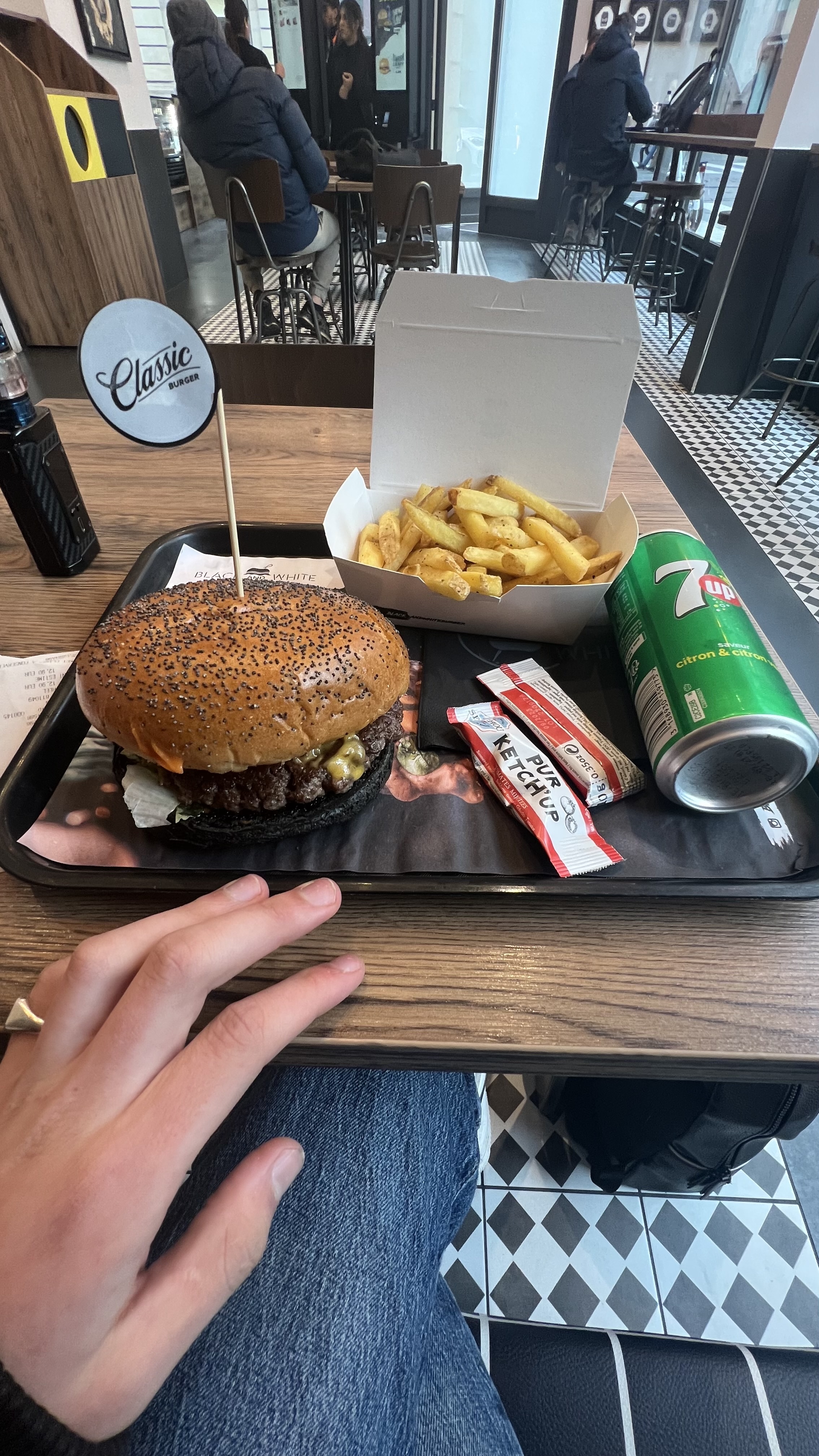 Je recommande pas cette endroit. La viande était cru, il n’y avait plus de frites à seulement 12h50 donc pas le choix de prendre des frites de patate douce qui était encore à moitié congelé. Les serveuses étaient nonchalante, et agressive. Rien à voir avec les Black & White que j’ai pu tester dans d’autres ville c’est dommage