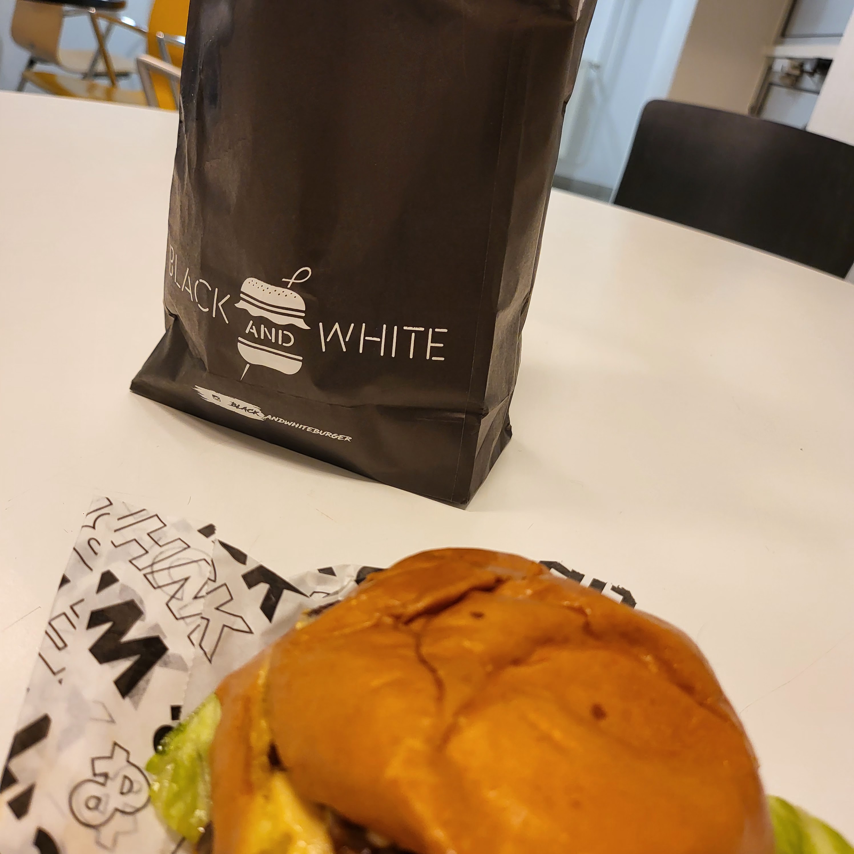 Les blackandwhiter ils sont cool la vue sur le Monoprix est délicieuse la prise était vraiment joli par contre ils ont oublié mon bacon dans mes frites mais heureusement un il n’y avait pas beaucoup de plastique. Les frites sont géométrique comme un pique et c’est super bon