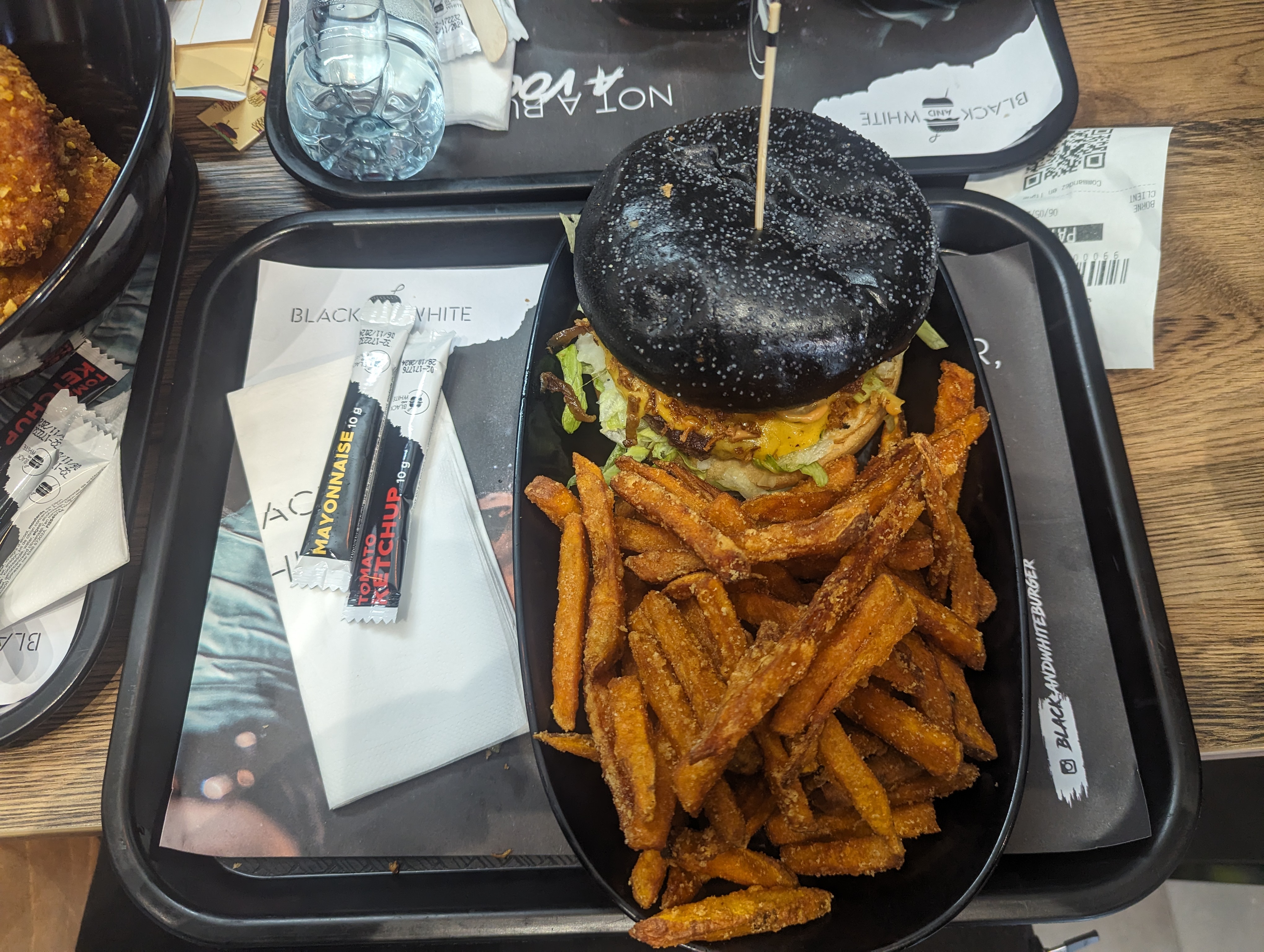 Test de black and white burger après avoir vue beaucoup de youtubers en parler en bien. C'était une déception mais je met la moyenne car il y a des choses positives: - La viande a du goût et c'est le gros point positif de cette chaîne. - le rapport qualité prix, si on compare avec McDo, Quick, etc ... Est meilleur ici. Pour les points négatifs : - frites surgelés pas ouf - sauces basiques - le paint ! Très visuel mais sec et extrêmement aéré et tout moue. Je regrette que ça soit pas plus qualitatif, je m'attendais a des burgers gourmets qui calent bien mais ça n'est pas le cas.