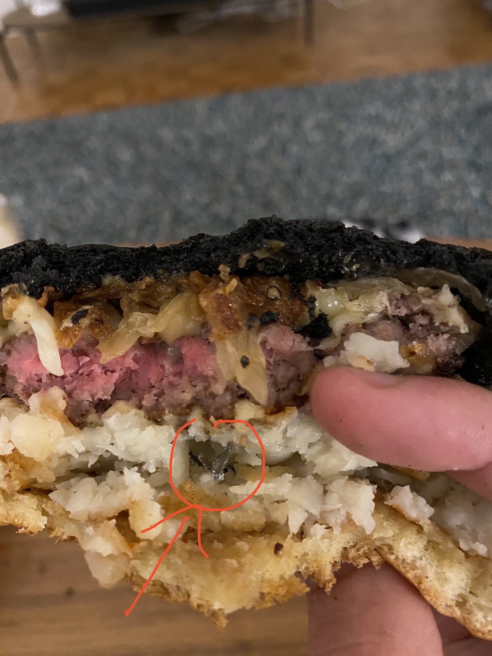 Il y avait plusieurs bouts durs (comme de l’os) dans le burger. J’ai failli me casser une dent. J’ai donc arrêté dr manger le burger. Nous sommes le lendemain et je suis malade. Heureusement que je ne l’ai pas mangé en entier! Scandaleux