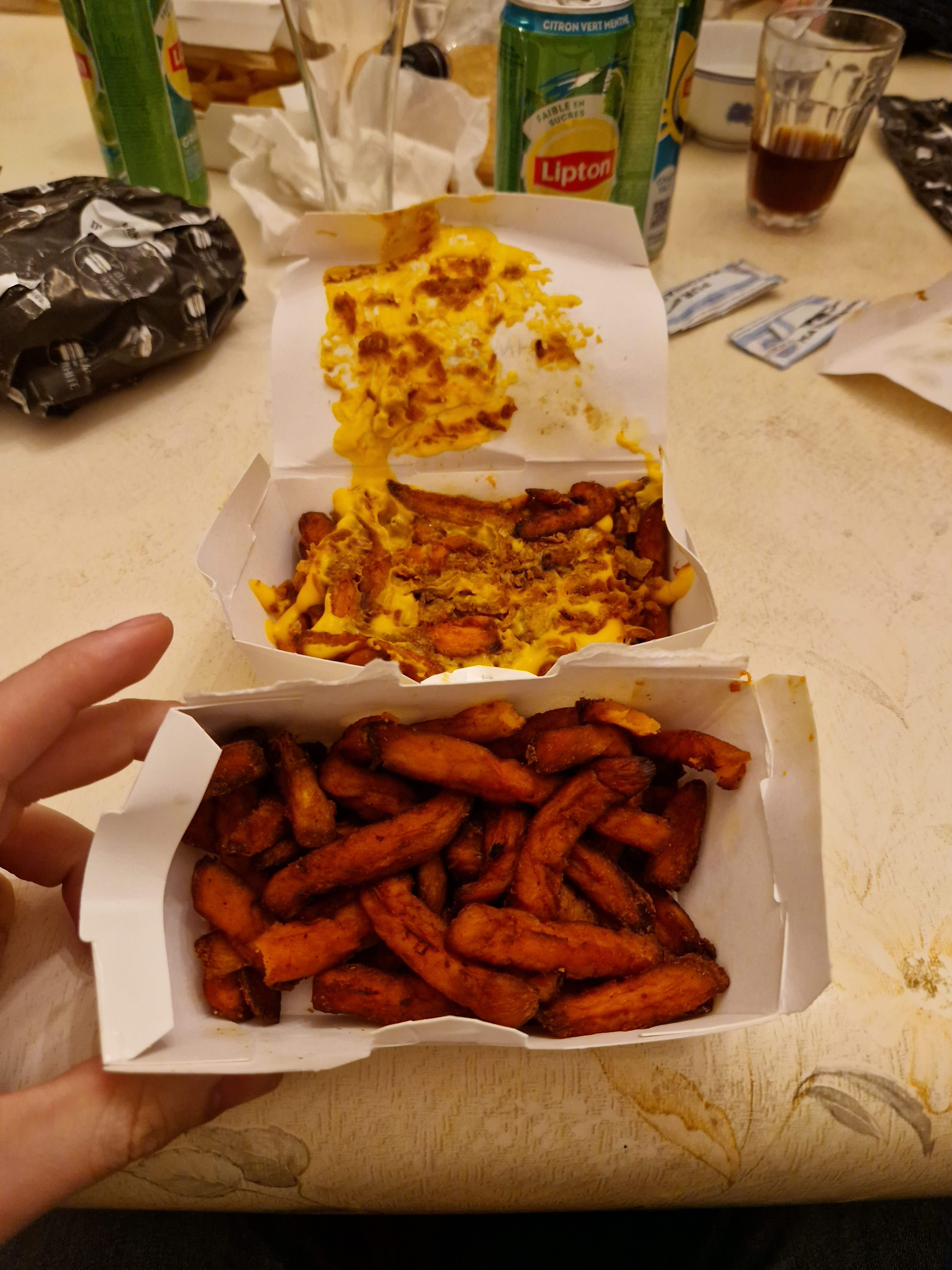 Commande uber arrivée dans les temps, ça aucun soucis. Cependant les portions de frites sont ridicules et nous sommes plus sur de la purée que des frites... Photo à l'appuie Dans un même petit sac 4 portions de frites 4 burger et 4 boissons... Pour une commande à quasi 85 euros c'est inadmissible et la personne au bout du fil en a clairement rien à faire de ce qu'il fait partir à ses clients.