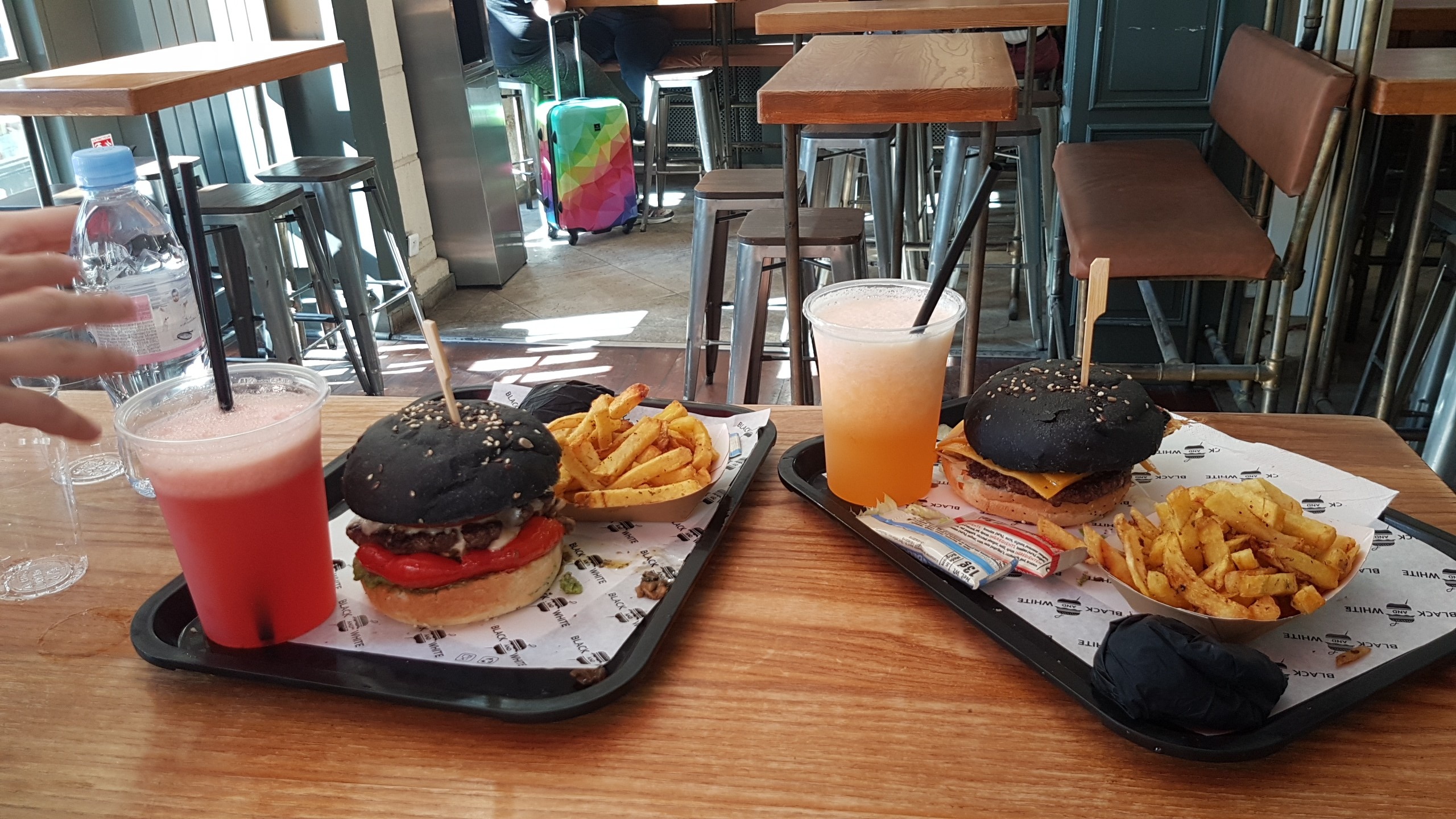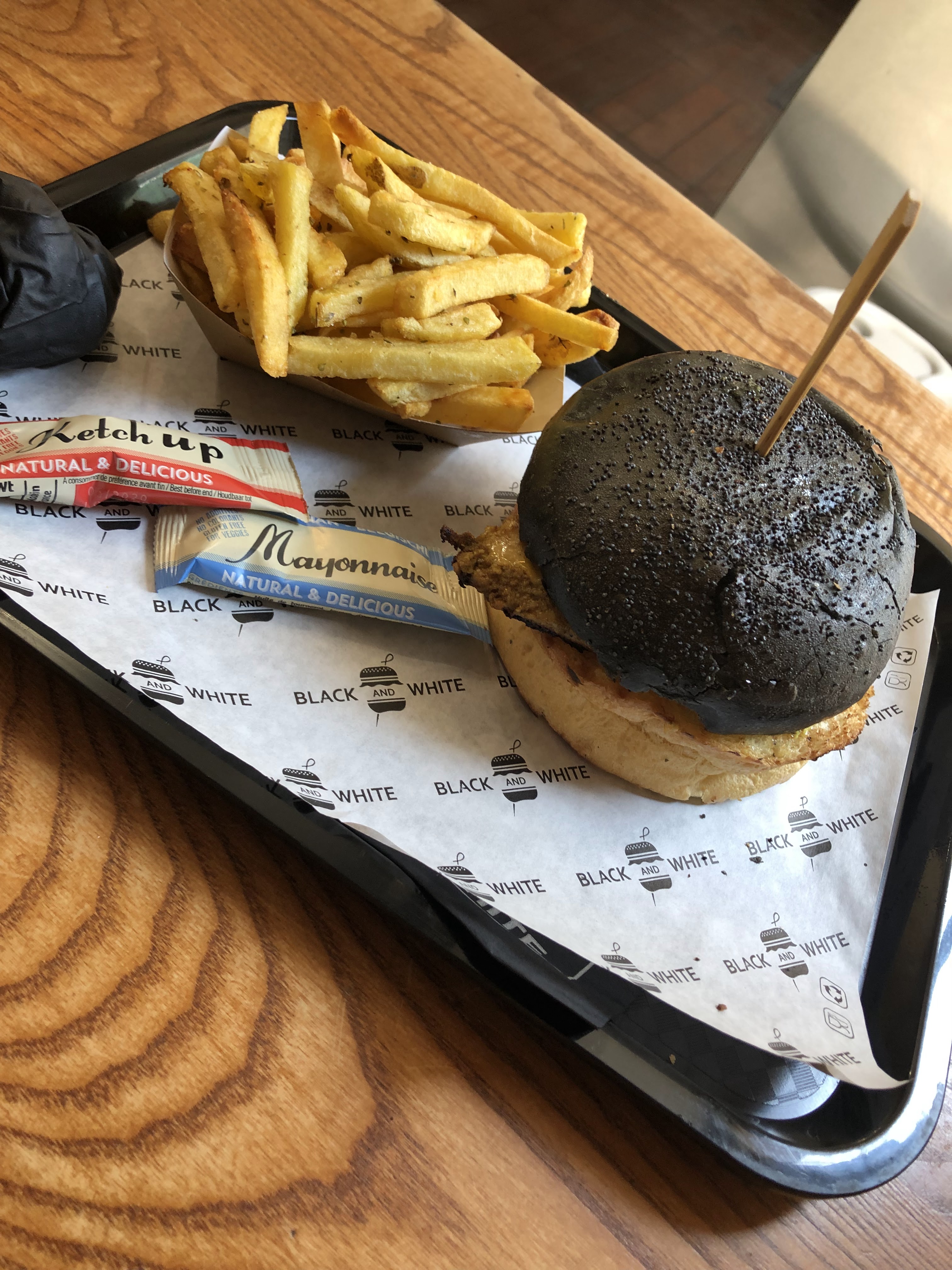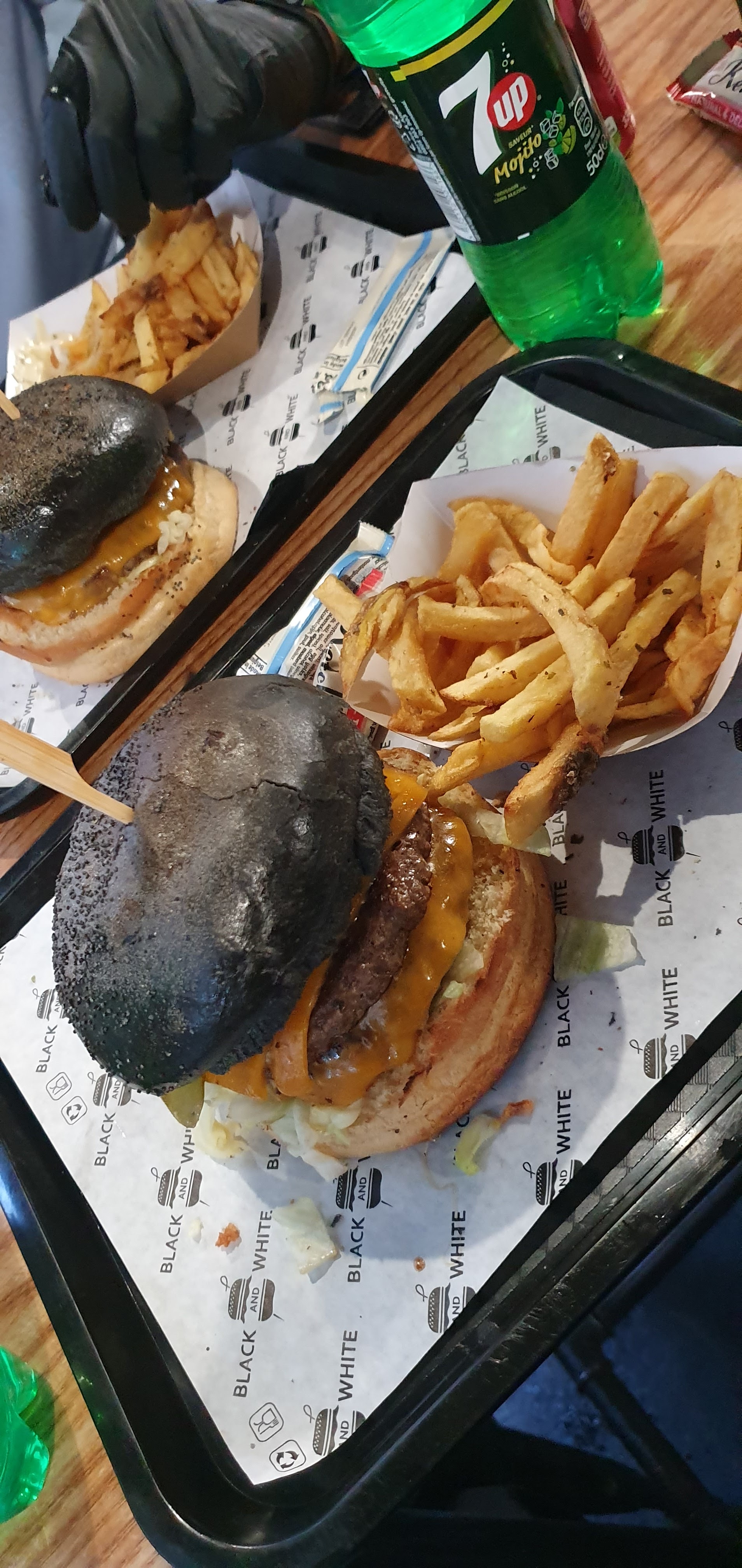Burger sympa. Les 2 originalités sont les pains blanc en dessous et noir au dessus. Et aussi les gants en latex fournis (la boule noire en bas à droite de la photo) pour éventuellement les mettre et manger le burger. Les frites sont pas mal.