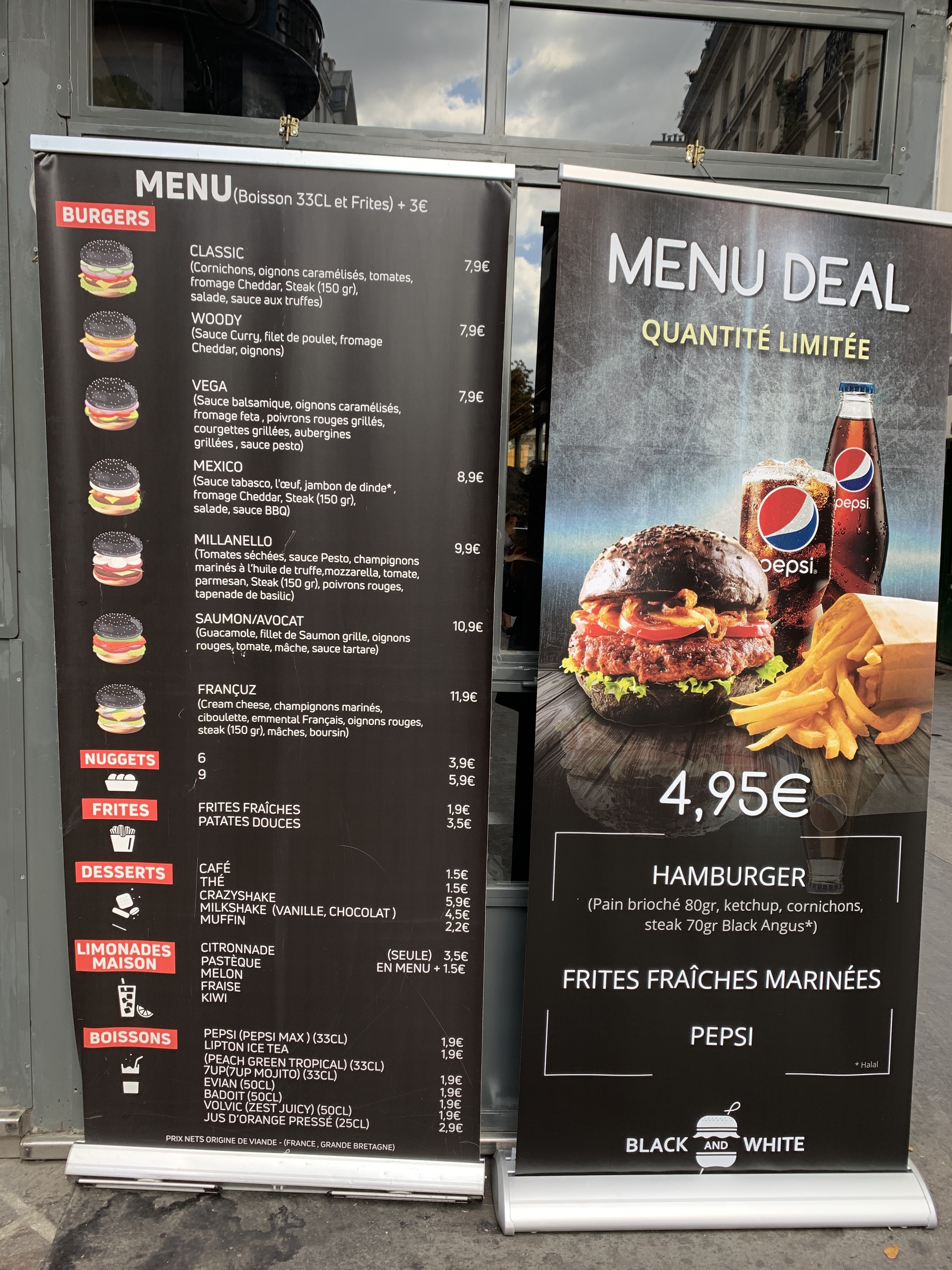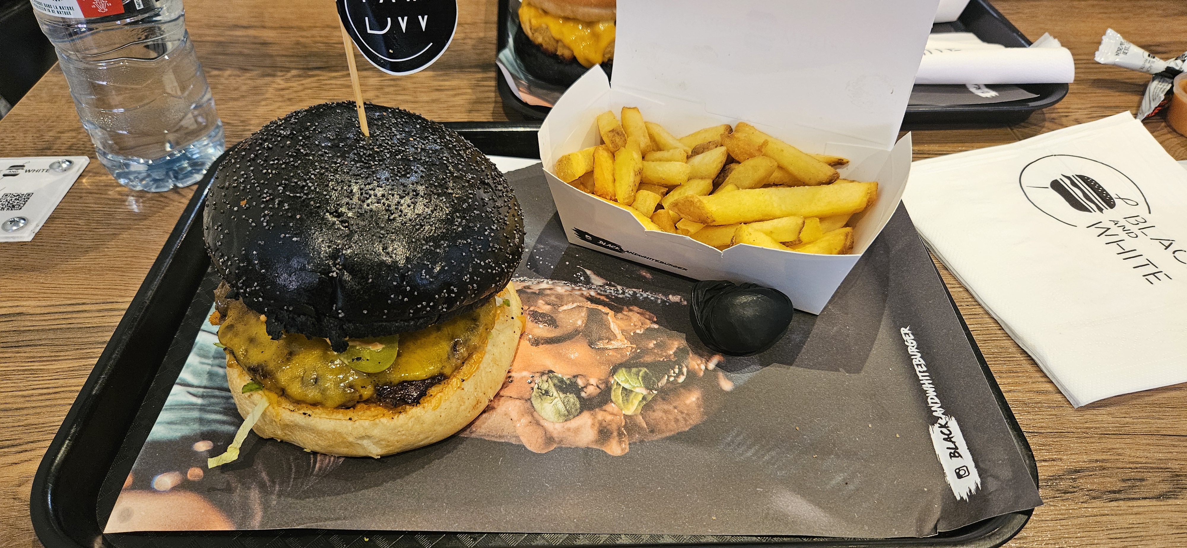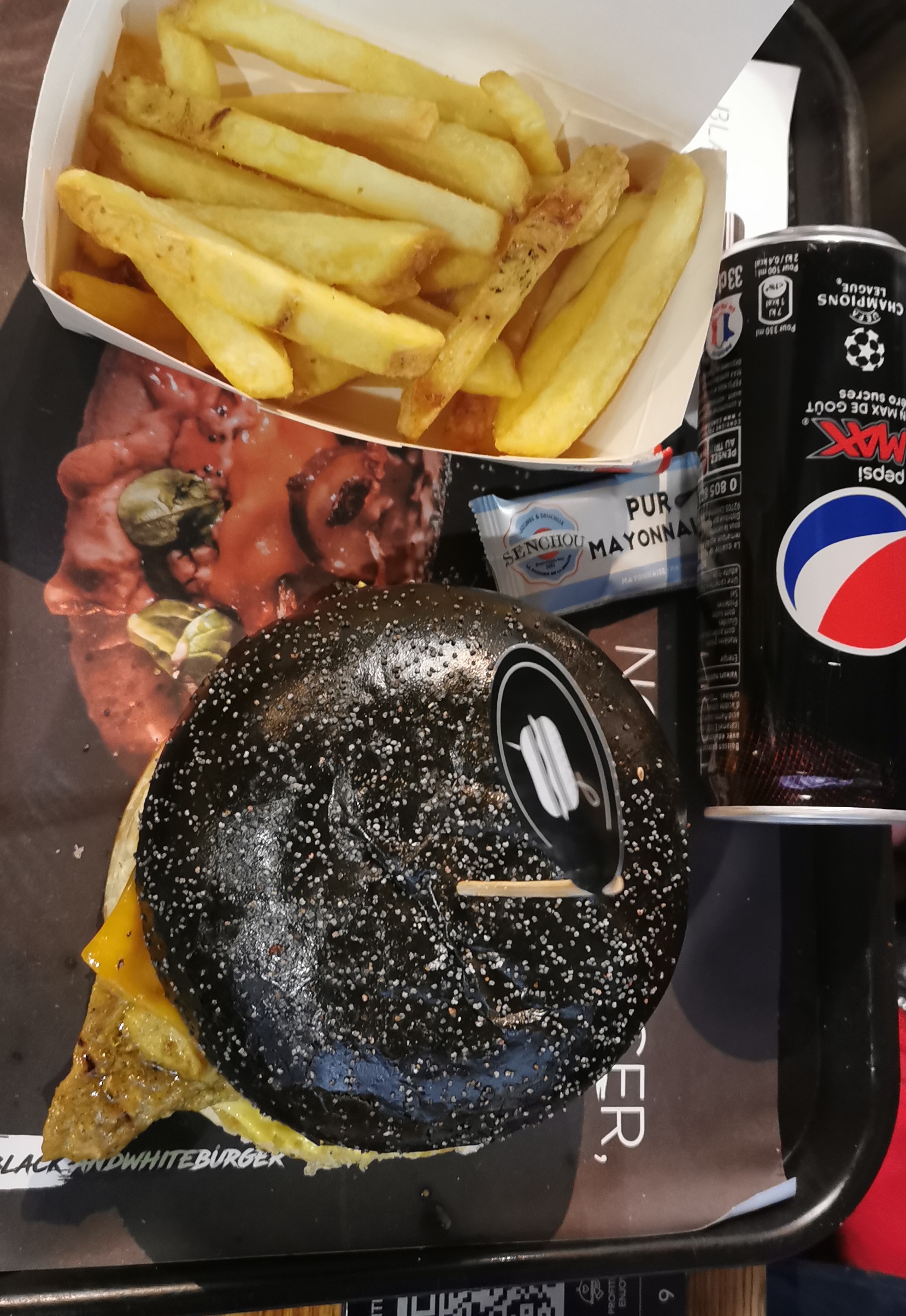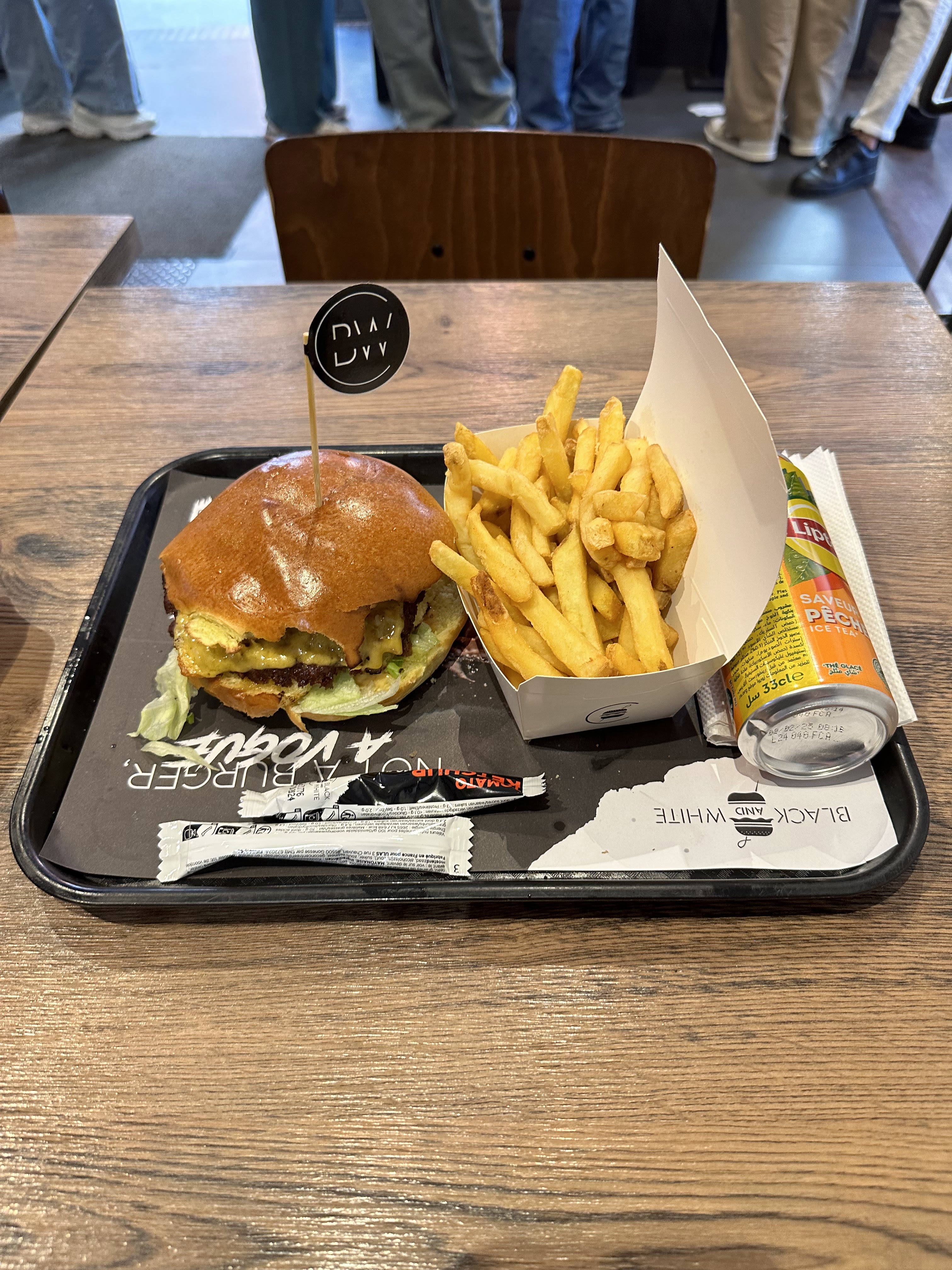 Bonjour à toute et à tous, ayant été dans le restaurant le Black & White Burger (noir et blanc burger pour les non bilingues) le dimanche 3 avril 2022 à 18h16 avant le coucher du soleil je vous joint cordialement la photo dudis menu dont ma carte bancaire à dus aimablement s'acquiter. j'ai pris celui ci contenant un burger montagnard, supplément bacon +1e Une barquette de frite de patate douce il me semble que c'était un supplément mais je suis pas sur et un ice tea de la marque litpon goût pêche au format 50cl (bien frais chacal sah quel plaisir) J'ai pris un menu Xl Concernant le burger bon sur la photo ça ne le met point en évidence mais si je peut me permettre, il est consistant, je pourrais même employé le qualificatif imposant, si vous me le permettez bien sûr. Il est beau, bon le pain noir c'est toujours pour le fun mais voilà il existe le pain est pas mal du tout le burger aussi raclette pas trop présente mais bon, viande carré dans l'axe. Les frites de patates douces toujours aussi belle visuellement inutile gustative ment à mon humble avis je les ai quand même finit parce que j'aime pas gâcher tu coco. Bonne quantité de frites Supplément 30 centimes sauce barbecue (BBQ pour les intimes) j'ai toujours du mal mais je devrais m'en remettre. Pour un total de 18,70 euro (pas franc Ginette) en paiement sans contact car je promeut les gestes dudis président les gestes barrières afin de limiter la transmission du dénommer covid 19. Le prix c'est dans le même délire Big Fernand en moins ouf même si c'est pas mauvais c'est pas donné mais on a truc de qualité mais je suis partiellement convaincu déso pas déso La salle est cool honnêtement La dame à la caisse j'en avais marre de l'entendre à la fin puis elle parle trop fort c'est chiant genre ça voix genre désoler mais voilà Je dirais donc un 13,78 sur 20