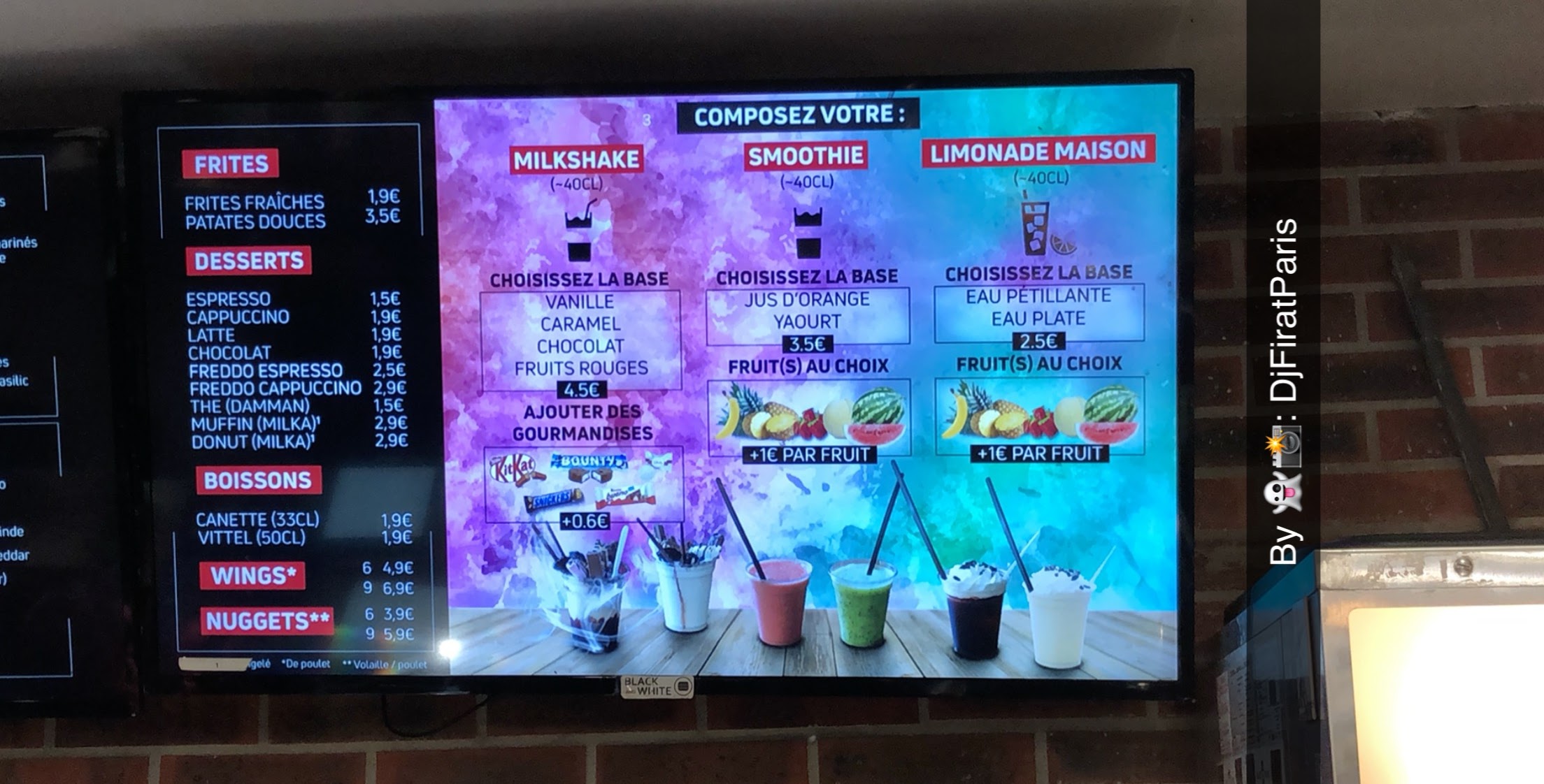Je suis venue car mon fils connaît ibratv. Bref quand on est arrivé plus de frits. Plus de pain complet noir seulement dessous Sol très sale. Dommage car c était bon. Un peut de noir sur les dents. Attention aux appareils dentaires. Ce lieu doit s améliorer sur l hygiène et l acceuil. Il suffit pas d être connu