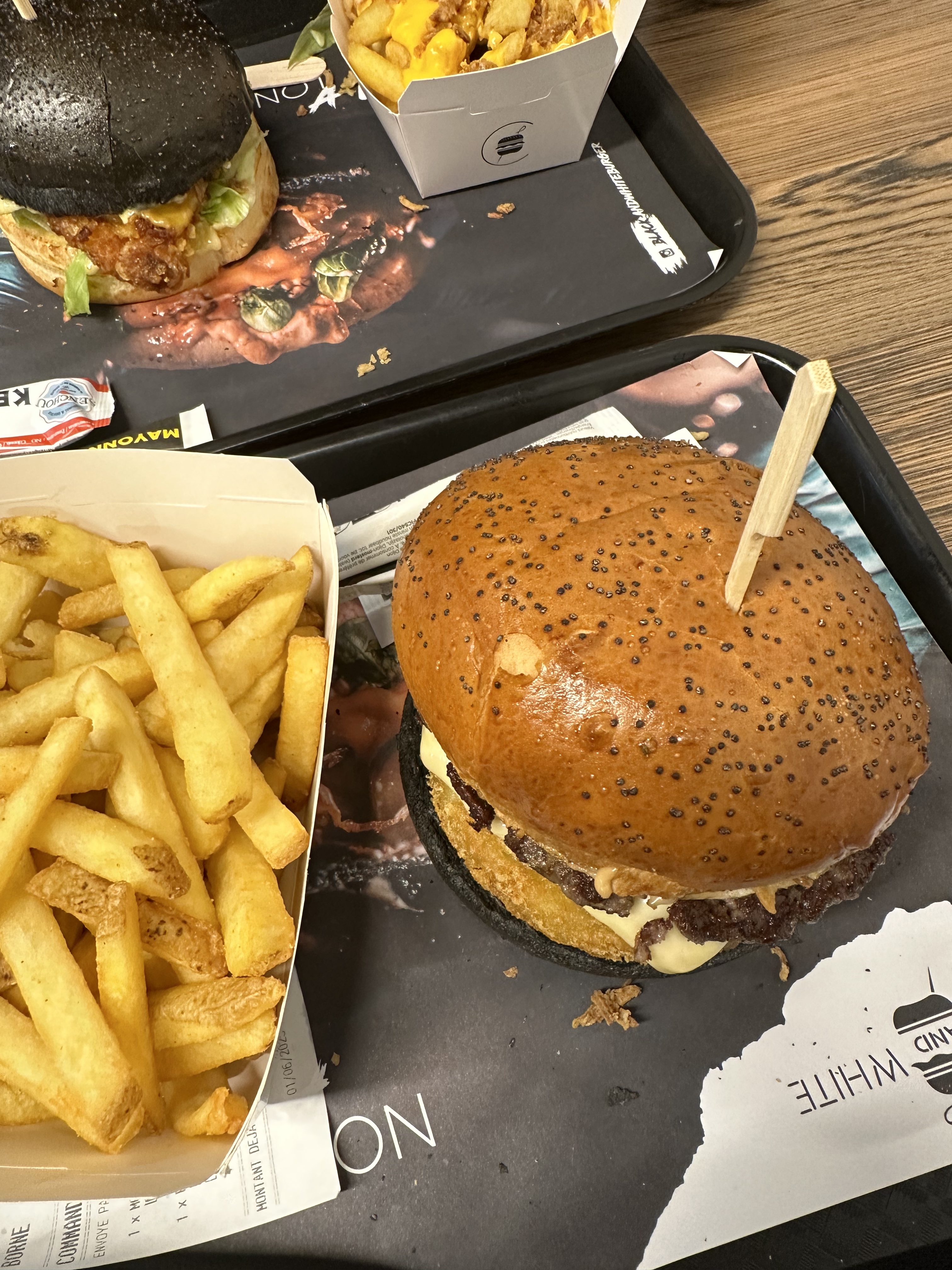 Très bon burgers autant au niveau de la viande que des garnitures. Les frites sont vraiment bien cuites tout est d'une grande qualité. J'ai donc eu le plaisir de revenir plusieurs fois, les wings et les tenders sont excellents aussi, cuits et croustillants comme il le faut. Un petit peu plus cher qu'un fast food classique mais vaut sont prix. Dommage que quelques rares fois certains produits soient en rupture de stock mais étant donné que j'y allais beaucoup vers l'ouverture du Black and White il est logique de penser que ce soit dû à la période d'adaptation. Bref tout est excellent le personnel est gentil, les prix un petit peu élevé mais le détour en vaut la peine !