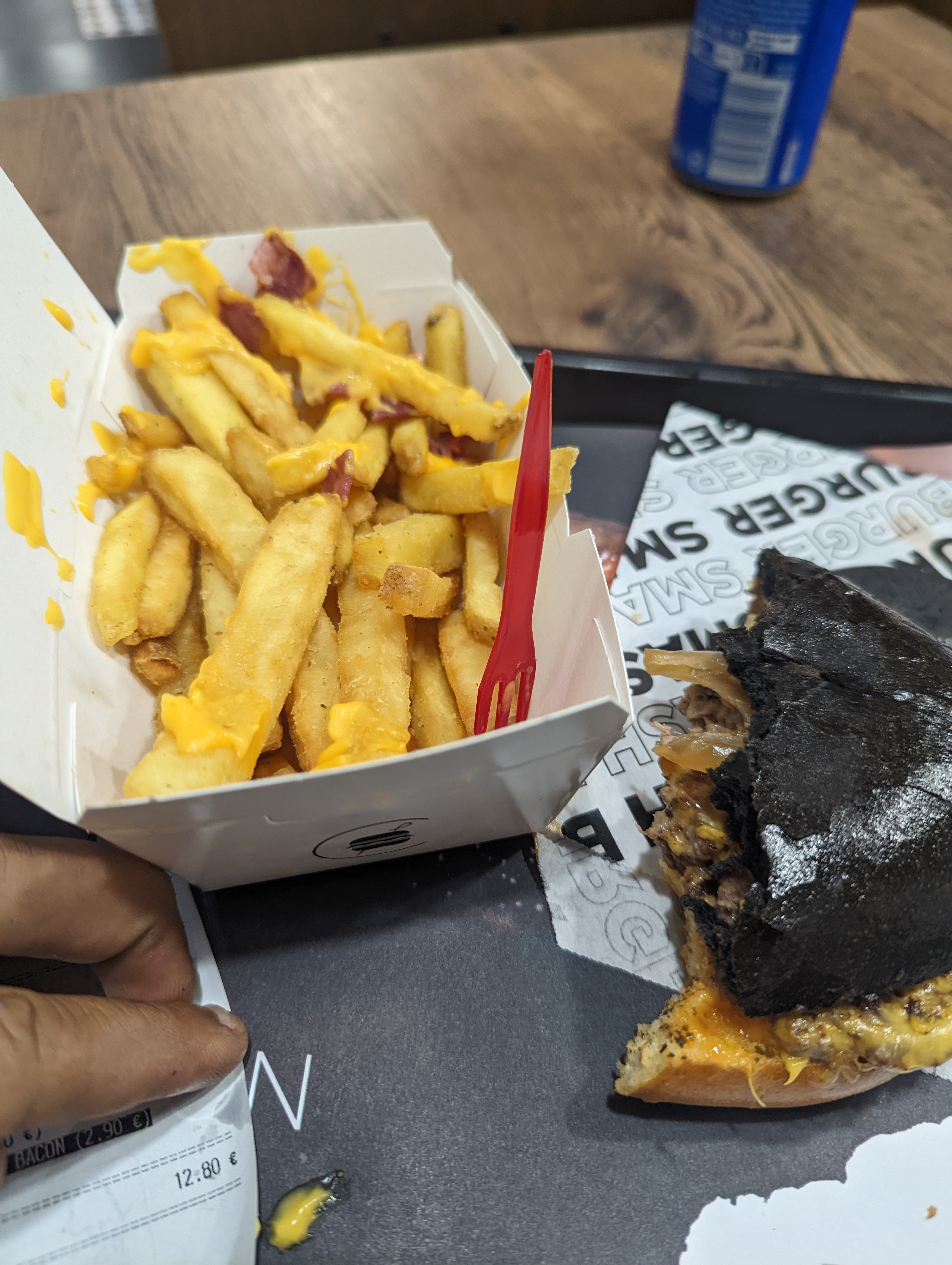 Commander un burger avec un supplément payer plus d’1€ et ils l’ont oublier Peu de sauce cheddar dans le frites Bof bof