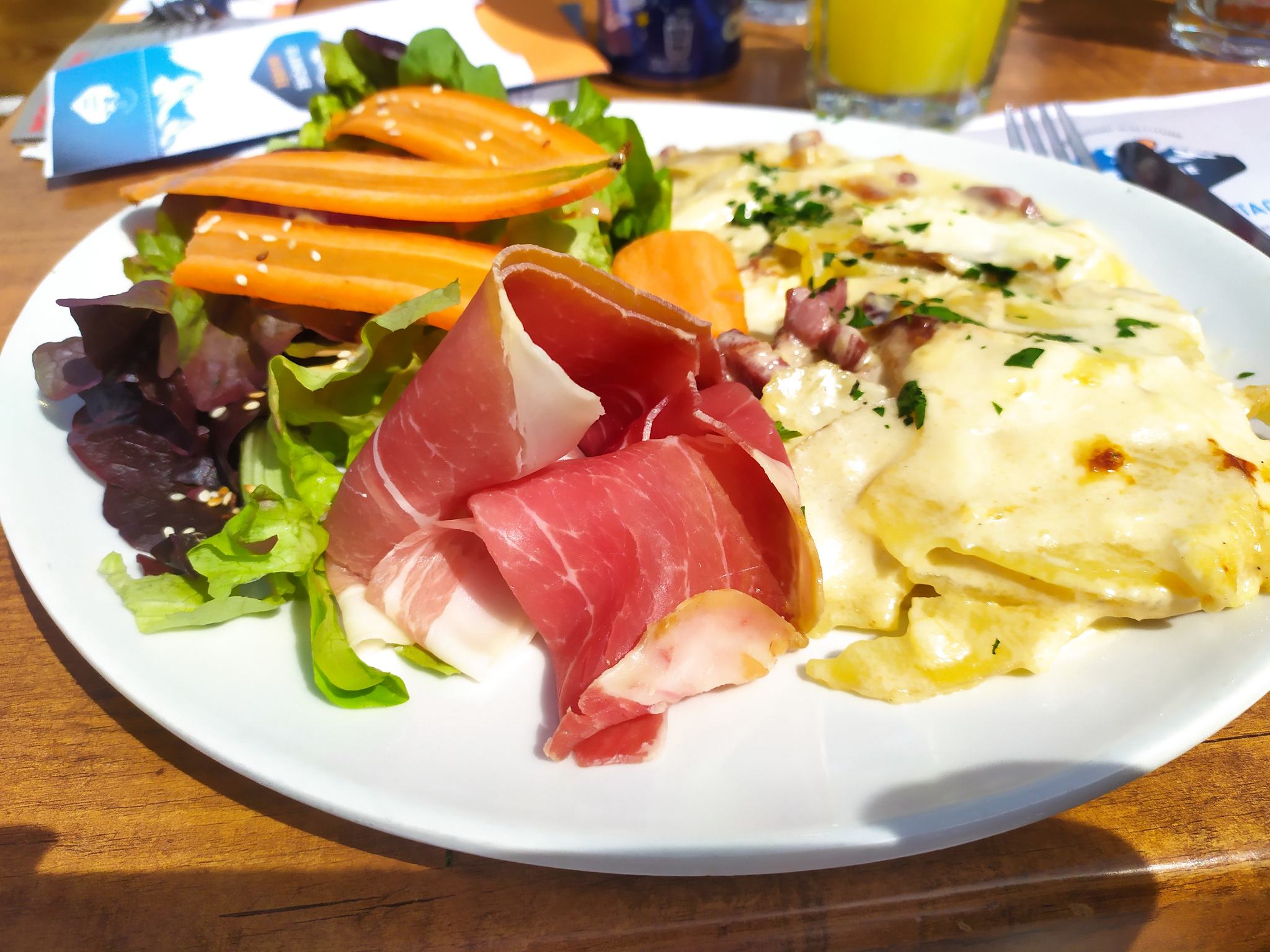Sans hésiter la meilleure tartiflette du coin. Effectivement il s'agit d'un restaurant très très demandé et il y a du monde mais en général le service est rapide. Ma moitié vous conseille aussi la salade saumon gravlax. Essayez vers 13h30 et attention au géné caché derrière la comptoir, pour les clients avec un grand sourire tout le repas ;)