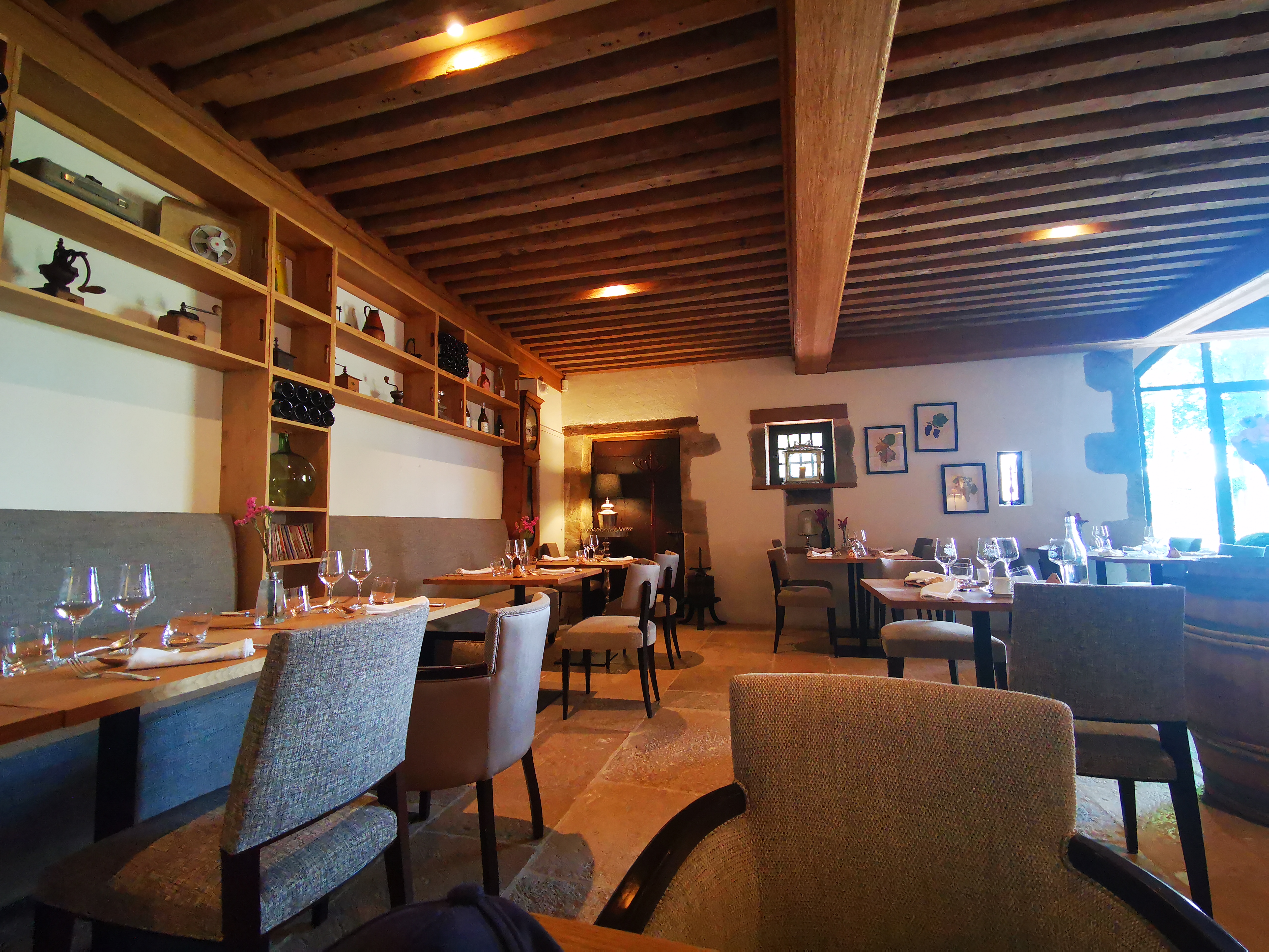 Très bonne cuisine raffinée et goûteuse accompagnée de vins du domaine de bonne facture. Cependant le mobilier tables n est pas à la hauteur de l endroit C est bête de goûter une si bonne cuisine sur une table bancale...
