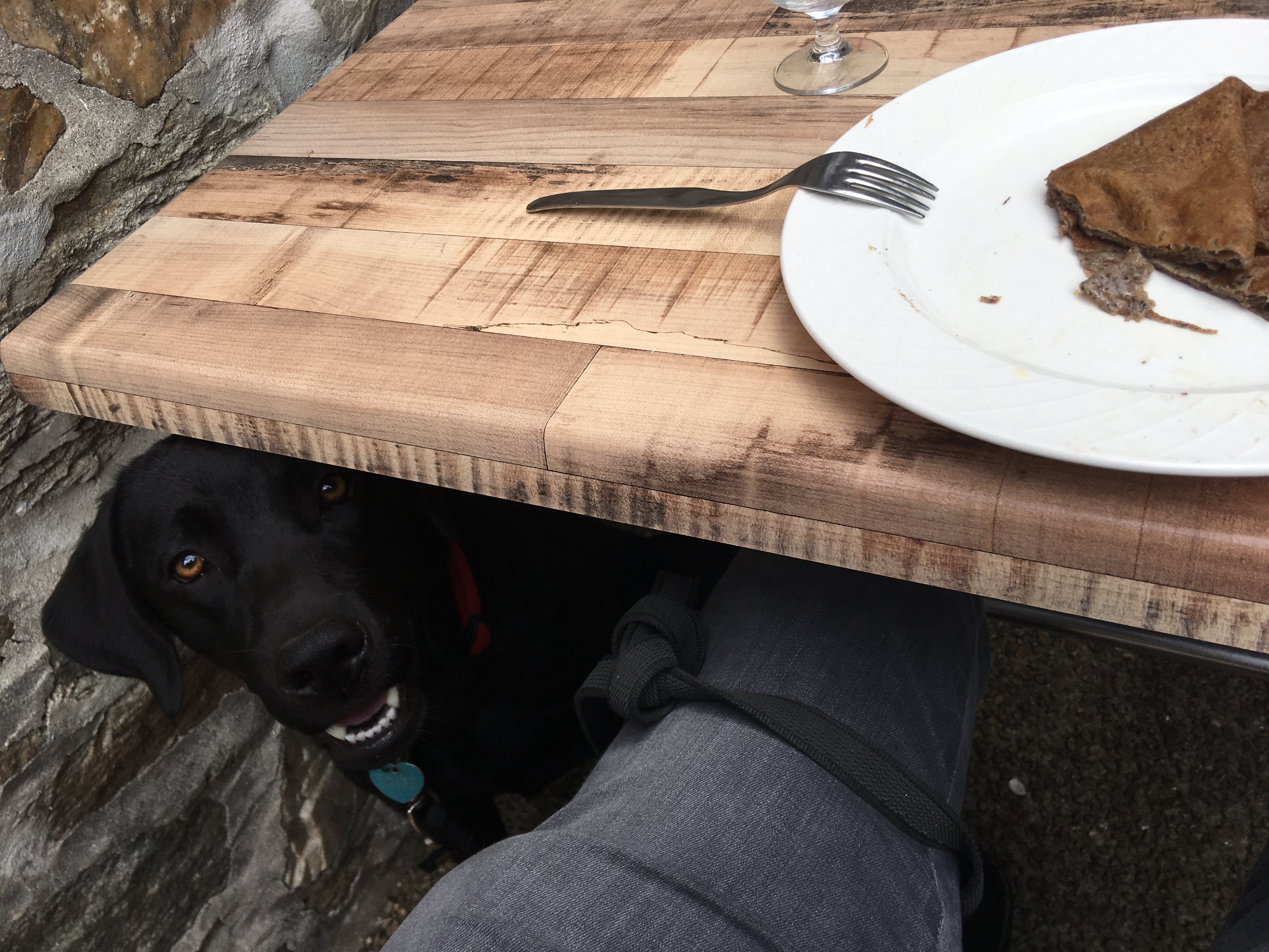 Si vous avez un chien, passez votre chemin: même en terrasse, on vous fait sentir que vous gênez. On nous a même ré-attribué une table de toute urgence, pour ne pas gêner le serveur (pas le service, le serveur - les serveuses quant à elles se sont montrées tout à fait aimables, nous proposant même une gamelle d’eau pour notre chien). Cependant, la place qui nous a été ré-attribuée (à côté de l’entrée du restaurant) était jonchée de tessons. Merci. Une galette au beurre histoire de pas être venus pour rien et on est parti.