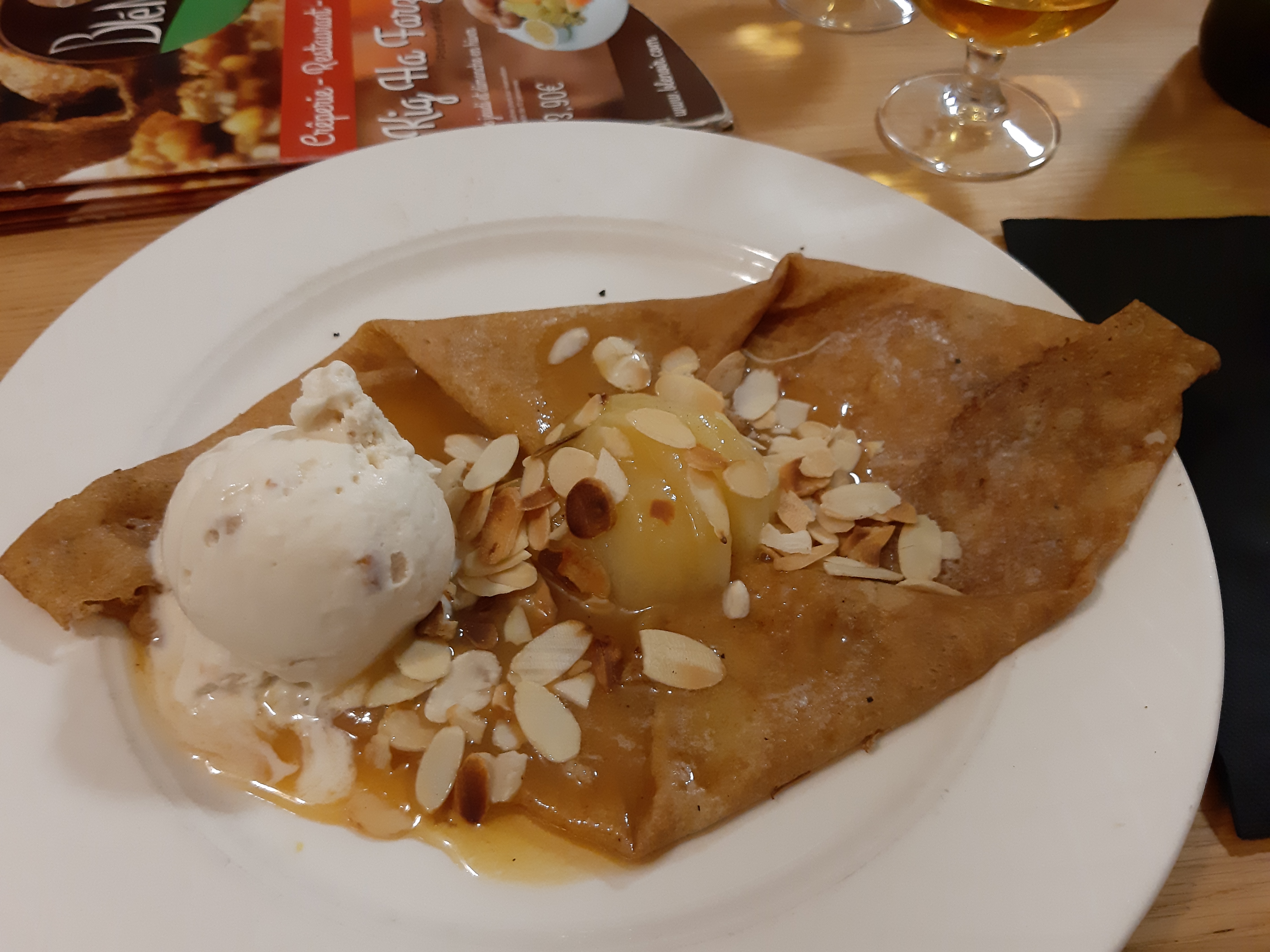 Accueil froid, crêpe salée au coquille Saint-Jacques à éviter, crêpe dessert au chocolat avec un minimum de chocolat. La boule de glace était bonne.