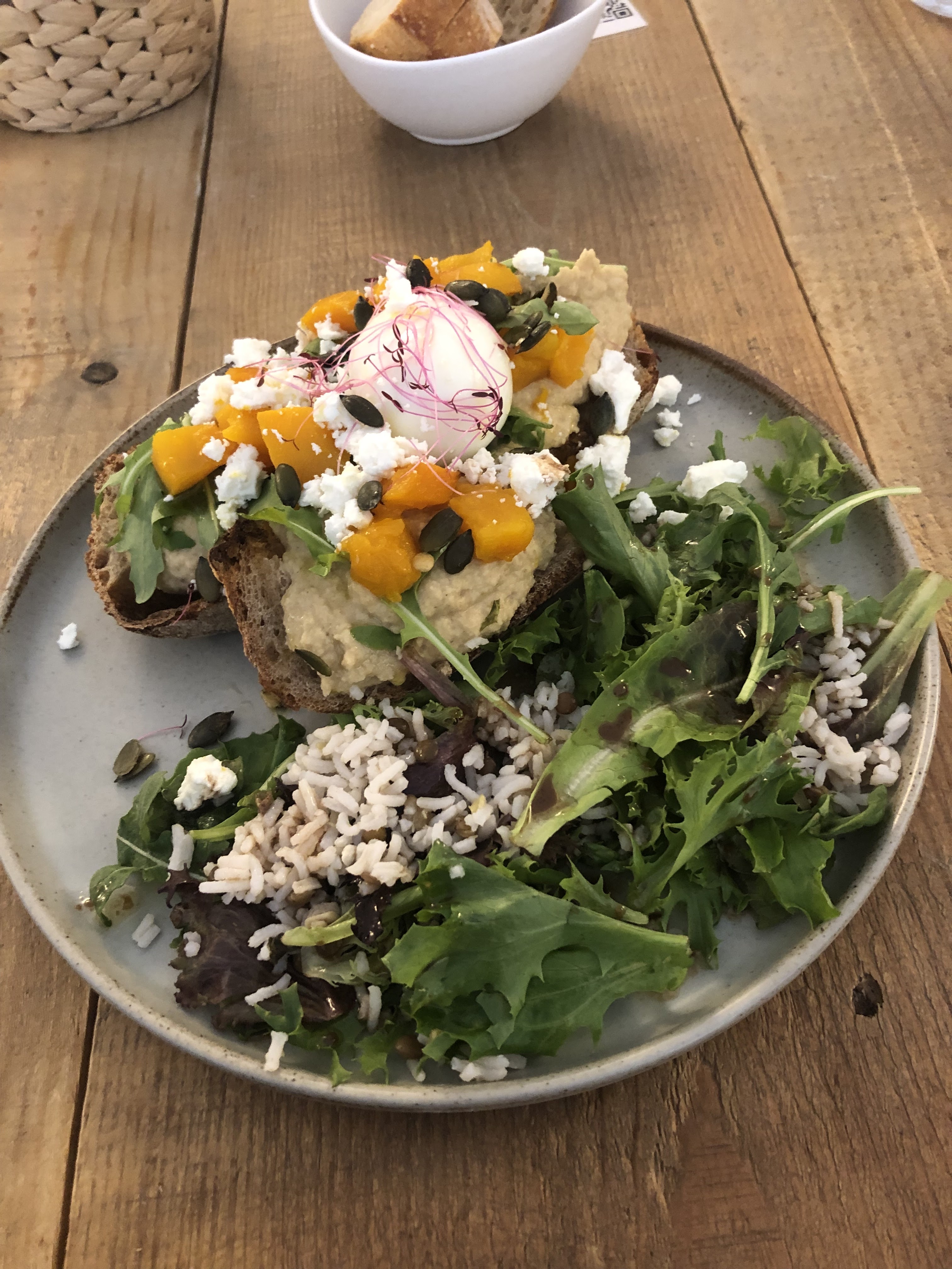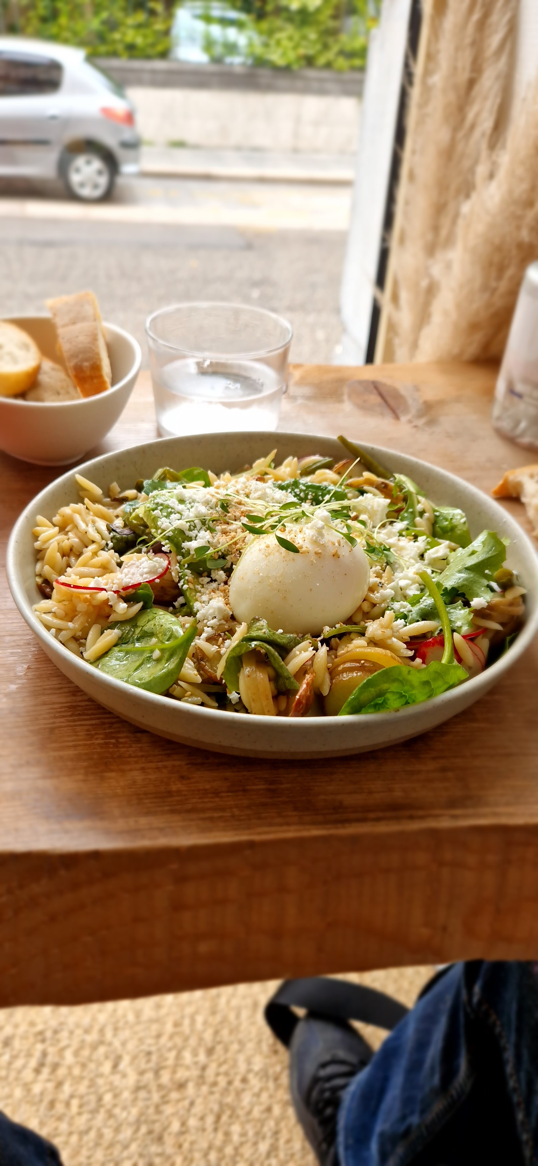 On est venu brunché - menu très simple choix entre différente recettes de bowls et tartines Nous étions 2 végétariens dans le groupe qui ont été satisfait de la carte et du grand choix de boisson Belle présentation et mise en valeur des plats mais je trouvais les choix pour manger limité Pour le midi c était plein !! Donc certaines personnes n aillant pas réservé leurs tables et qui étaient la pour travailler pour toute la matinée ont dû partir - victime de leur succès!