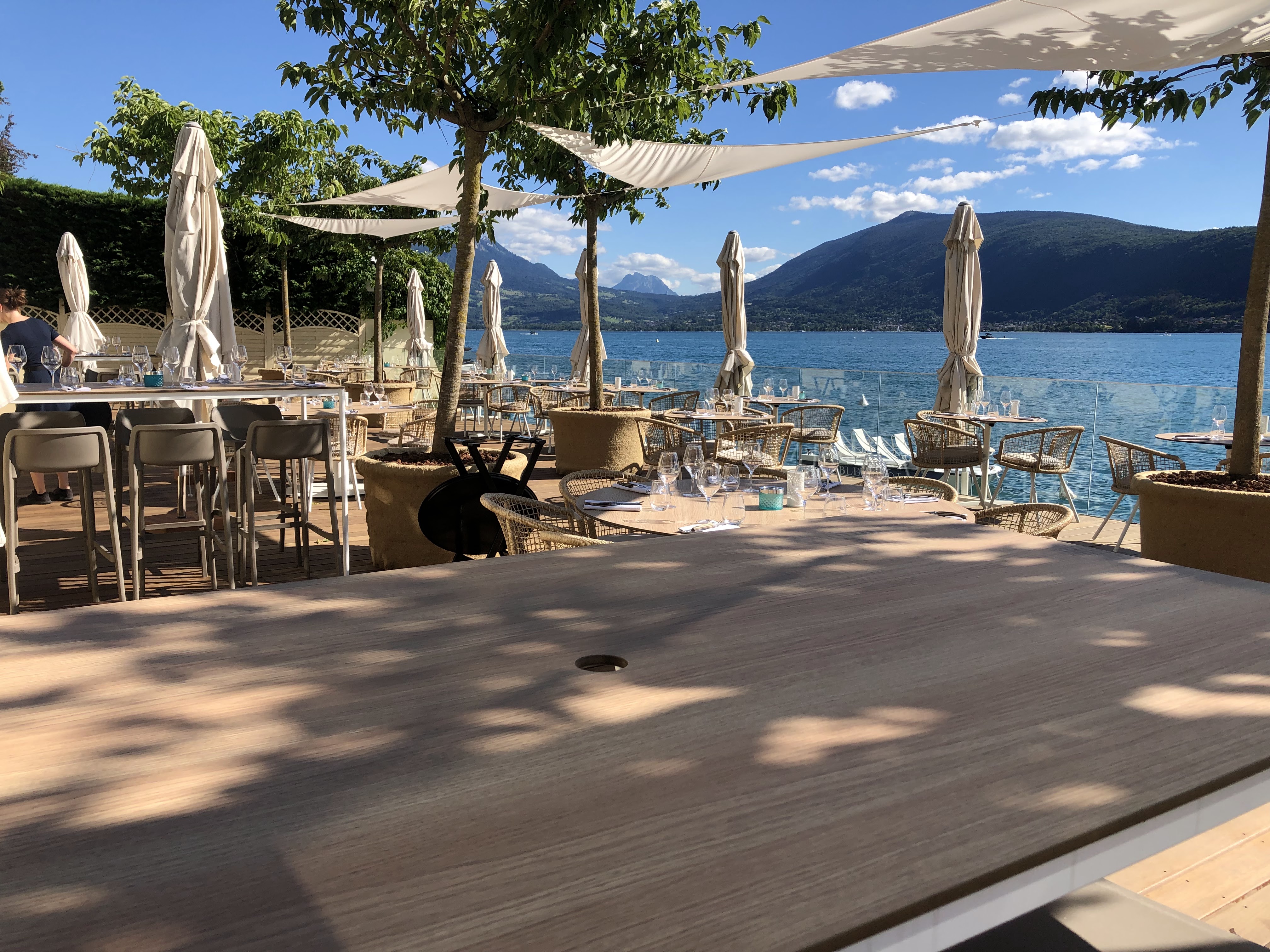 C’est la troisième fois que nous venons ici mais la première depuis le changement de propriétaire qui l’a renommé Bleu 1801. Le nouvelle aménagement est une réussite! Le spot est superbe, pour moi un des meilleurs d’Annecy car orienté Est, le soleil couchant est donc en face de la terrasse. Sublime. Celle-ci est en front de lac et elle est magnifique, et un grand espace plus haut permet de faire des apéro/cocktail et de chiller sous l’ombre des voiles d’ombrages et des jeunes arbres. Côté restauration, la carte est fraîche et notre pavé de thon mi-cuit était vraiment excellent. Mention spéciale pour le dessert Pavlova noix de coco et mangue qui était magnifique et délicieux. Le personnel est aussi très pro, très gentil et avec de l’humour. Bravo! Je vous conseille donc ce restaurant, avec réservation bien à l’avance pour les tables en front de lac.
