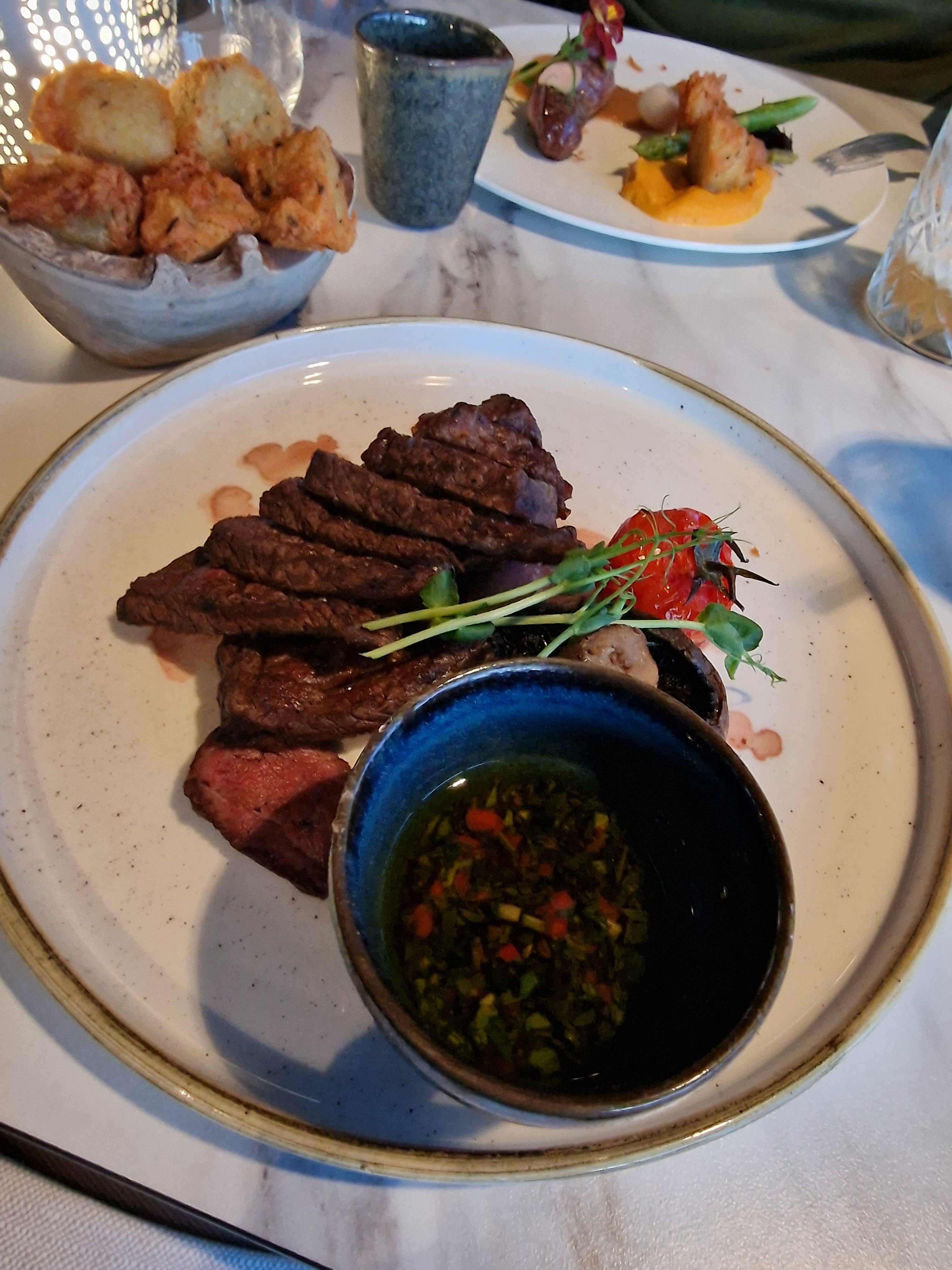 Restaurant magnifique, les plats étaient très bons mais quantités un peu limite sur la pièce de bœuf servie sans accompagnement (pas de frites alors qu’il y en a avec le burger) vu le prix. Le serveur était agréable mais quelques oublis.
