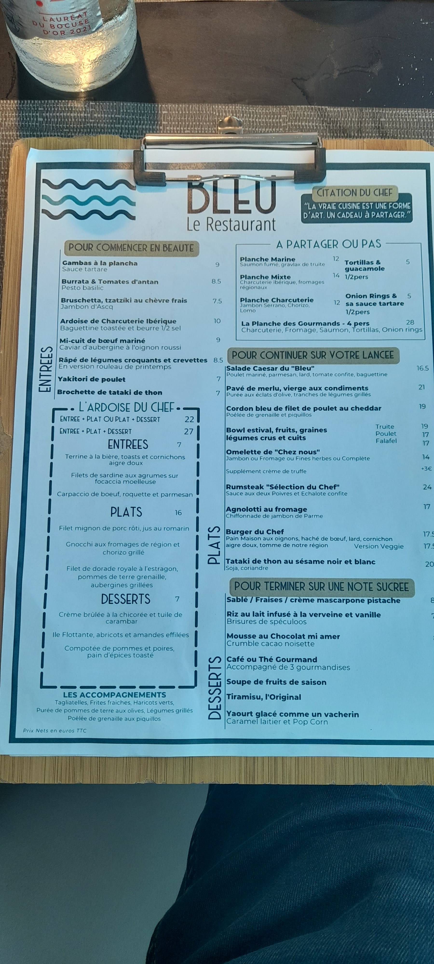 Nous sommes allé au bleu restaurant pour l'anniversaire d'un ami, ambiance sympa, petite intention pour notre invité (feu de bingale sur le dessert🥰) service fabuleux merci Valentin pour ce moment. Je recommande.