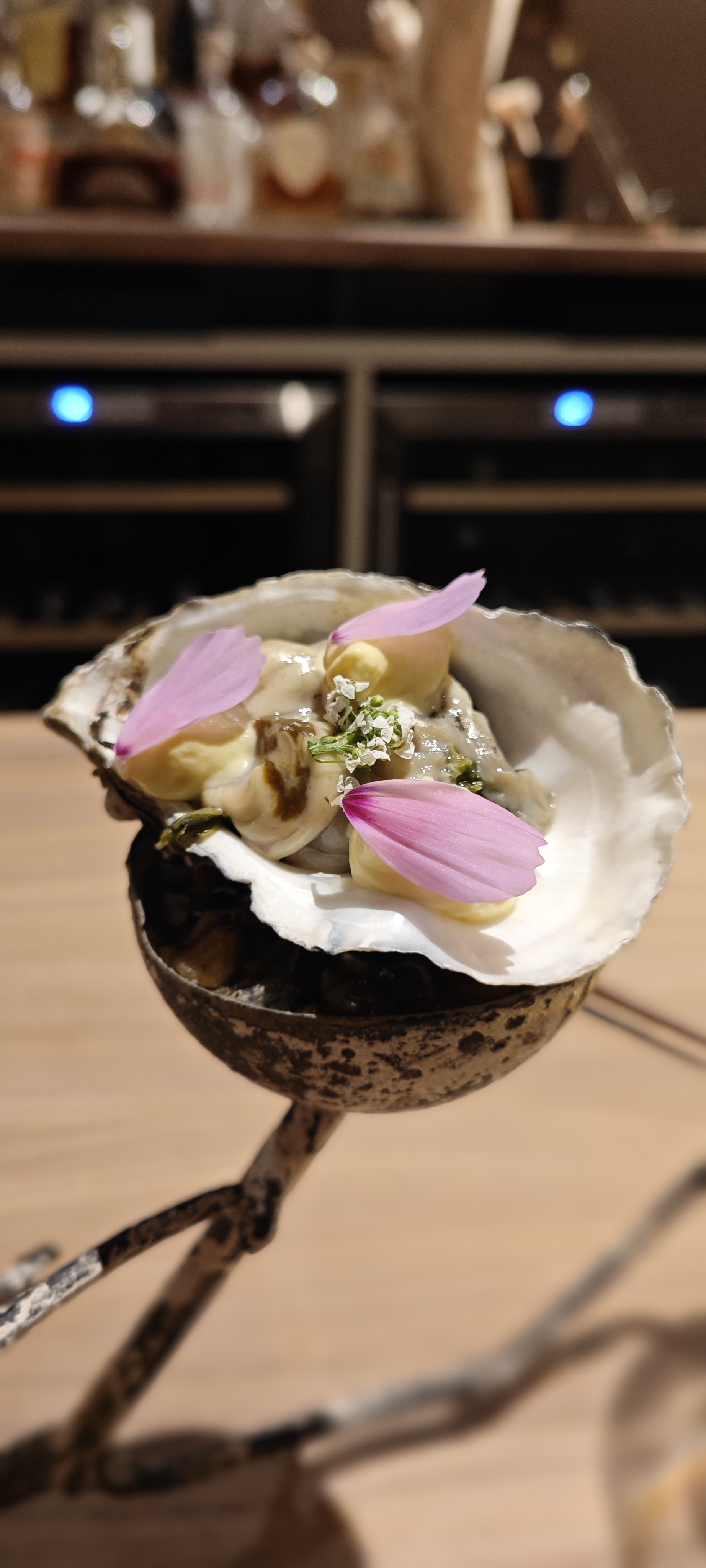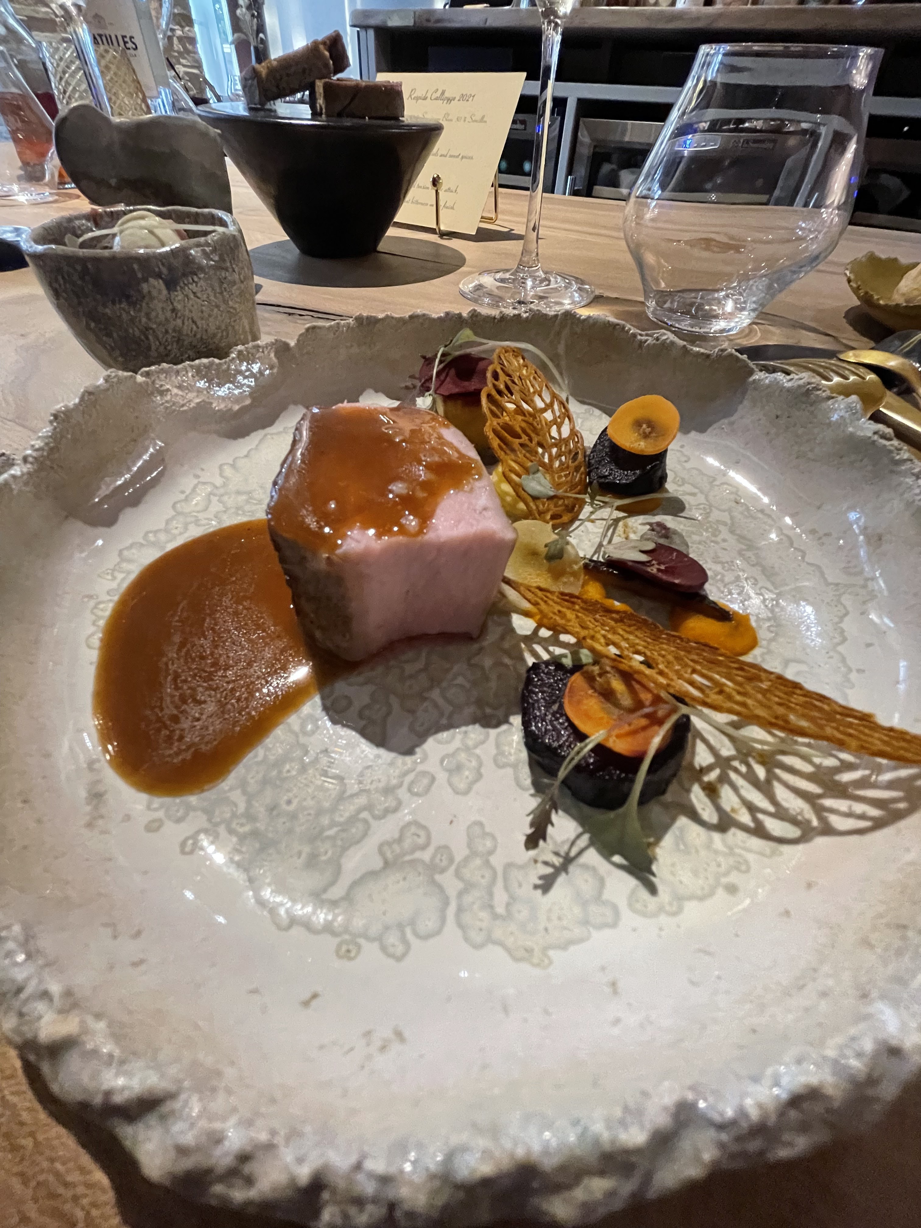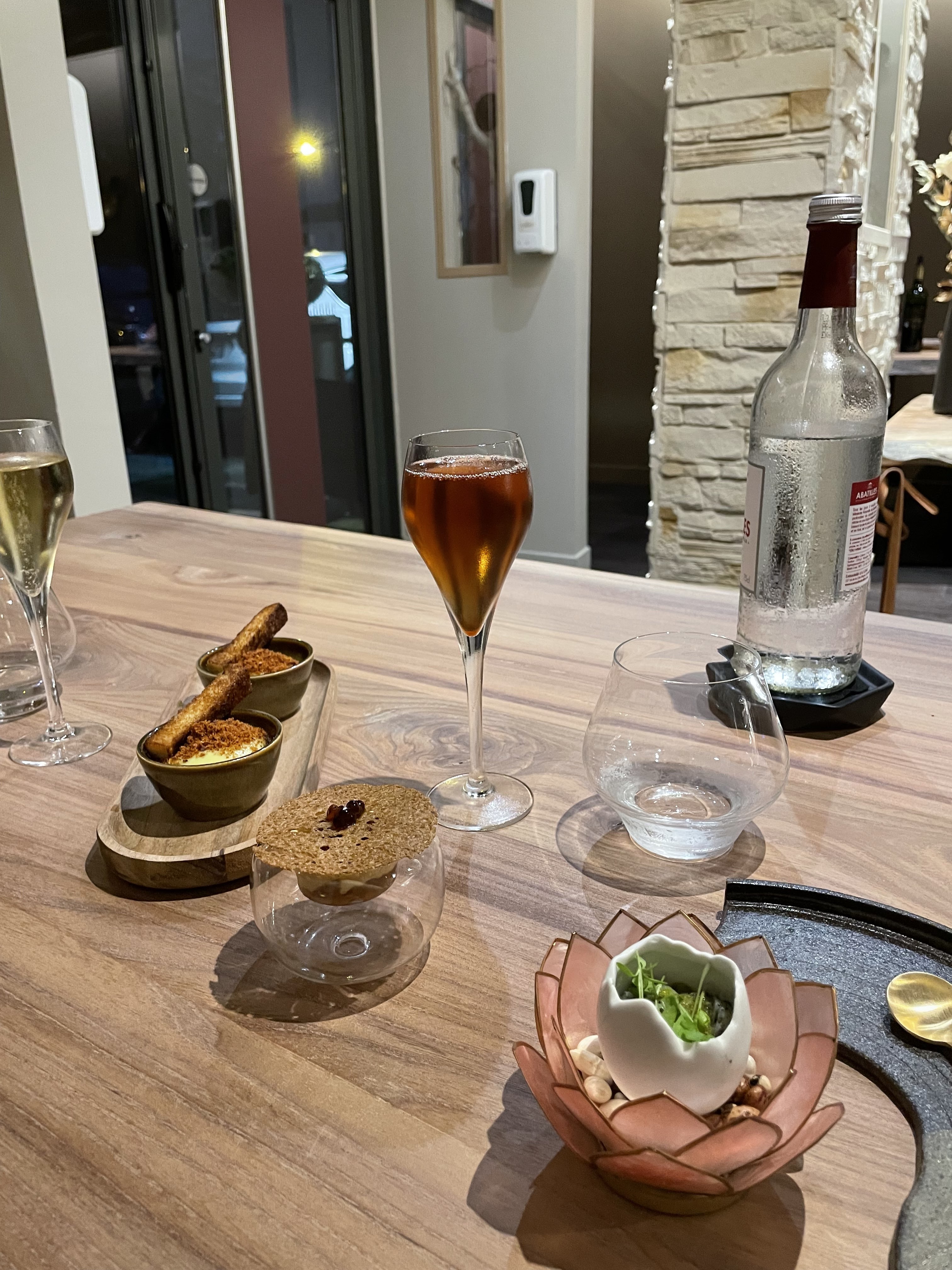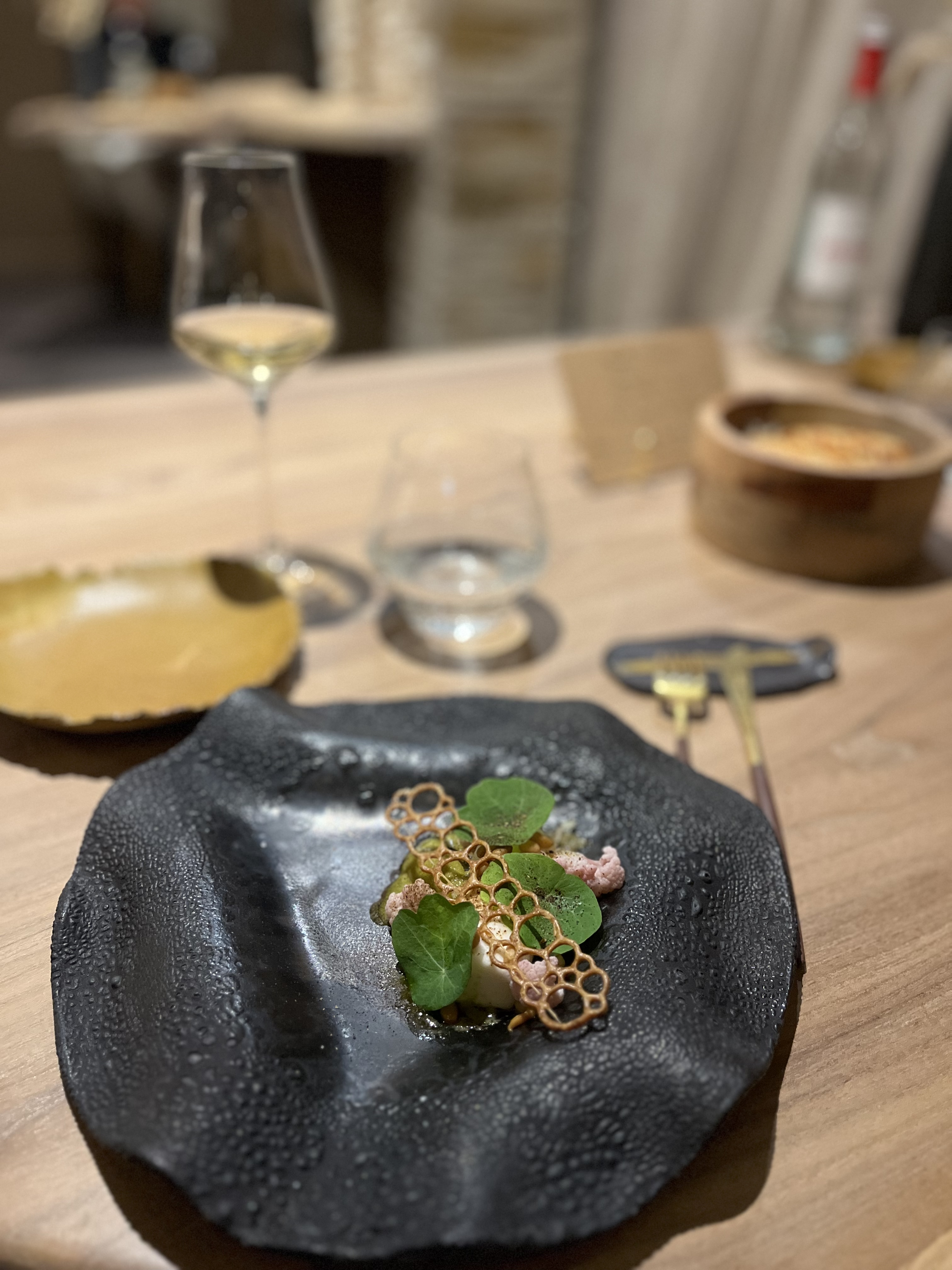 Une expérience culinaire hors du commun, où les mets sont un régal pour les yeux avant de l'être pour les papilles . Toutes nos félicitations au chef qui prépare ces œuvres d’art devant nos yeux ébahis. Le repas est rythmé par la maîtresse de maison , toujours aux petits soins et le temps passe très vite grâce aux surprises dont je ne dirai rien 🙂. Le cadre est superbe , les tables sont incroyables et l’on est très bien assis pendant les deux heures et demie que dure le dîner.