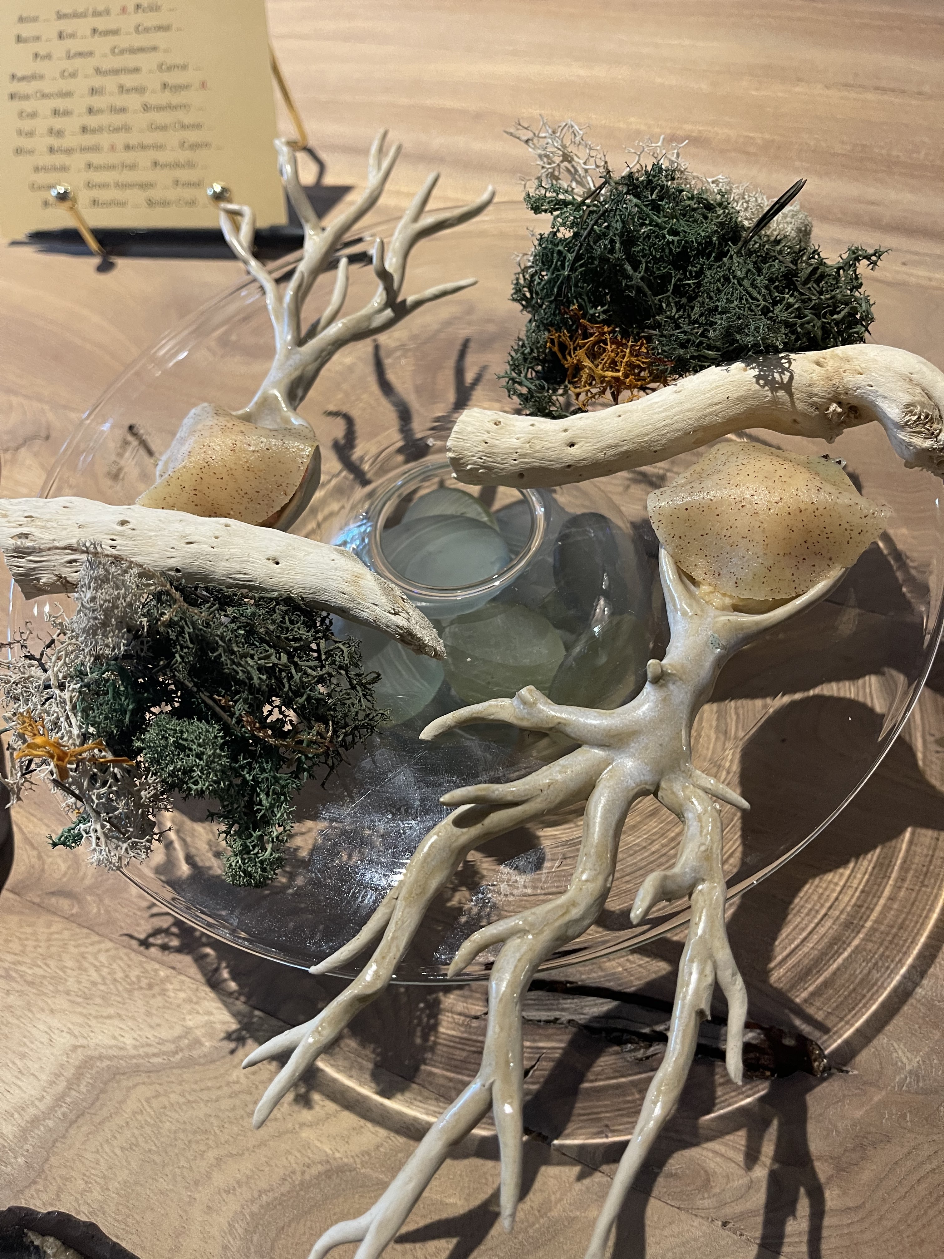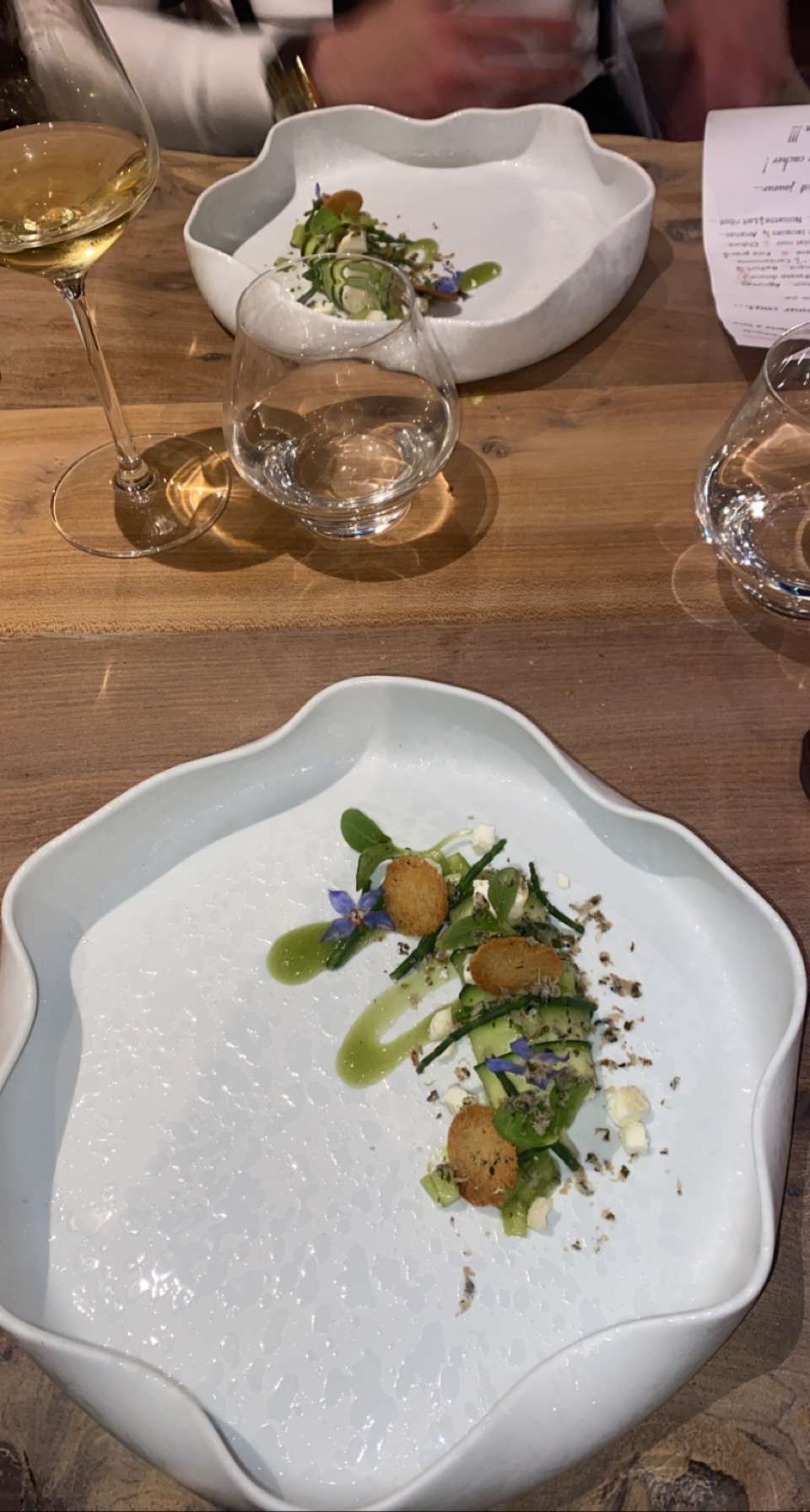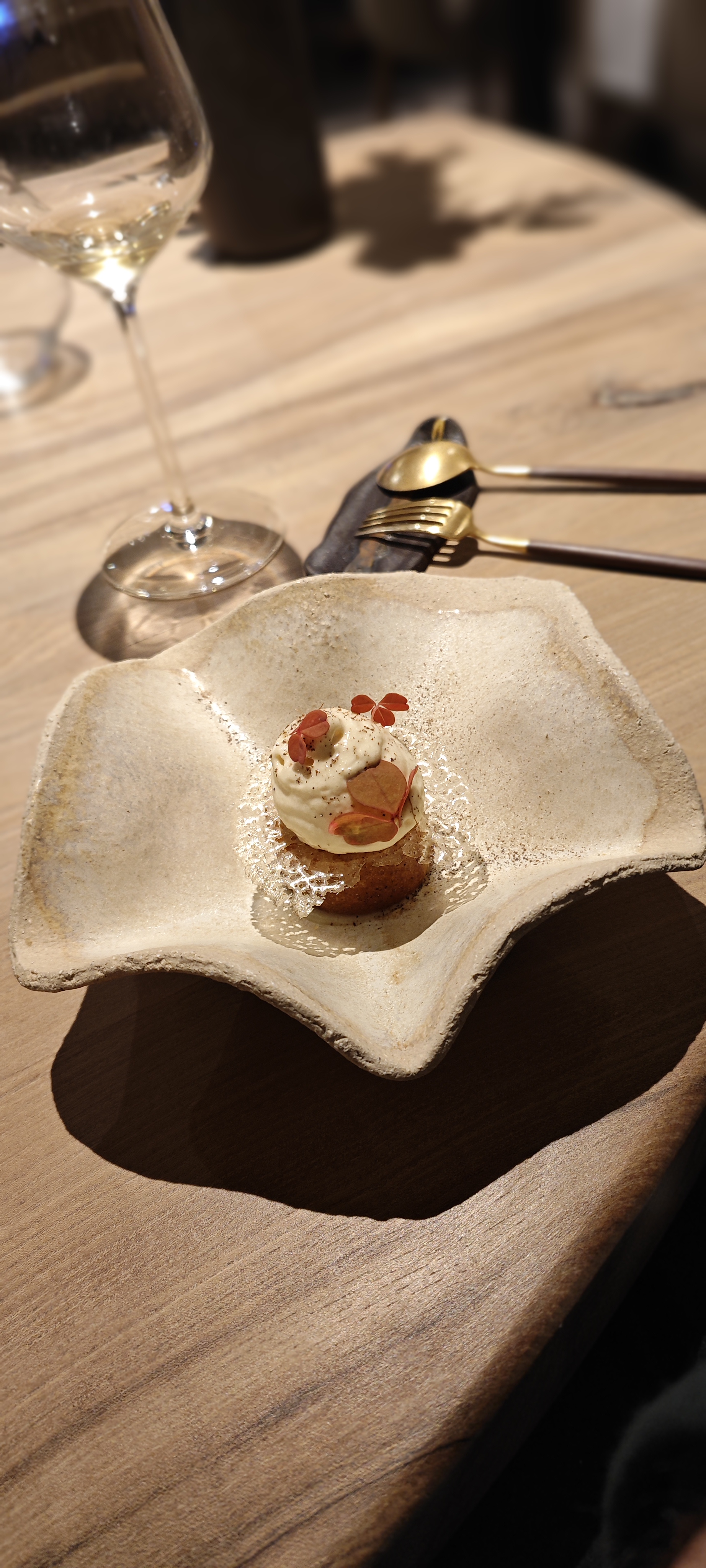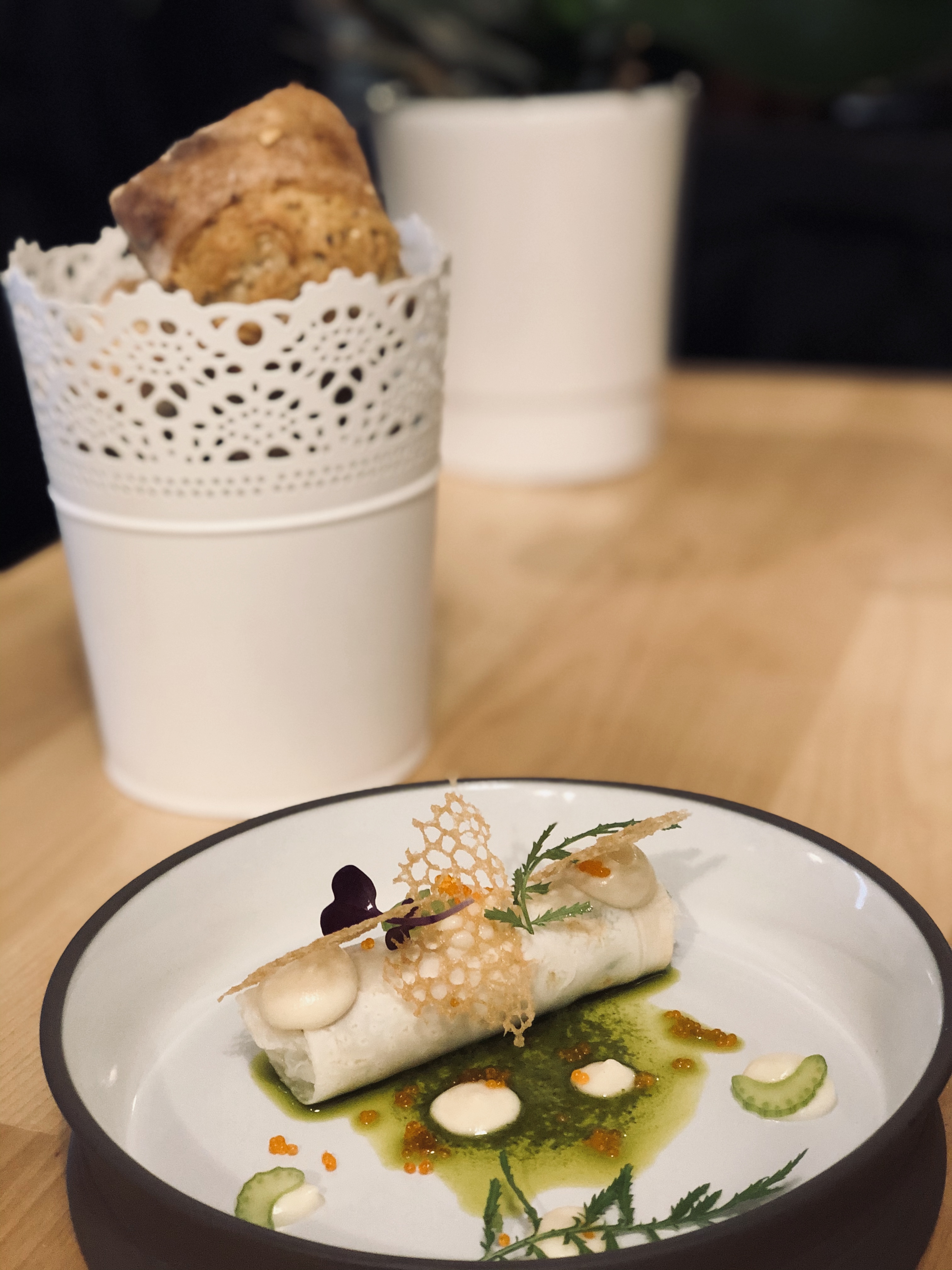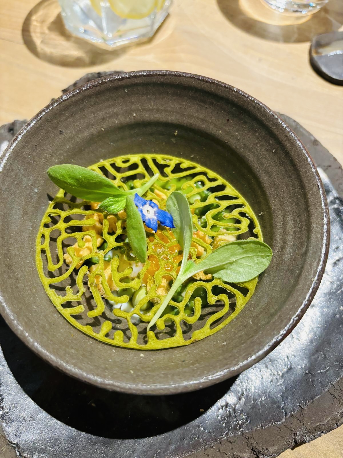 Une expérience culinaire hors du commun, où les mets sont un régal pour les yeux avant de l'être pour les papilles . Toutes nos félicitations au chef qui prépare ces œuvres d’art devant nos yeux ébahis. Le repas est rythmé par la maîtresse de maison , toujours aux petits soins et le temps passe très vite grâce aux surprises dont je ne dirai rien 🙂. Le cadre est superbe , les tables sont incroyables et l’on est très bien assis pendant les deux heures et demie que dure le dîner.