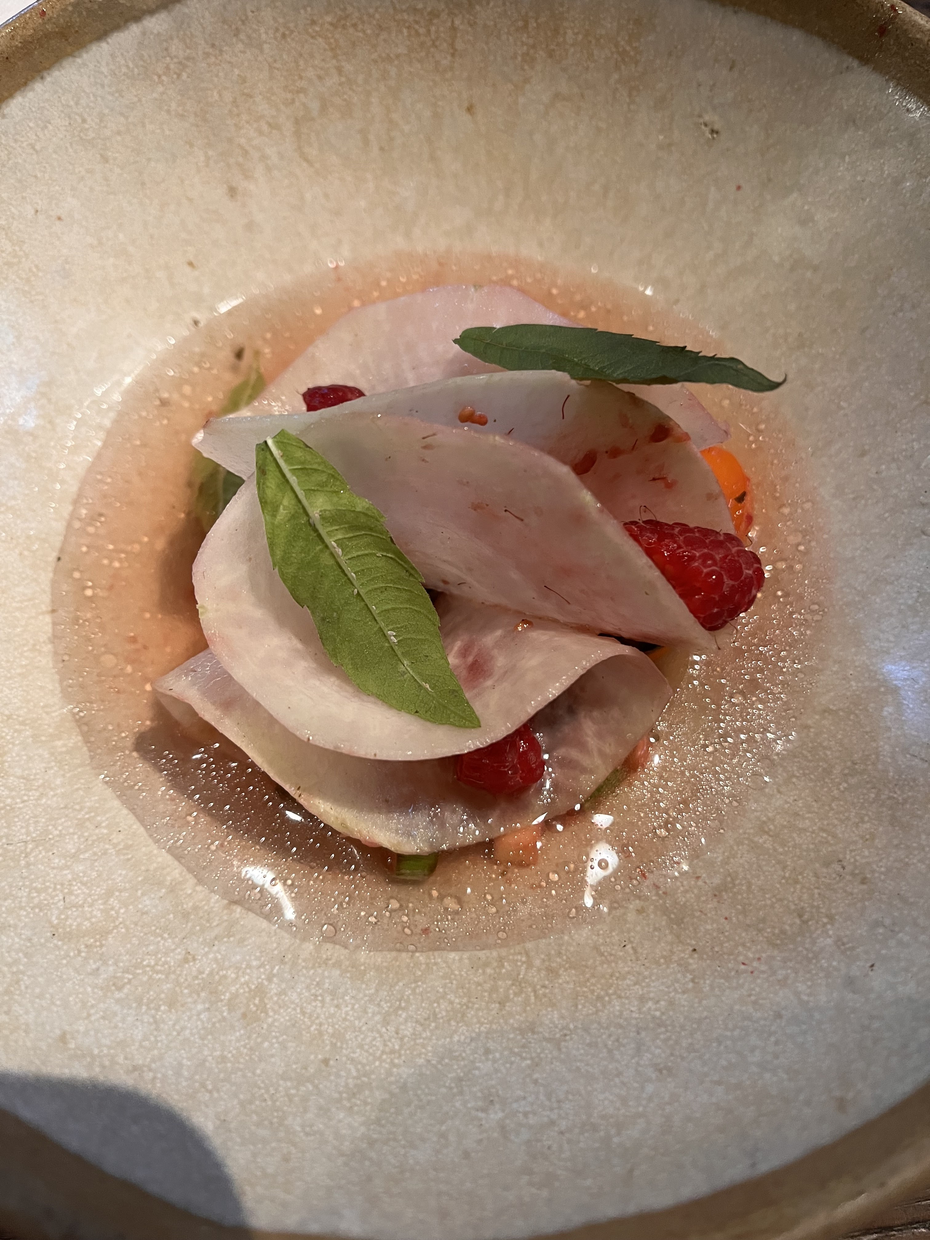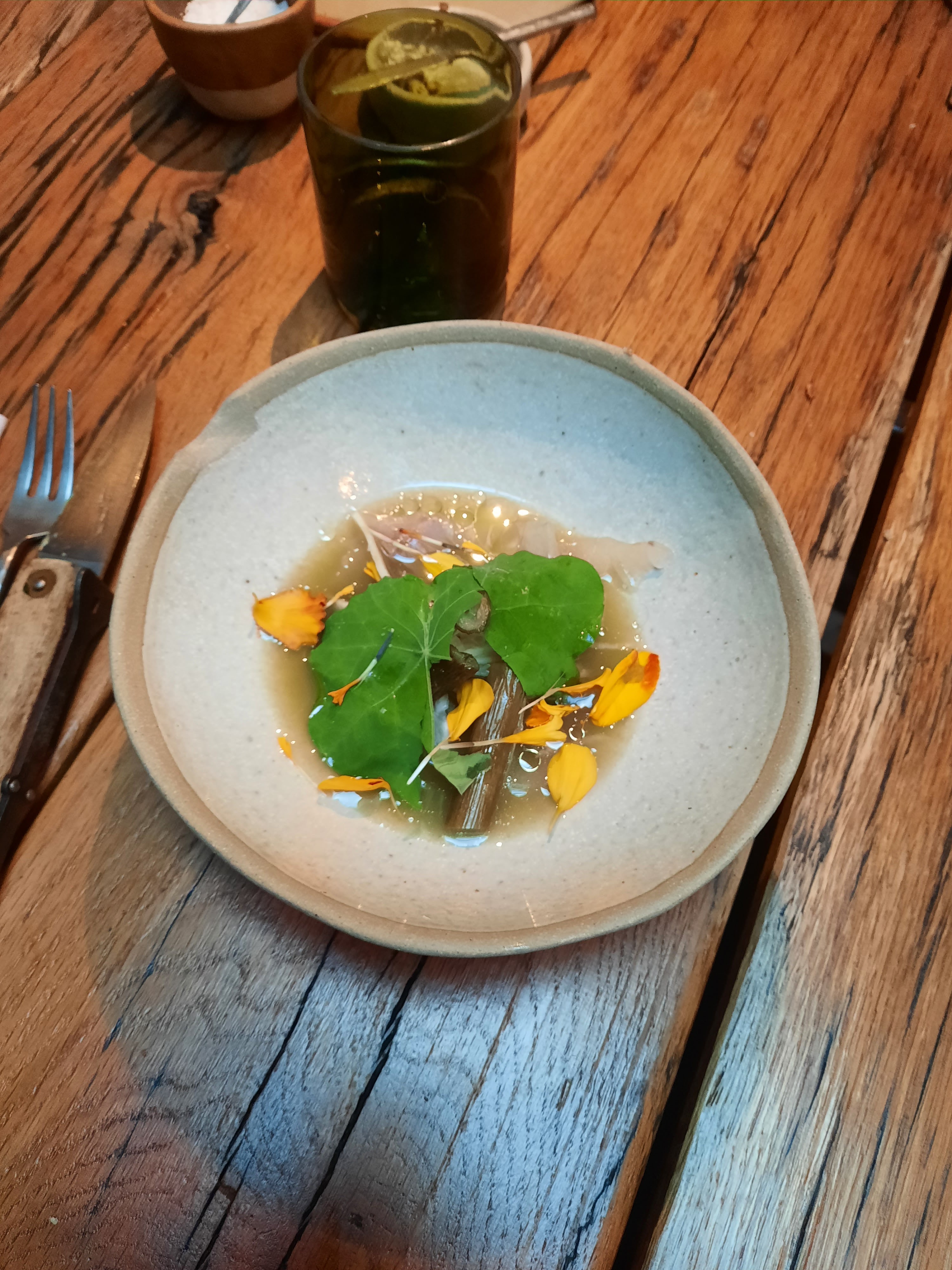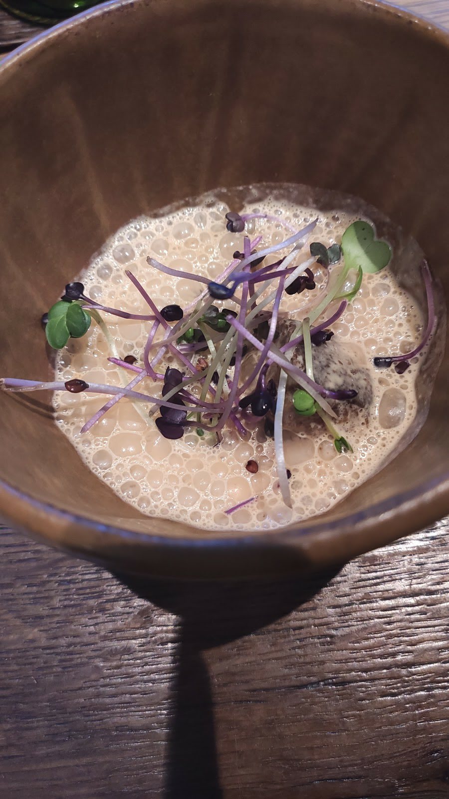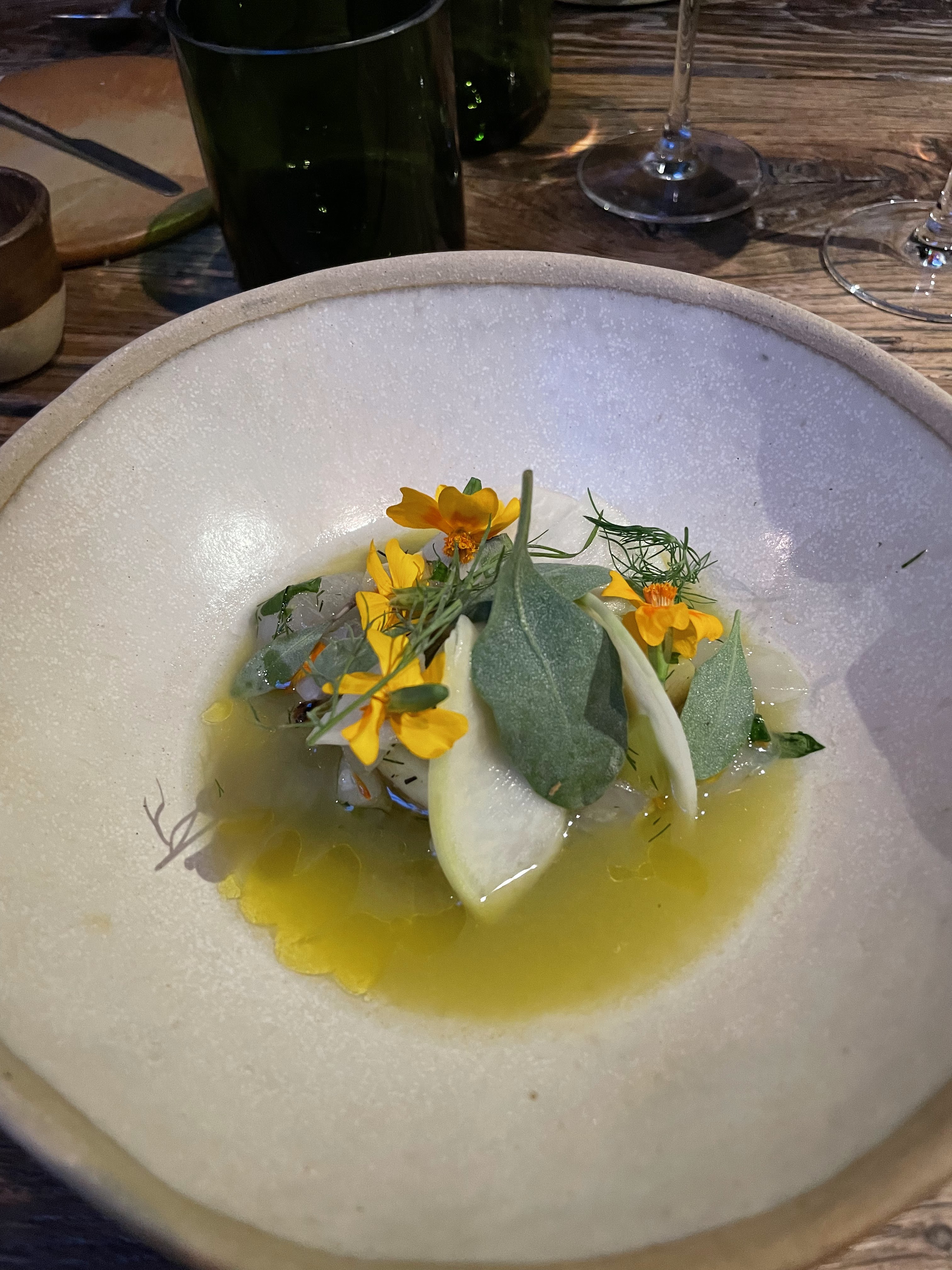 Où commencer? Le restaurant a une atmosphère de cantine, c'est essentiellement une grange avec un toit fait à la main. Pas ma préférence, mais pas ma plus grande irritation. Nous avons payé 180 € pour un menu dégustation à l'aveugle, ce qui était horrible. Beaucoup de poisson, de petites portions et des combinaisons étranges. Gingembre au maquereau. Tout le concept était vague. L'ordre des plats ne correspondait pas. Je suis désolé, mais en tant que connaisseur, la nourriture était bien en deçà des attentes. J'ai mangé deux portions pathétiques de fromage qui avaient le goût d'une diarrhée! Qu'est-ce que c'est que ça?! J'ai entendu plus de visiteurs se plaindre du goût fort. Jamais de ma vie je n'ai goûté quelque chose comme ça, c'est une insulte. Le vin sentait et avait le goût d'une vieille chaussette. Le chef est censé être une sorte de célébrité, mais à en juger par son menu, il ressemble plus à un candidat rejeté de Masterchef. Nous sommes profondément déçus. Le restaurant est un battage médiatique et n'a rien à voir avec un chef-d'œuvre culinaire. Je veux mon temps et mon argent !