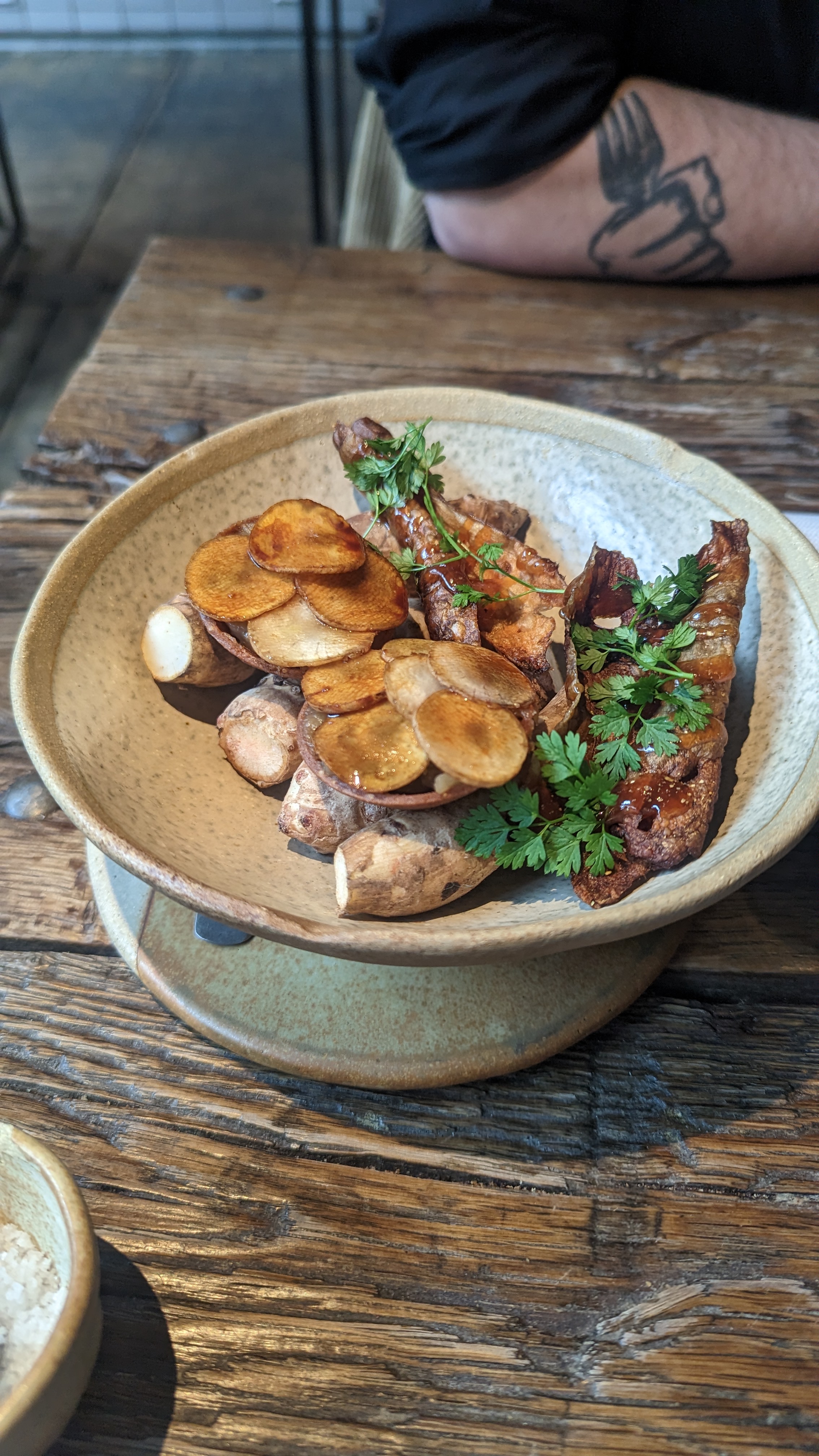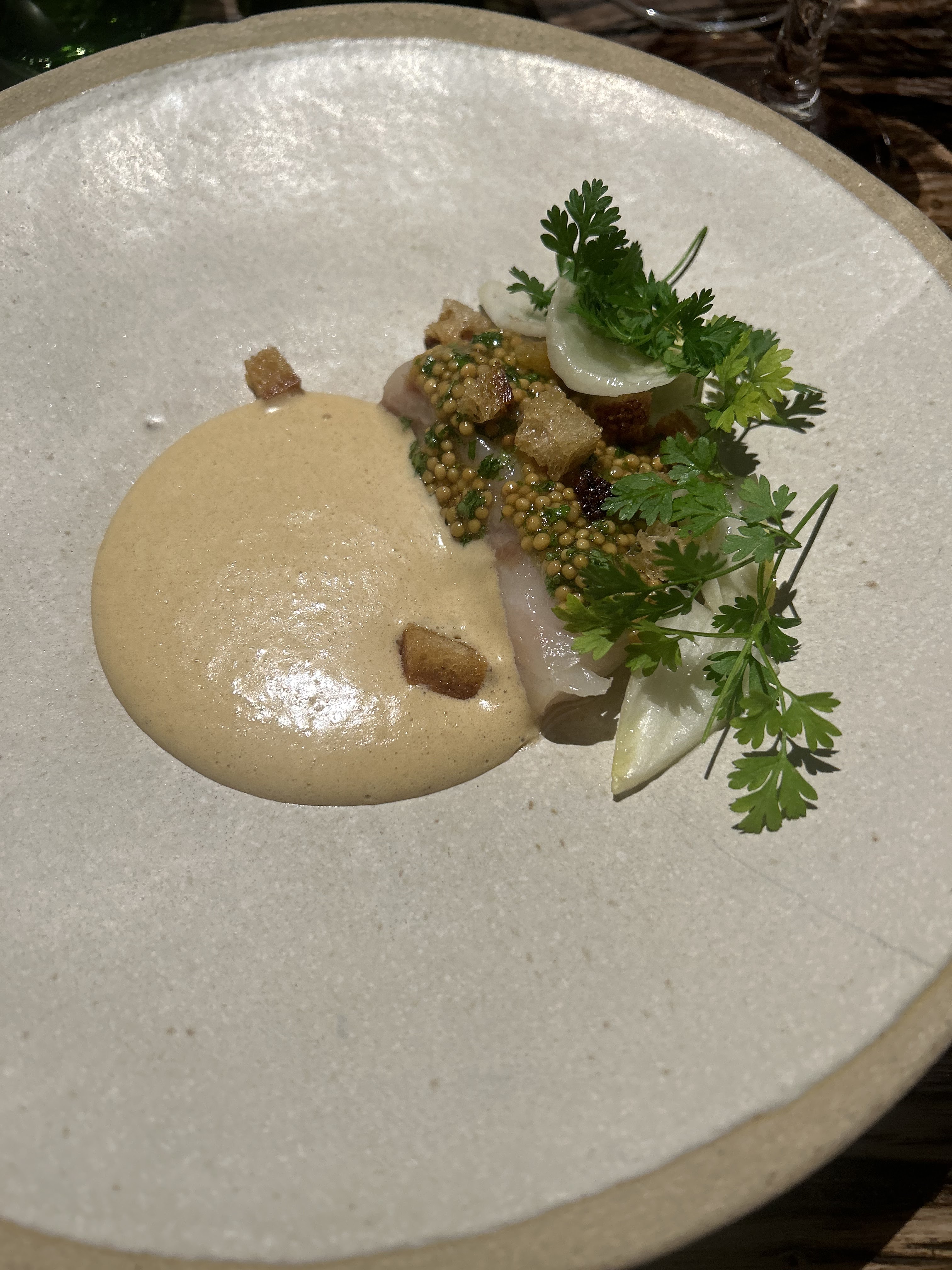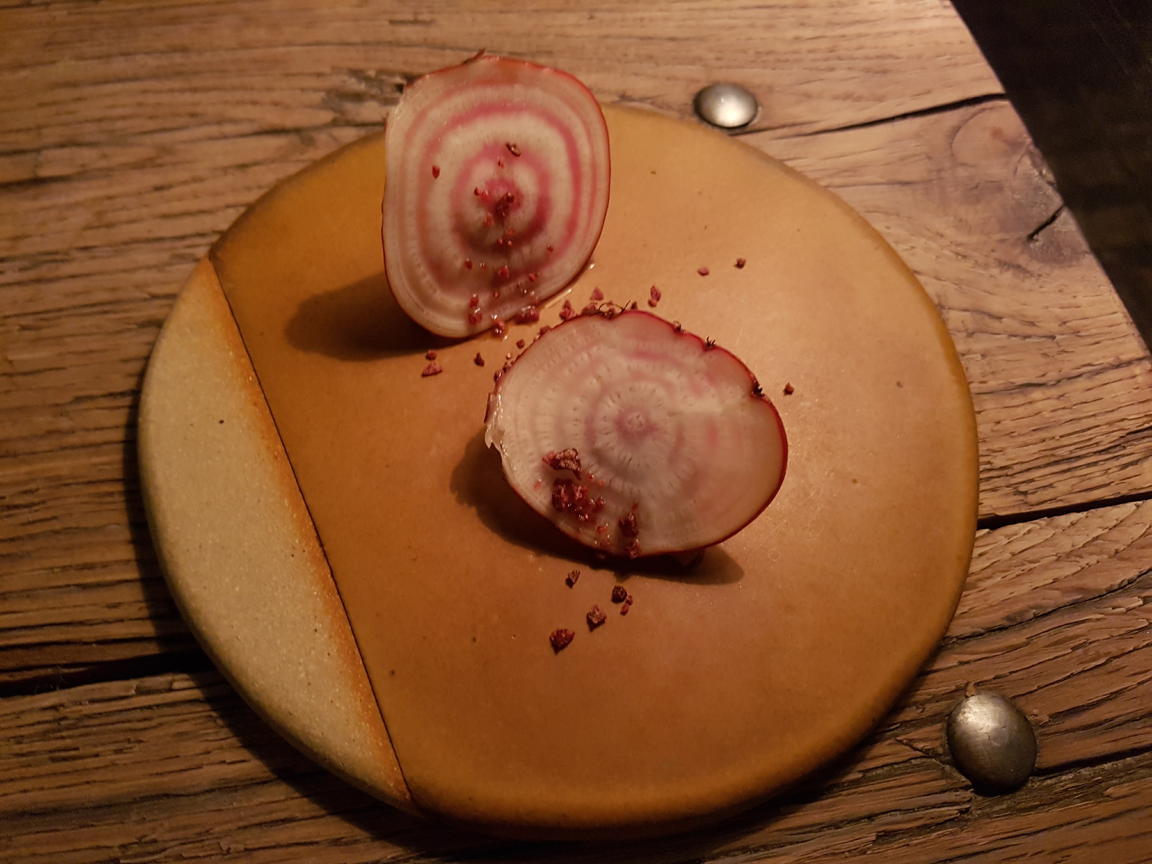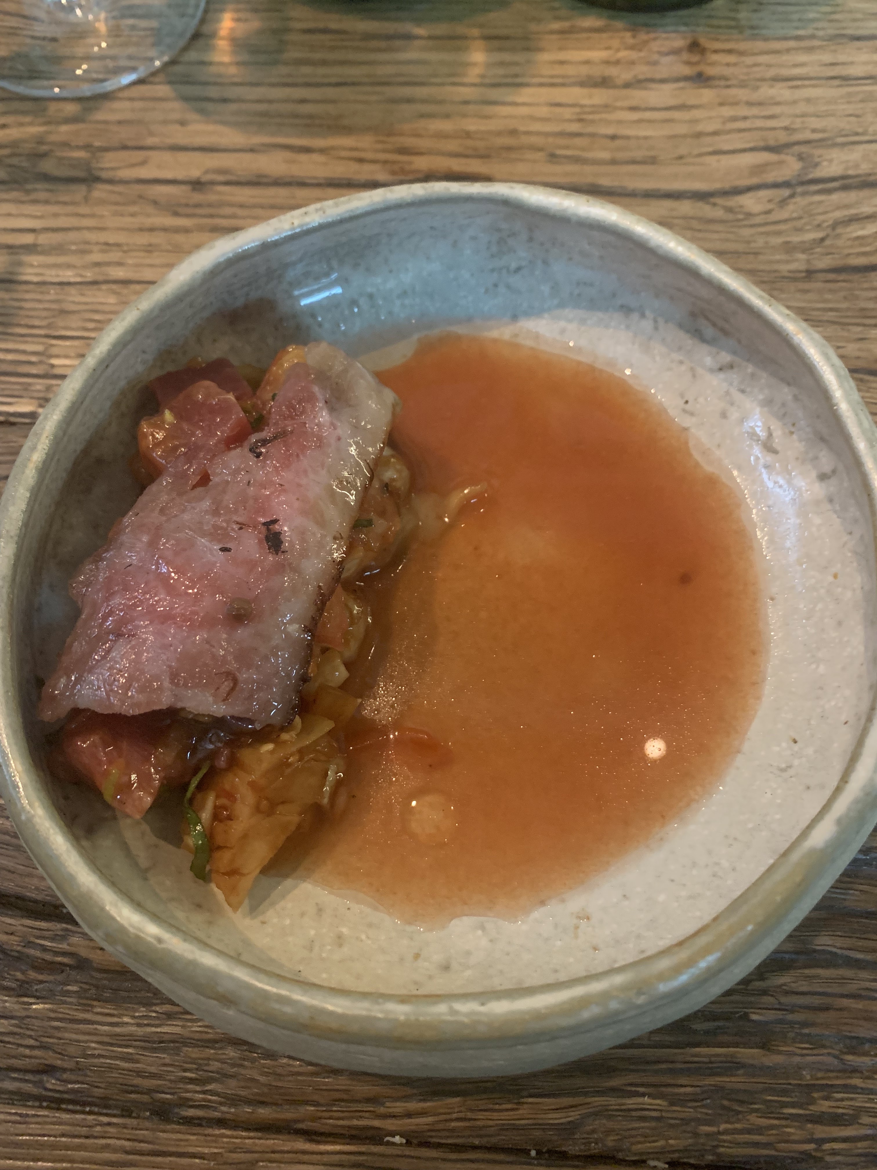 Où commencer? Le restaurant a une atmosphère de cantine, c'est essentiellement une grange avec un toit fait à la main. Pas ma préférence, mais pas ma plus grande irritation. Nous avons payé 180 € pour un menu dégustation à l'aveugle, ce qui était horrible. Beaucoup de poisson, de petites portions et des combinaisons étranges. Gingembre au maquereau. Tout le concept était vague. L'ordre des plats ne correspondait pas. Je suis désolé, mais en tant que connaisseur, la nourriture était bien en deçà des attentes. J'ai mangé deux portions pathétiques de fromage qui avaient le goût d'une diarrhée! Qu'est-ce que c'est que ça?! J'ai entendu plus de visiteurs se plaindre du goût fort. Jamais de ma vie je n'ai goûté quelque chose comme ça, c'est une insulte. Le vin sentait et avait le goût d'une vieille chaussette. Le chef est censé être une sorte de célébrité, mais à en juger par son menu, il ressemble plus à un candidat rejeté de Masterchef. Nous sommes profondément déçus. Le restaurant est un battage médiatique et n'a rien à voir avec un chef-d'œuvre culinaire. Je veux mon temps et mon argent !