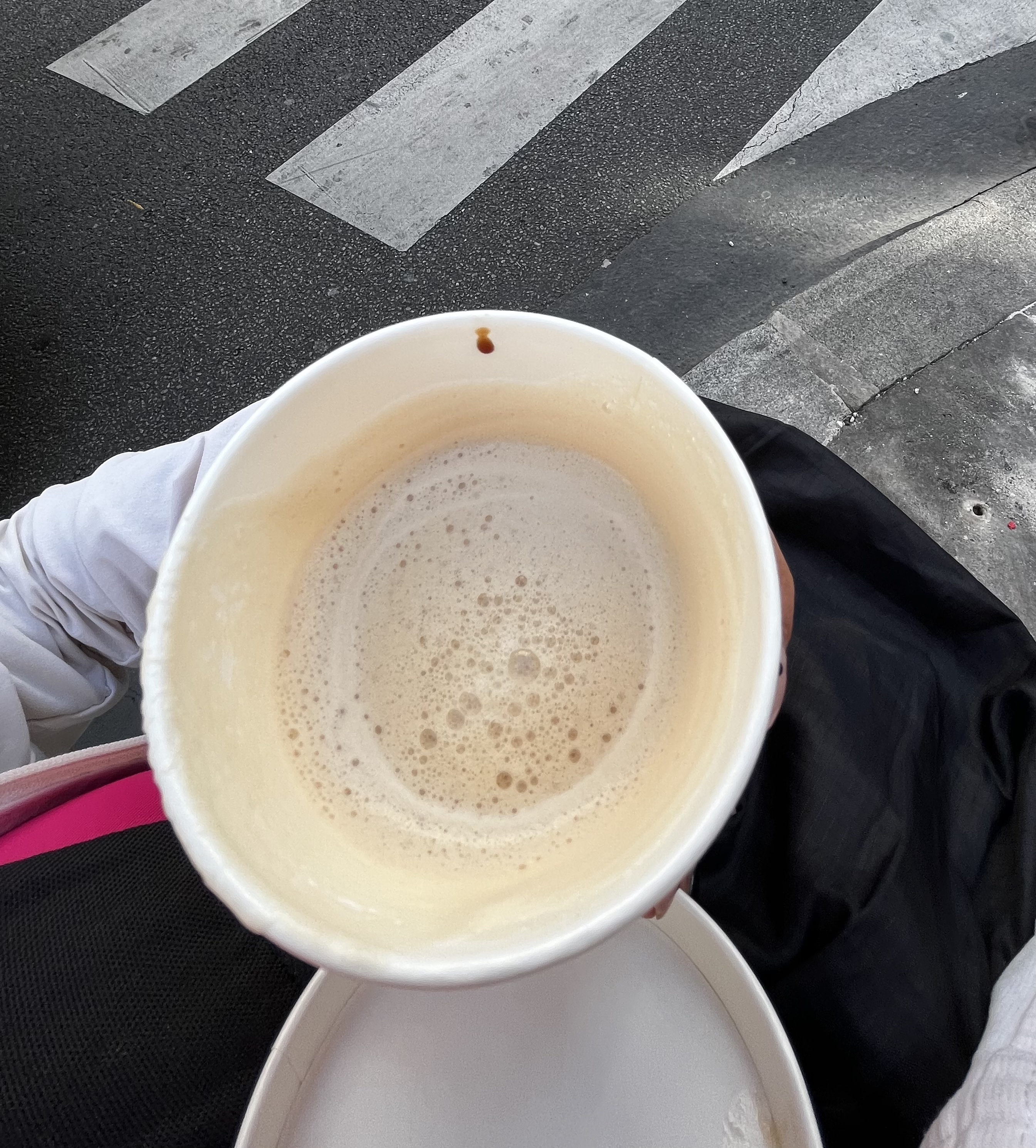 Je suis venu dans ce café avec de grandes attentes compte tenu des critiques élevées et j'ai malheureusement été déçu. Ils m'ont servi le pire café que j'ai eu à Paris. C'était censé être un latte à emporter, mais comme vous pouvez le voir sur la photo, il n'est pas différent d'un café sorti d'une machine et c'est aussi son goût. J'ai dû le jeter, oui, c'était si grave. De plus, à mon avis, l’endroit n’est pas du tout cosy donc je ne comprends pas les commentaires sur la super ambiance…