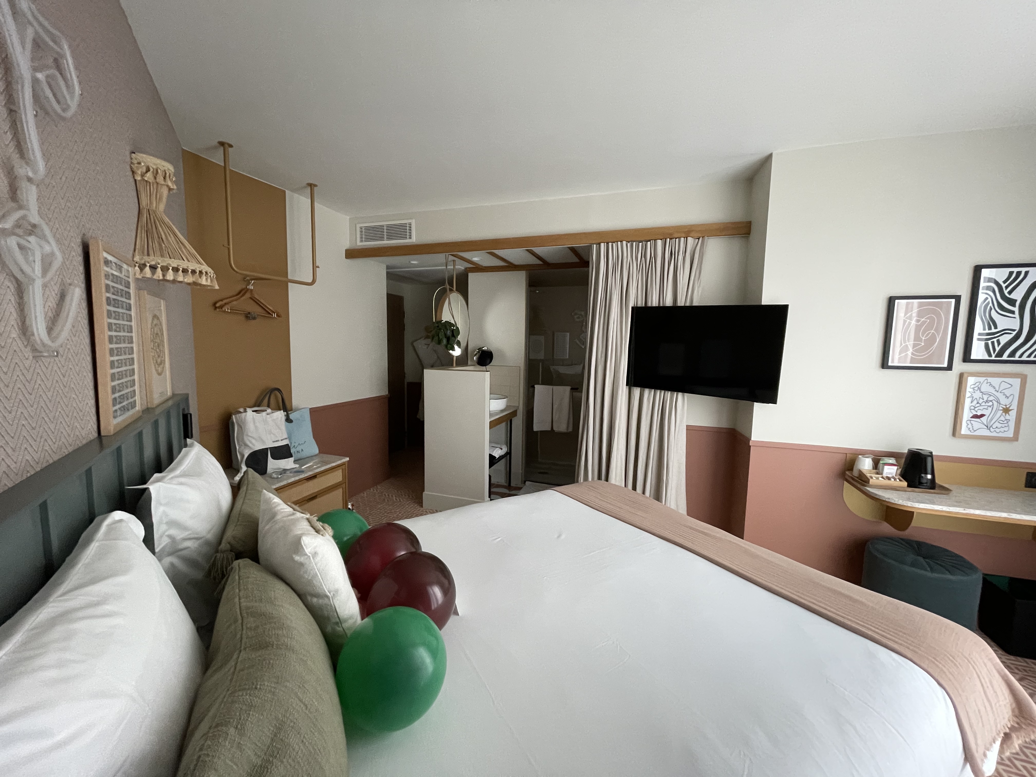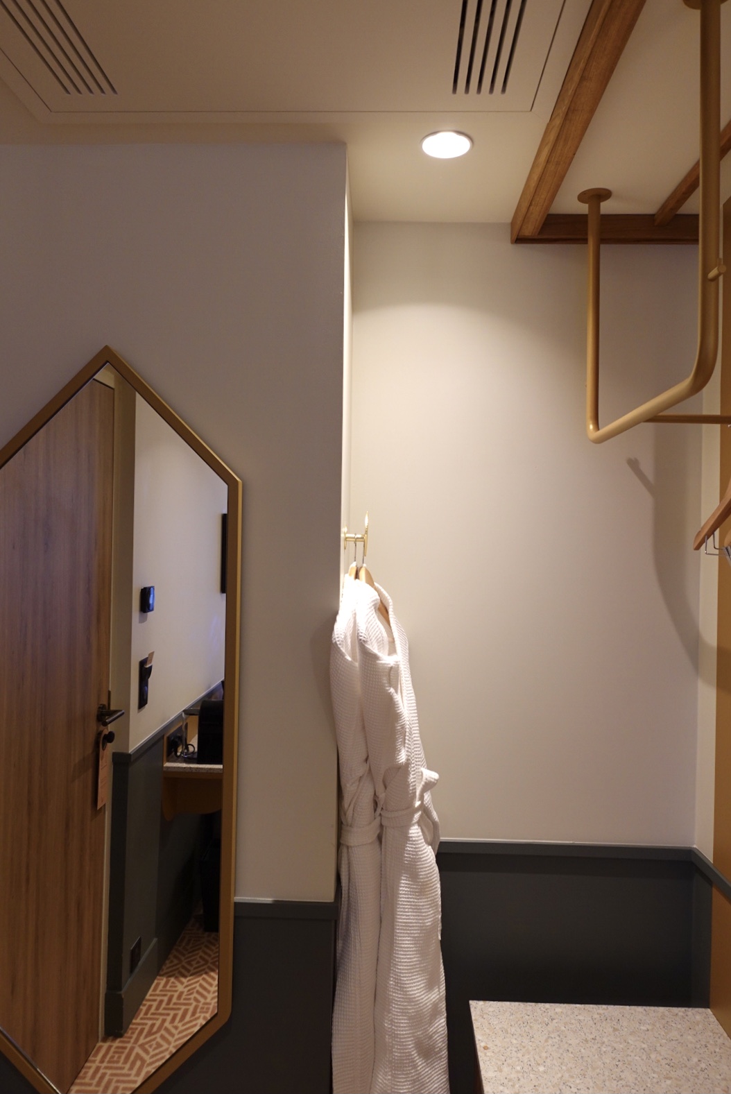 Les chambres ne sont pas grandes, il n'y a pas vraiment de table pour manger, ni de placard pour ranger vos vêtements ni de réfrigérateur pour conserver les boissons. Il n'y a pas non plus de machine à glace sur le sol pour obtenir de la glace pour les boissons. Ils fournissent un distributeur d'eau sur le sol pour les boissons froides et chaudes et les boissons pétillantes. Les chambres sont propres et l'hôtel est dans l'ensemble très propre et joli. Les oreillers sont horribles, car ils ressemblent davantage à des coussins carrés. La douche est inondée si vous augmentez l'eau car elle ne l'évacue pas assez rapidement. Le thermostat est difficile à utiliser, vous aurez besoin d'une application sur votre photo pour le synchroniser afin de mieux le contrôler. L'emplacement est un peu à pied de la gare et peut être difficile si vous avez beaucoup de bagages, et le quartier peut sembler dangereux pour se promener la nuit.