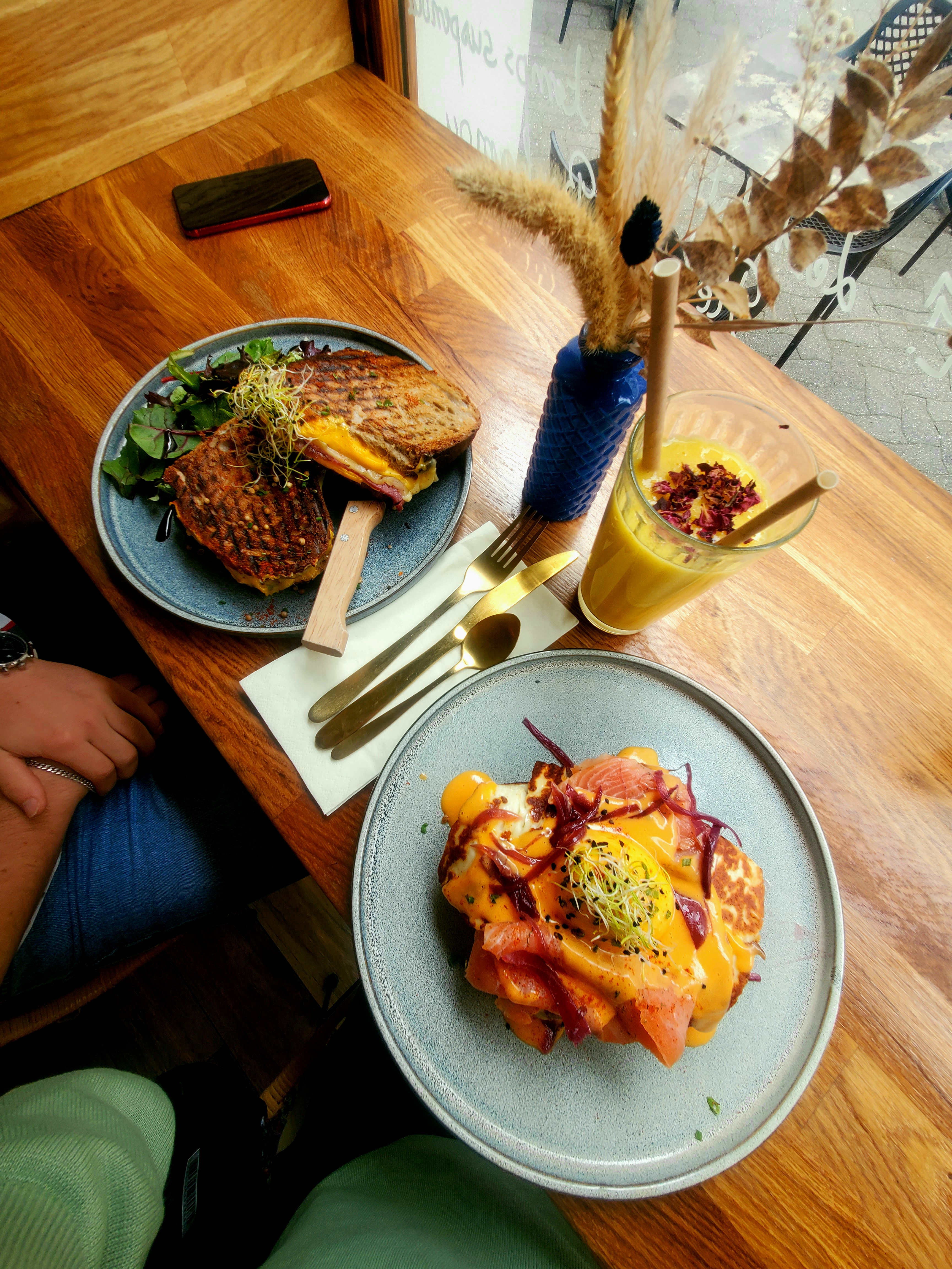 Personnel accueillant et service rapide. Les plats salés sont bons mais un peu légers, on avait encore faim après. Le burger, c'est juste un oeuf et de l'avocat, un peu déçue même si le goût est bon. Déco jolie mais ambiance peu chaleureuse, ça manque un peu de personnalisé.
