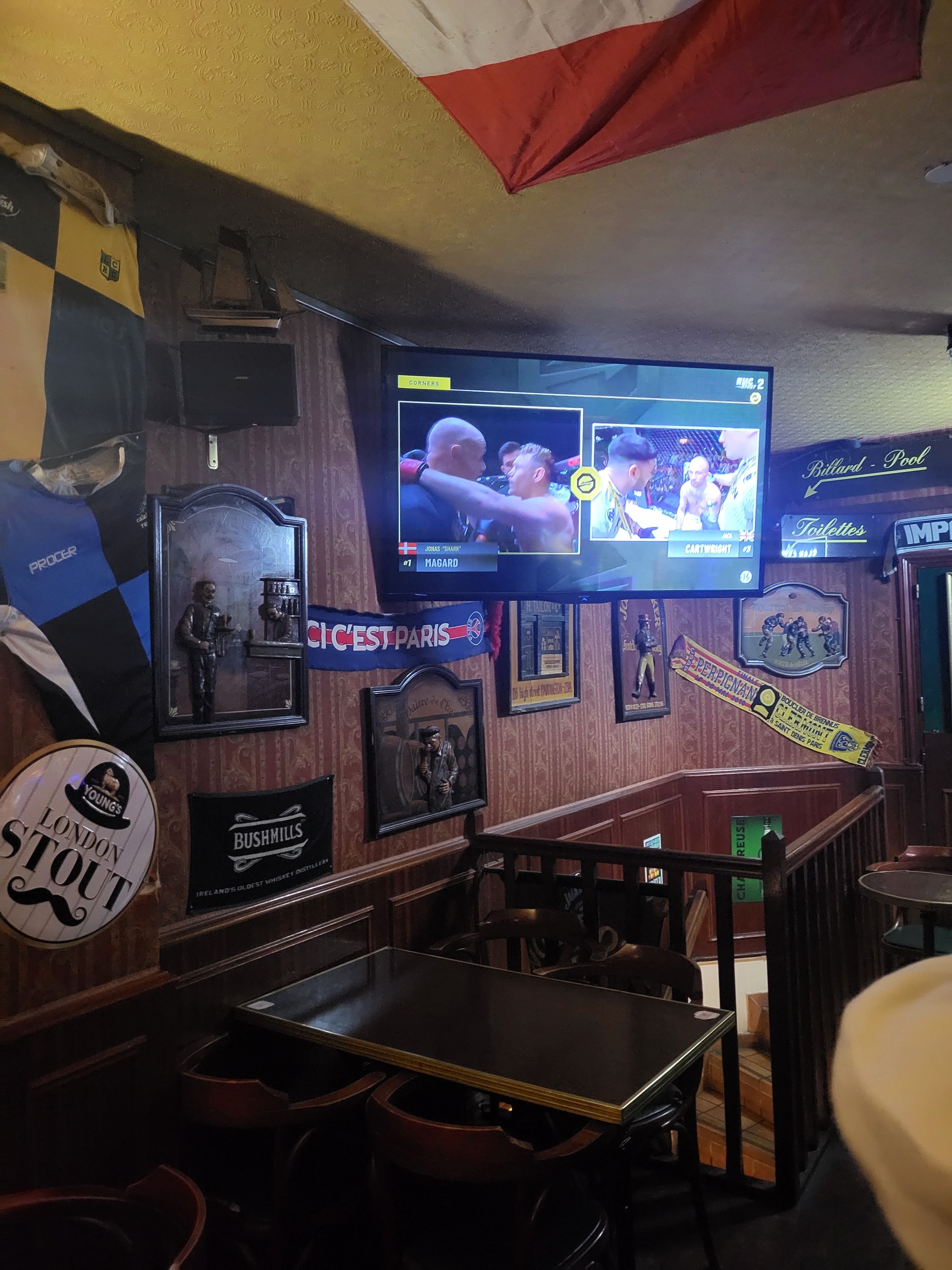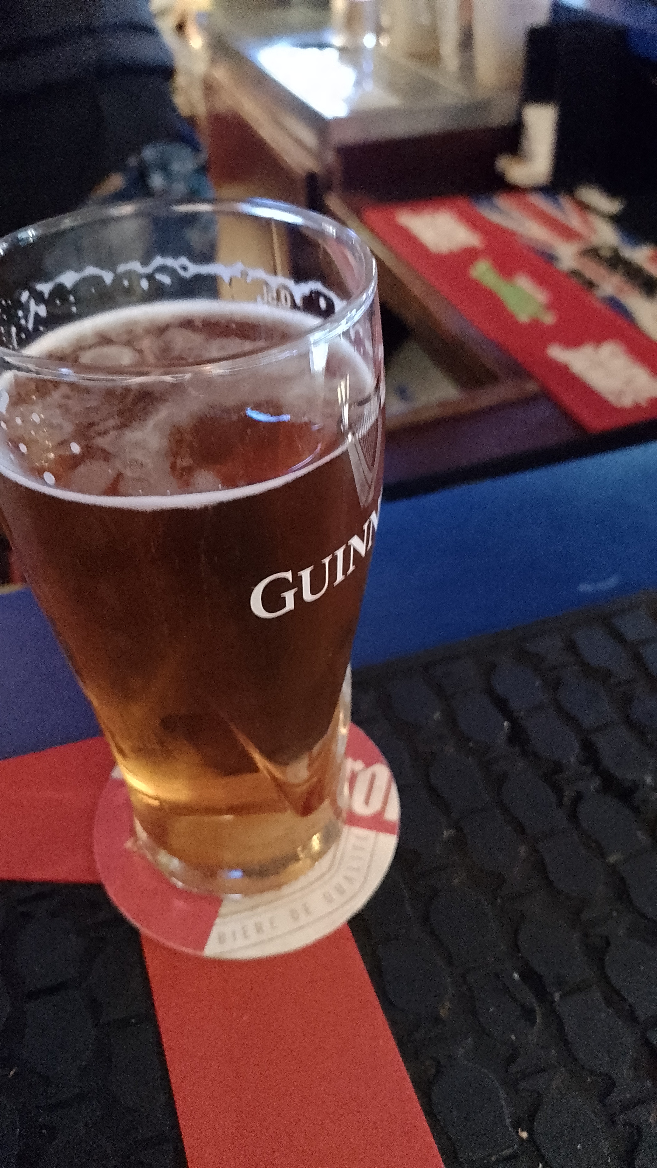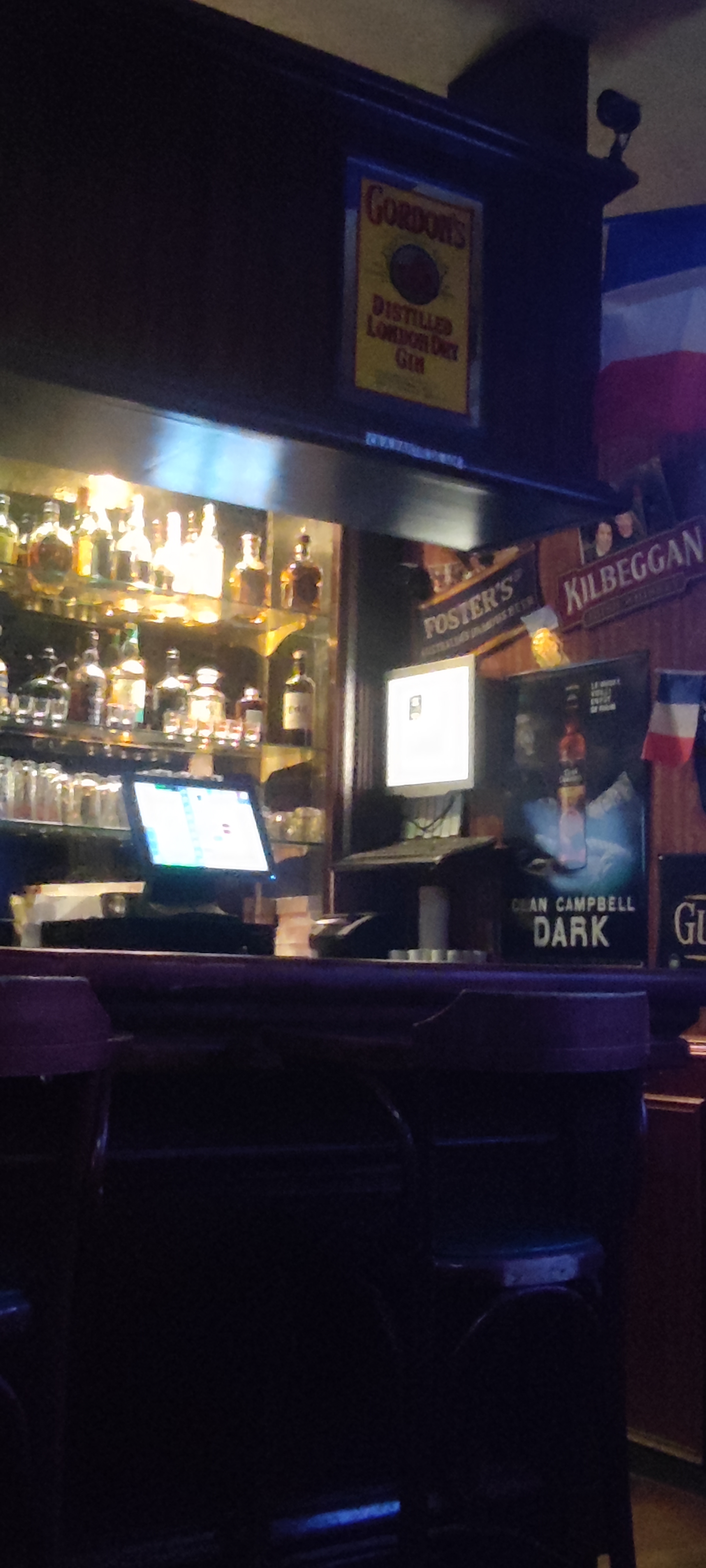 Ce n'est pas parce qu'un bar a des écrans géants que l'on peut le catégoriser dans la famille des pub. Pour preuve, il n'y a même pas de guinness pression... La musique anglaise ne résonne pas non plus dans les murs et l'ambiance chaleureuse des pub anglais n'y était pas... C'est plus un endroit cosy et tranquille frequenté par des habitués... Peut être par ce que nous étions un mardi. Il font en effet un happy hour de 19 à 20:30... Mais pour notre part, le serveur ne nous a pas précisé cela.. donc on a pris un demi au prix de la pinte de ce fait. Dernier point : ils n'acceptent pas la carte bleue en dessous de 10€.