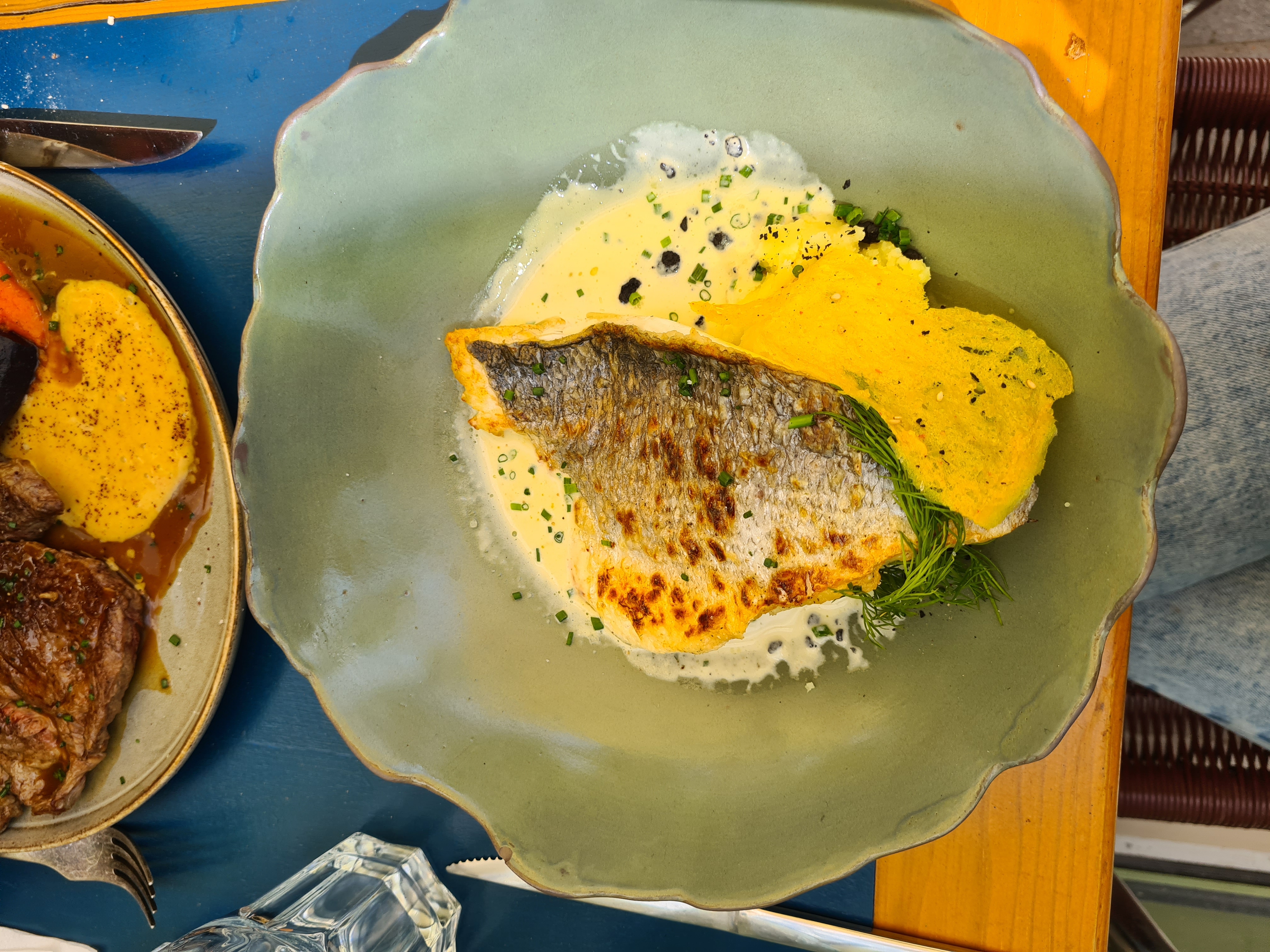 Agreable resto avec grande terrasse à l abris de la circulation. Le plat pêche du jour etait bon mais un peu juste en quantité. Service Ok