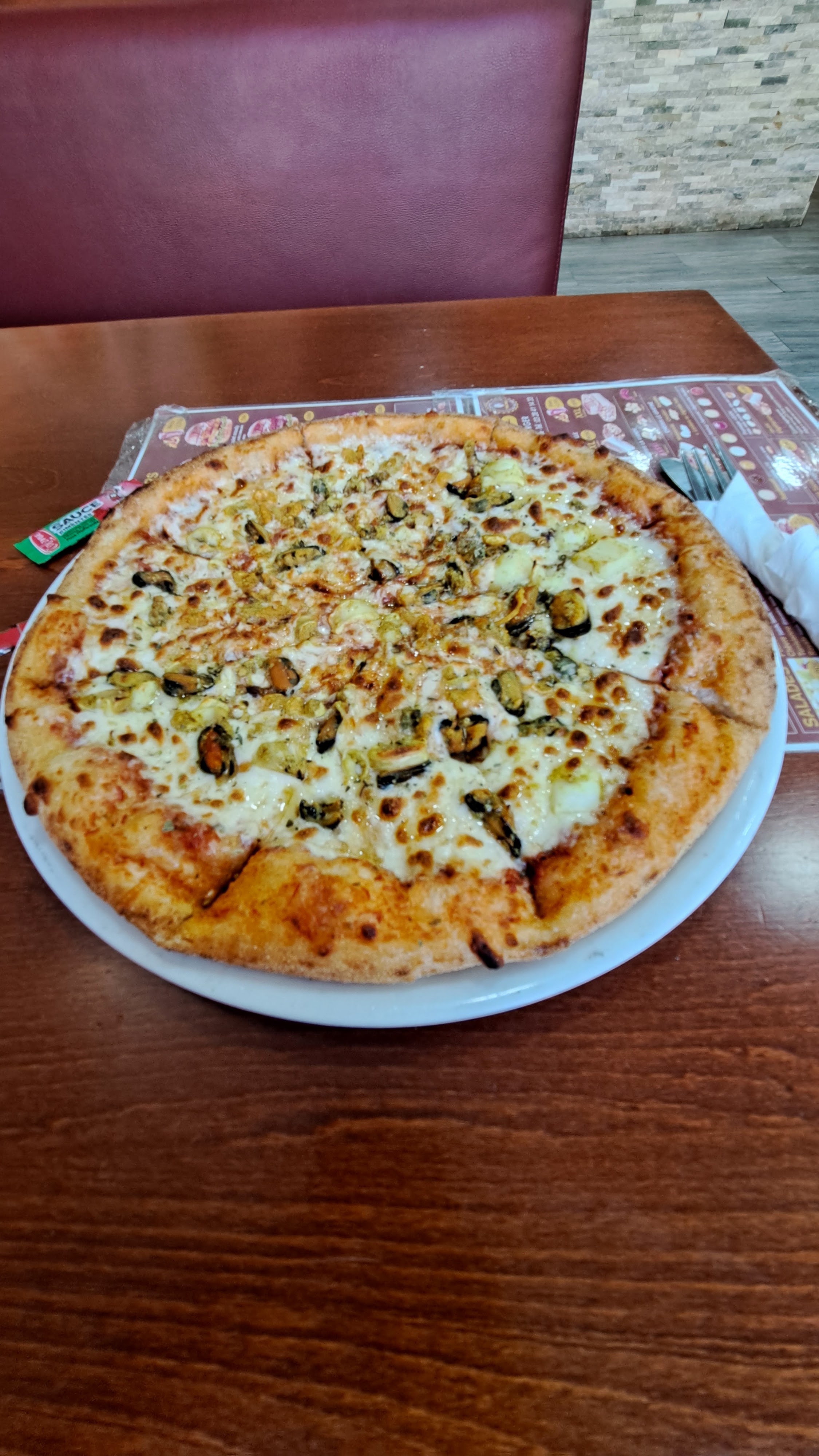 Appelé pendant mon séjour à Merville pour la nuit, bien sûr, la langue est un problème, merci le ciel pour Google Translate, j'ai eu ma pizza aux fruits de mer avec une tranche de gâteau à l'avoine et je dois dire que la pizza était incroyable, j'aurais pu en faire une plus petite mais les yeux étaient plus gros que le ventre. Je me suis assis pour manger, alors ils sont venus dans une assiette qu'ils ont chauffée car je mangeais lentement, la pizza est restée chaude tout au long et à part la garniture, il y avait du piment ajouté qui lui a donné un goût bien meilleur que d'autres que j'ai essayé, le chauffeur-livreur était là et dehors plusieurs fois, tellement occupé pendant un jeudi où vous réfléchissez et vous promenez, il y a quelques plats à emporter et quelques fourgons de restauration dans le centre-ville.