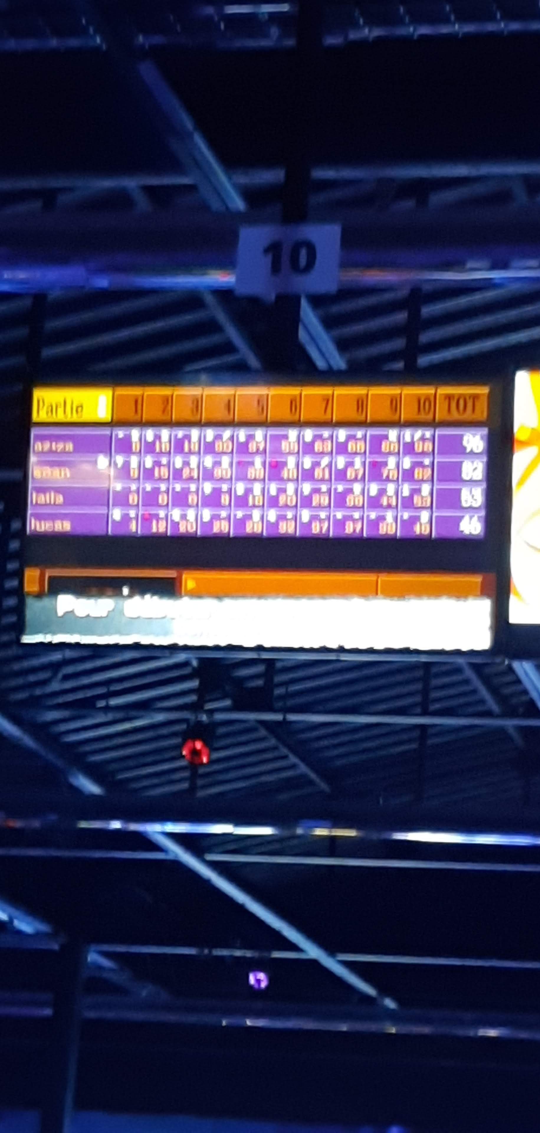 Bonne partie de bowling mais l'hôtesse du samedi n'avait pas l'air investi avec un côté jenonfoutiste. Nous a complètement oublié alors que je suis revenu la voir plusieurs pour la relancer. Heureusement son collègue dépassé par la situation au laser game était là.