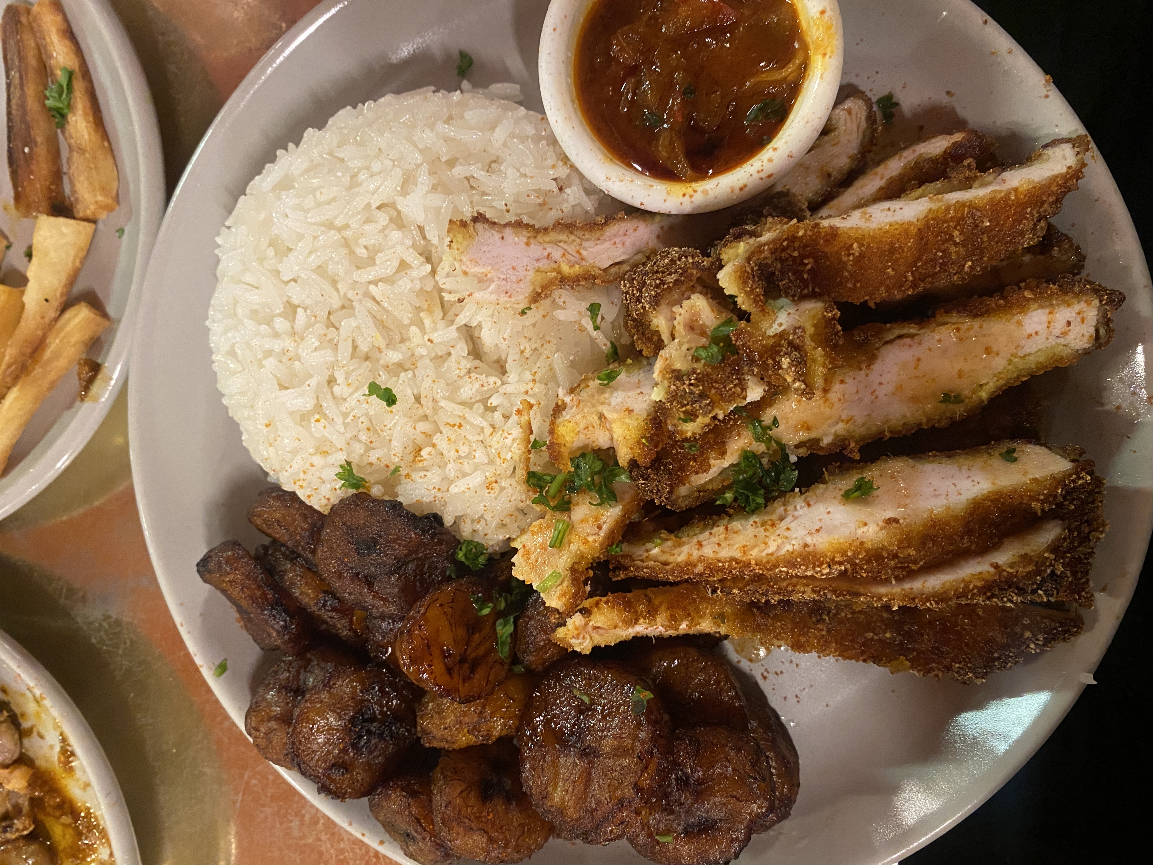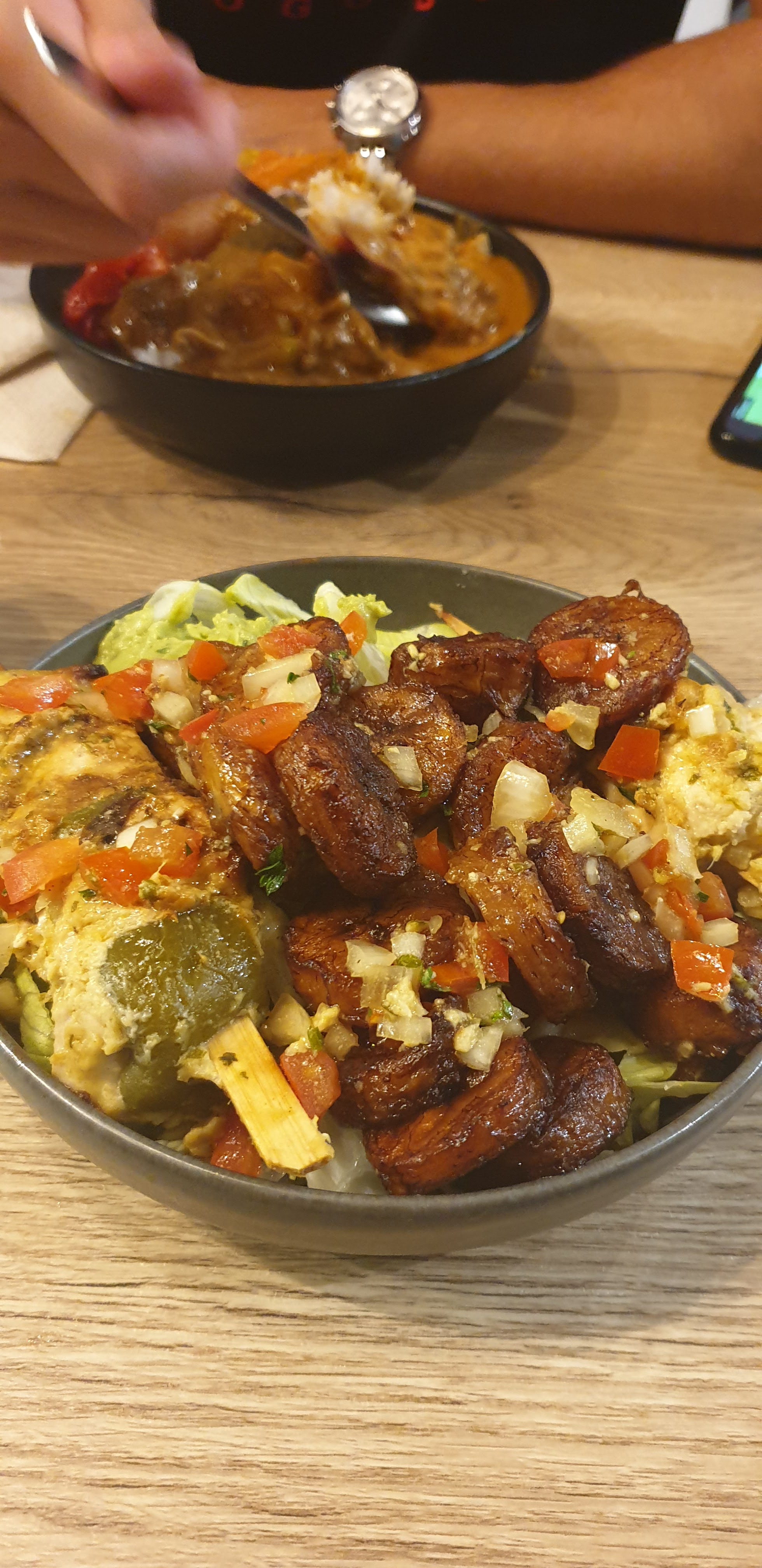 Plats très copieux. Un peu dommage pour les bananes plantains qui n’étaient pas assez cuits Les plats sont bons, peut être trop d’épices mais c’est un avis personnel bien évidemment Les pastels étaient délicieux par contre Une petite remarque, le service était un peu trop timide à notre goût