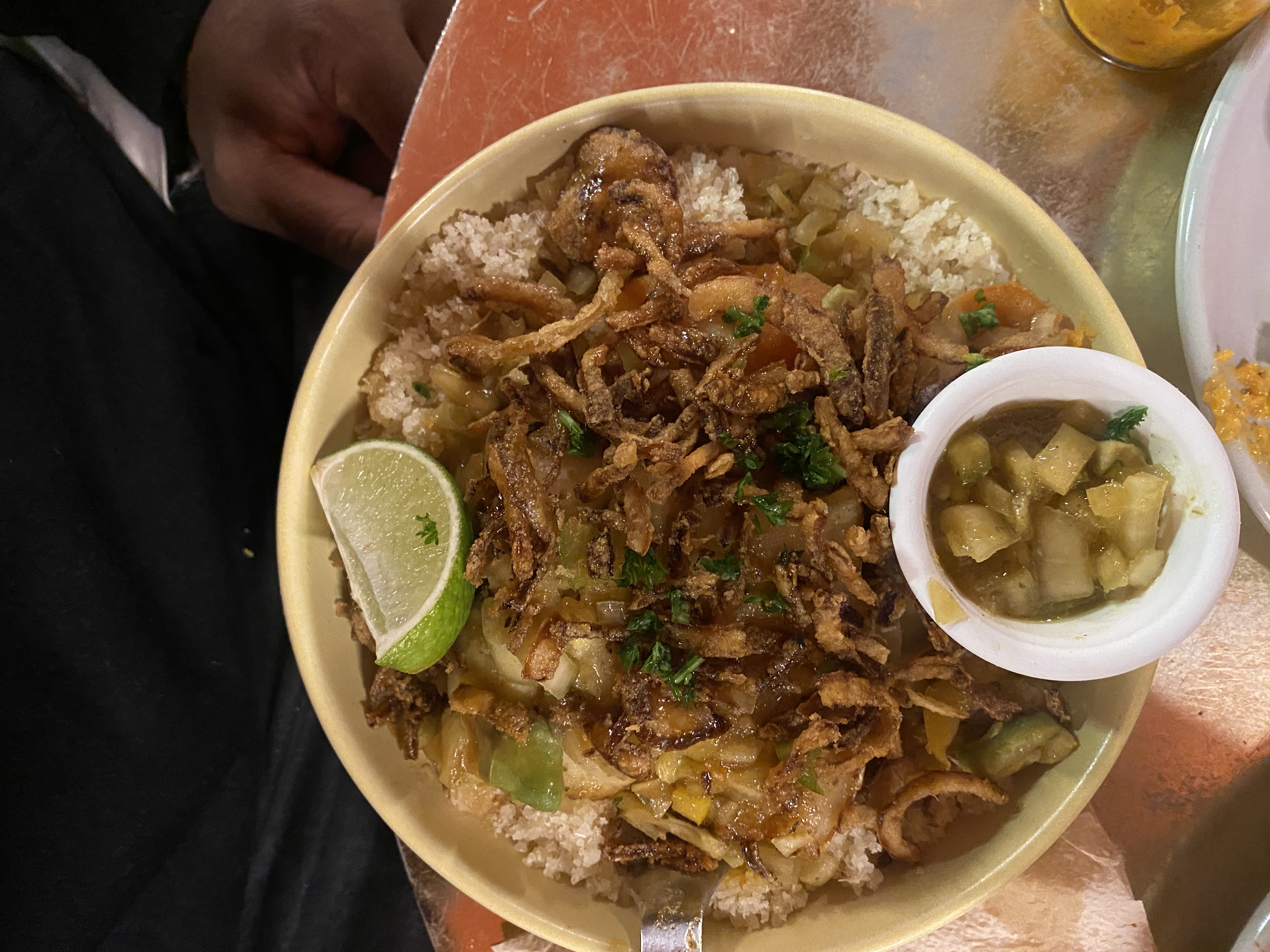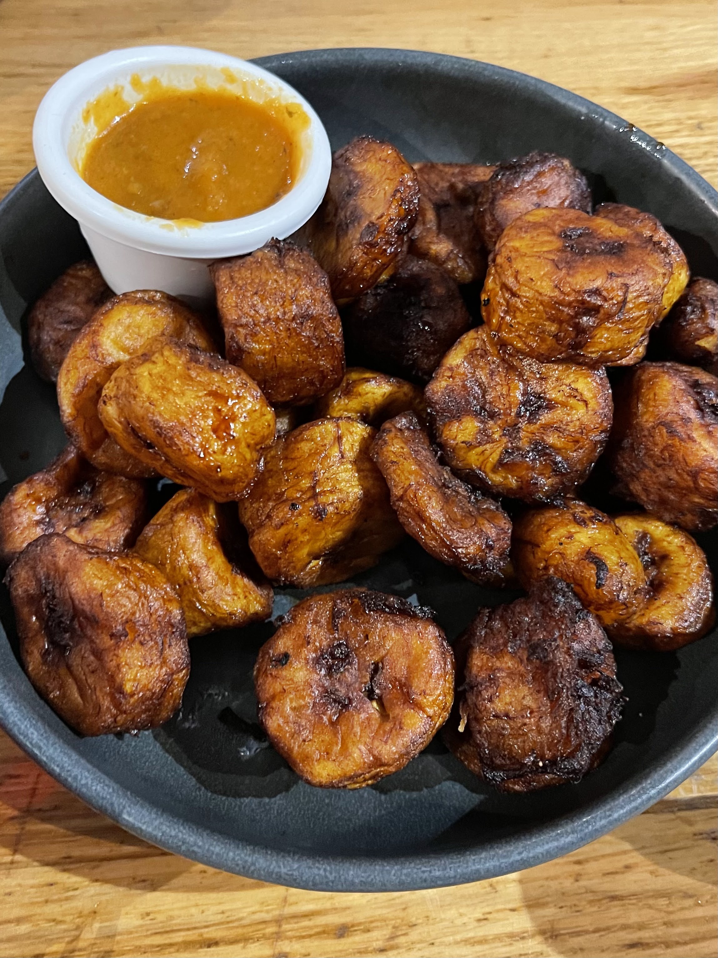 Plats très généreux, très bon rapport qualité prix. Les bananes plantains : un vrai régale ! Je recommande.