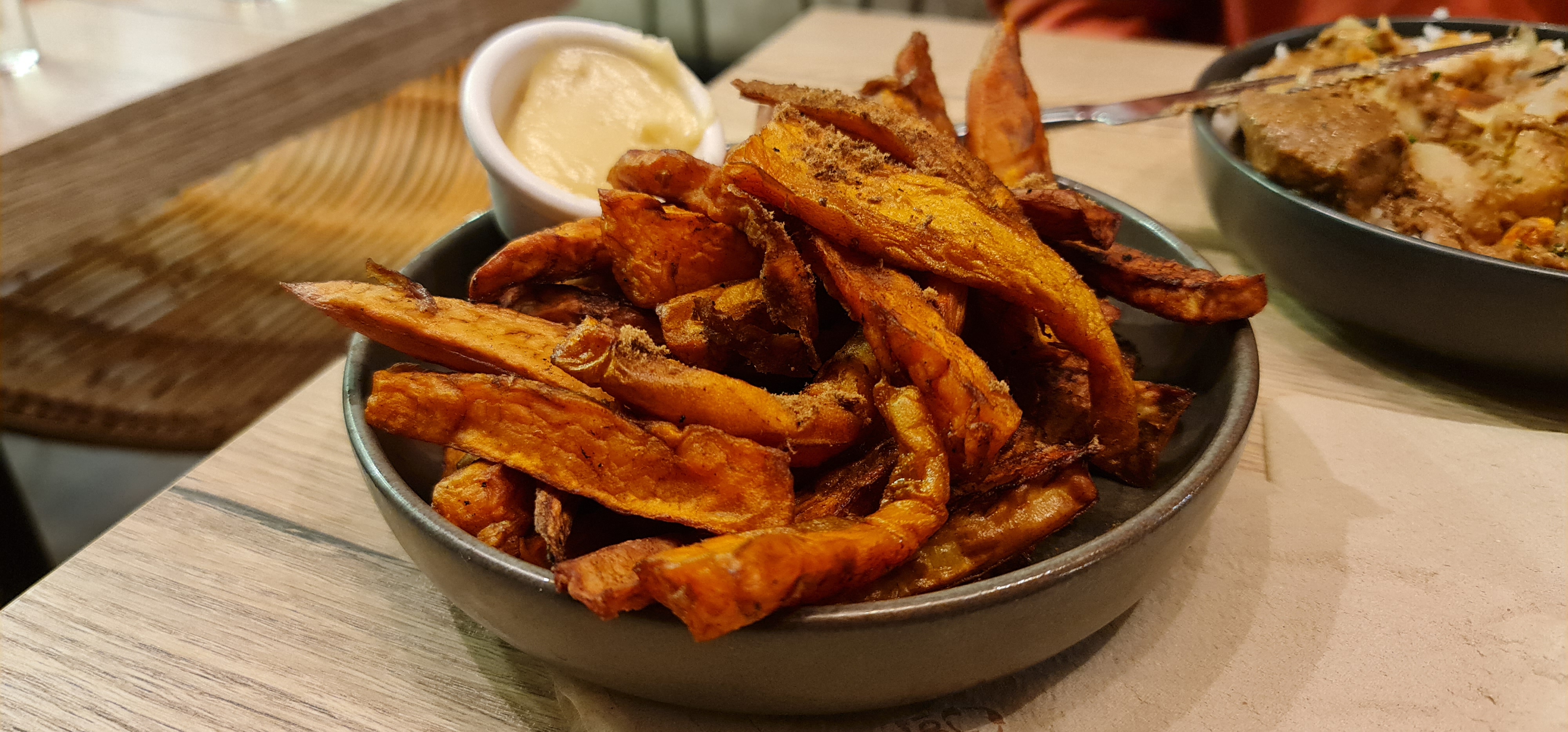 Je n'ai pas aimé mon repas dans ce restaurant : - Les frites de patates douces sont bonnes mais pas croustillantes - Les allocos : grosse déception !! Ils étaient durs, pas assez cuits... Je pense qu'on nous a servi les restes, car les allocos de la table d'à côté avaient l'air meilleurs (bien cuites, caramélisées) - Le mafé vegan manquait de goût, le riz était trop cuit, tout humide. - Le poulet du yassa manquait de saveur aussi. Seul le riz aux oignons était bon.