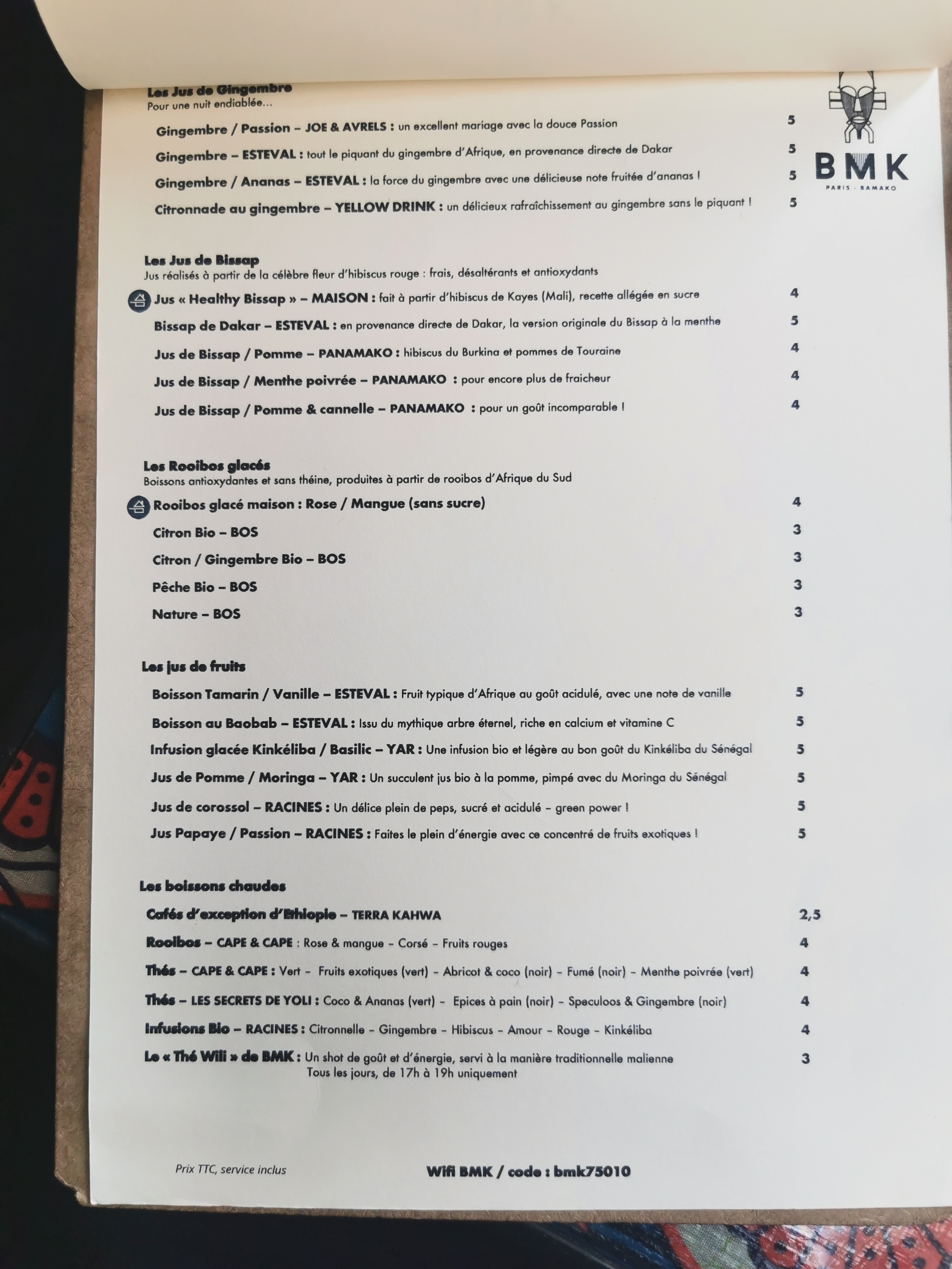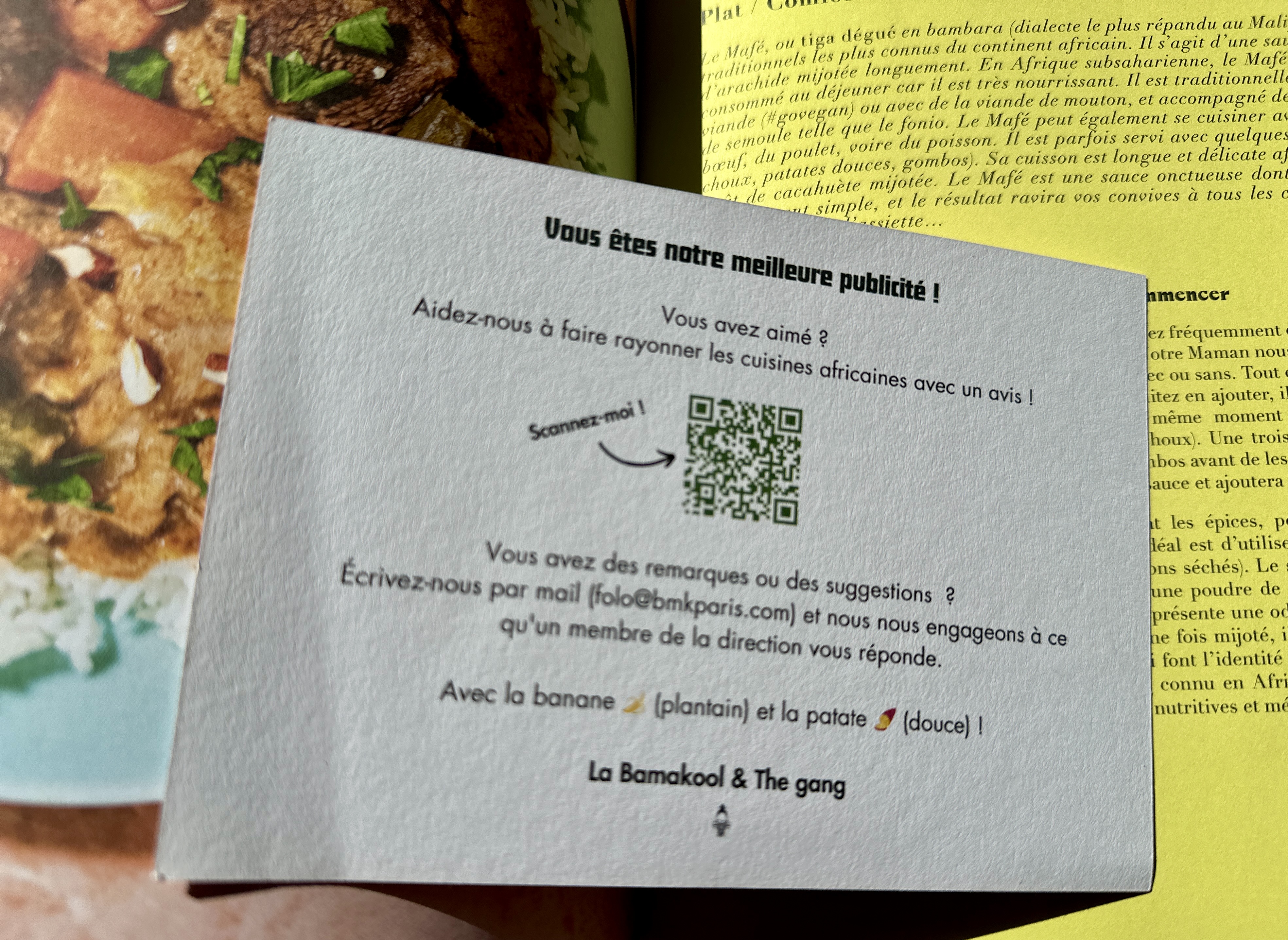 Mon fils et moi avons dégusté, en soirée, un délicieux mafé sénégalais à la sauce arachide, préparé à la manière de maman, chez BMK Paris Bamako, situé rue de la Fidélité dans le 10e arrondissement. Il n'était pas possible de réserver, mais vers 19 heures, il restait encore beaucoup de places dans cette petite cantine-restaurant ancrée dans les traditions culinaires issues de l'immigration d'Afrique de l'Ouest. Pour les boissons, nous avons choisi des jus de gingembre, nature et mangue. À noter : - L'alcool n'est pas servi. - Options « vegan » sur tous les plats. - BMK Paris Bamako abrite une petite boutique dans la cantine même, le long des murs. J'y ai acheté du piment jaune extra fort, qui accompagnait le mafé. - En 2020, BMK Paris Bamako a publié ses recettes chez Hachette dans un superbe livre illustré, disponible sur place pour 35 euros. Quel plaisir à l'idée de refaire bientôt le mafé de maman chez moi !