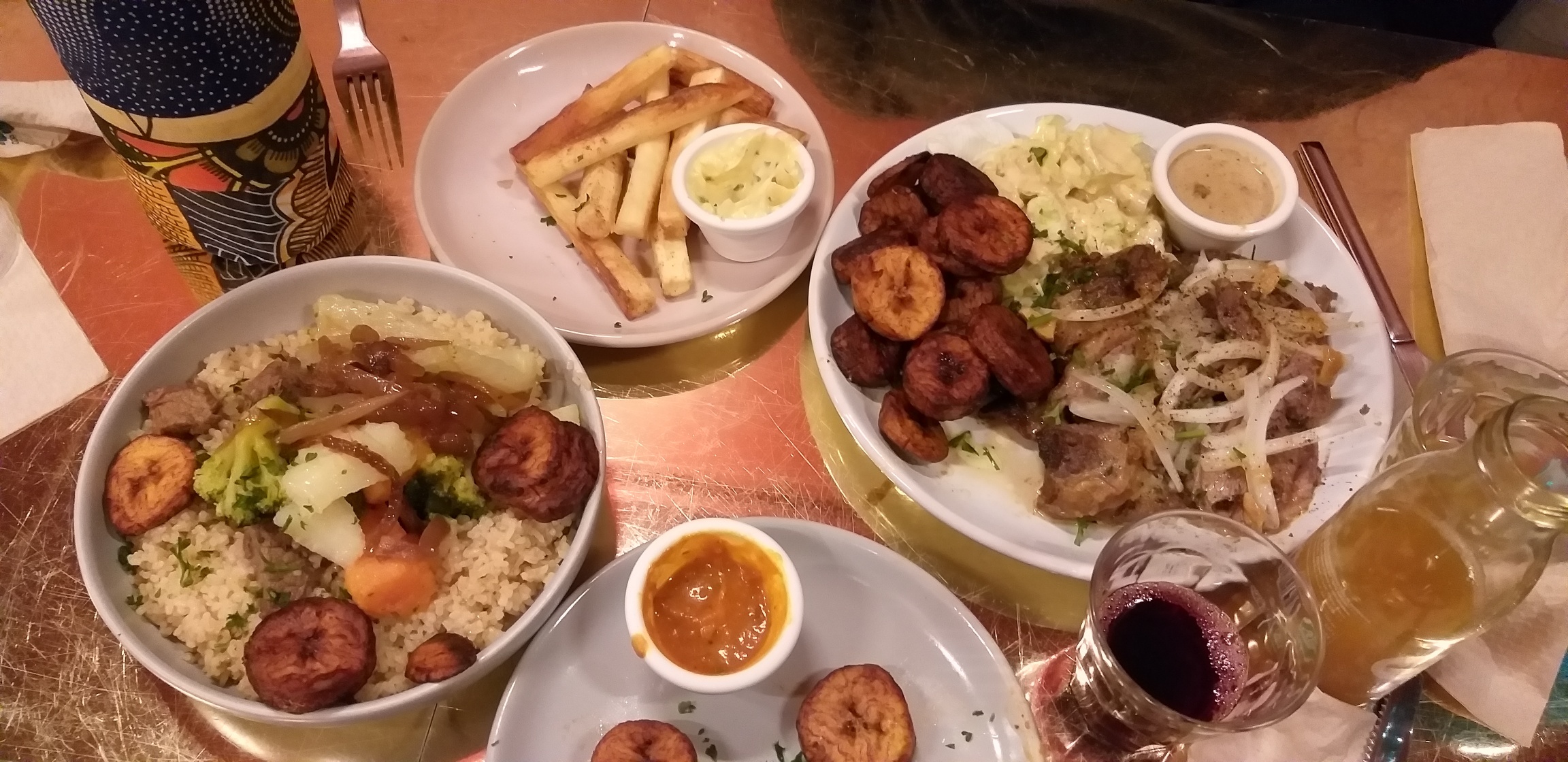Petit resto bien sympa, banane plantain en entrée avec très bonne sauce, mafé vegan avec bonne sauce mais qui manque d'une bonne dose de légume et trop de riz (dommage j ai oublié de dder la semoule de manioc au lieu du riz), et le moelleux afro choc à la farine de manioc était très bon.