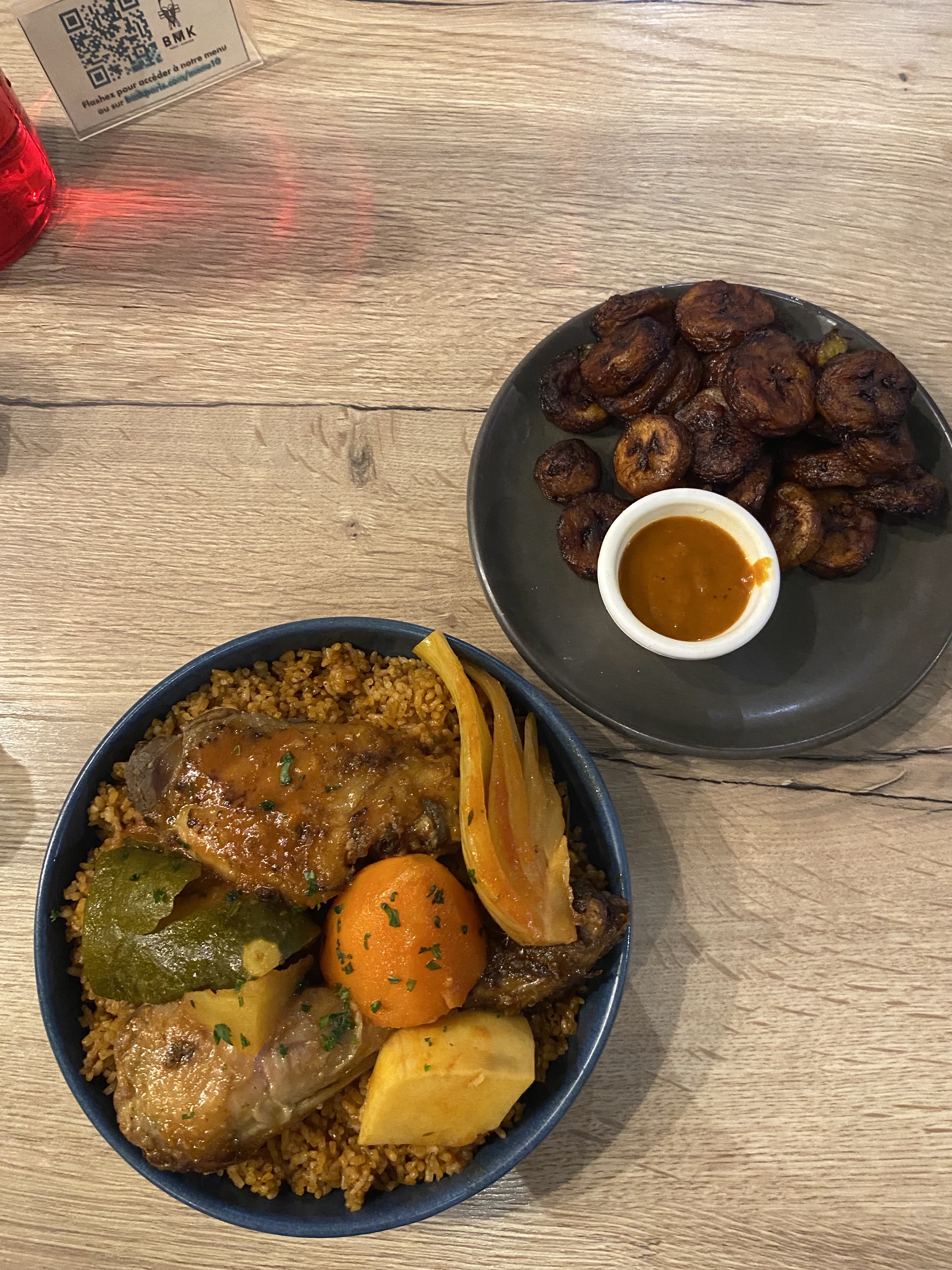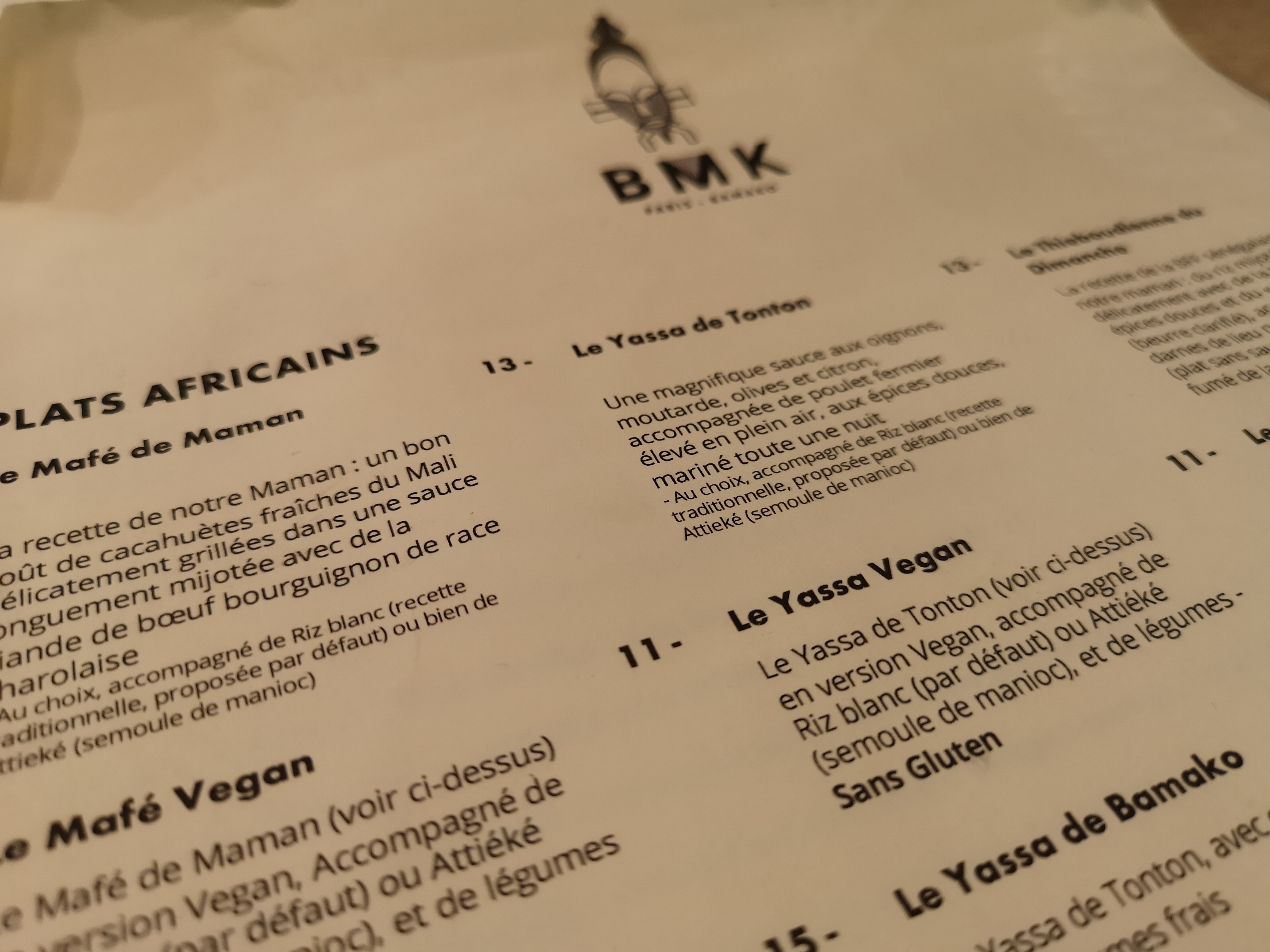 Belle adresse près de Gare de l’Est, vous fait voyager jusqu’au Mali le soleil et la chaleur en moins. Ses bons plats épicés (pas forcément piquants) sont riches en saveurs! La plupart des spécialités proposées sont communes à d’autres pays d’Afrique mais BMK a su les agrémenter de sa touche personnelle. Nous avons avons commandé: - Yassa de tonton (riz, poulet, sauce à base de moutarde, touche de citron et beaucoup d’oignons) - Thieb de Gao (riz cassé rouge, poisson ( du lieu)avec légumes, igname et patate douce) - Pastel (petits chaussons fourrés au boeuf, poulet ou au thon) - Mafé de maman (riz, sauce d’arachide et bœuf en morceaux) - Assiette « Bro from Luanda » (salade avec avocat et brochettes de poulet - Allocos (bananes plantains frites) La quantité de pastels était un peu petite à mon goût et le mafé pas suffisamment relevé néanmoins je recommande ce spot sans hésiter!